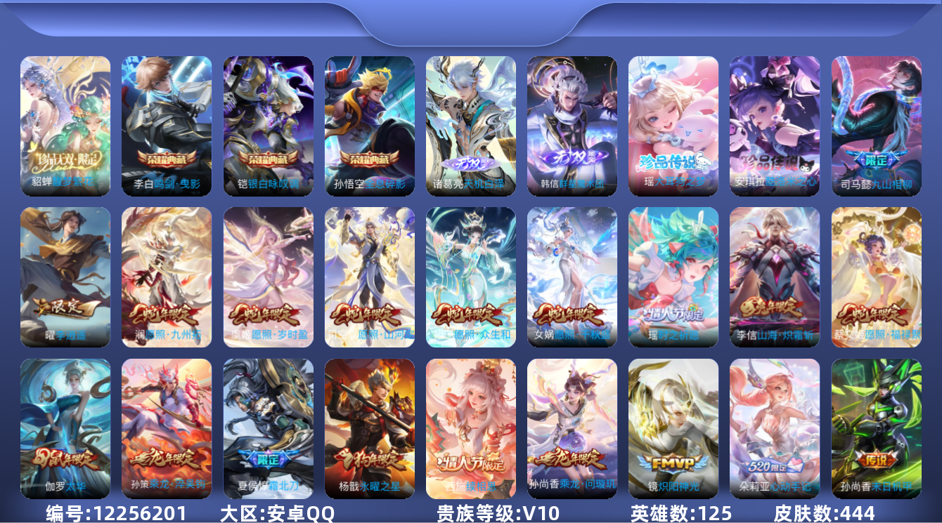[12256201]V10 3典藏 1珍品无双 2无双 2珍品传说 68传说 125英雄 444皮肤 可修改实名 优质装备:馥梦繁花,鸣剑·曳影,全息碎影(猴子典藏),银白咏叹调(倪克斯侍卫),韩信群星魔术团(韩信无双),天机白泽,酷洛米之心,大耳狗之梦,黄金射手座,云鹰飞将(小将军),绛天战甲(鸡嘴战神),猫影幻舞,久胜战神,炽阳神光,一念神魔,云霓雀翎,末日机甲-孙尚香(绿蚂蚱),地狱火,仲夏夜之梦(大飞蛾),零号·赤焰,音你心动-周瑜,胖达荣荣,李逍遥,乞巧织情,时之恋人-刘备(电焊工),游龙清影(小青龙),淬星耀世,超时空战士-狄仁杰,遇见胡旋,末日机甲-孙策,挚爱之约,挚爱花嫁,山海·炽霜斩(李信年限),炽翼辉光(娃娃菜牛角包),燃星之曲,画中仙,鹤羽星尊,妄想实况,遇见神鼓,艾琳觅芳踪,朵莉亚心动手记,玄雷天君,涂山容容 传说皮:乘龙·问璇玑(孙尚香年限),乘龙·铭钟鼎(赵云年限),乘龙·淬吴钩(孙策年限),貂蝉曦玄引,吕布曦玄引,典韦战鼓燎原,九山相柳,铠冥王哈迪斯,续相思,幻光神枪 珍宝阁皮:妄想食味,蔷薇恋人,女武神 限定皮:愿照·九州拓(澜年限),愿照·福禄聚(蔡文姬年限),愿照·岁时盈(虞姬年限),愿照·山河定(司空震年限),愿照·众生和(妲己年限),愿照·千秋盛(女娲年限),逐霄战戟,映山客,陌上桑,鸣野蒿,夏侯惇霜北刀,至尊宝,太华(伽罗年限),武陵仙君(小桃花),异界灵契(白毛香),傲雪梅枪,补天,白鹤梁神女,魔法小厨娘,神威(电光马子),飞衡(韩信年限),山海·碧波行(瑶年限),无限倾心-项羽,高山流水,诗剑行,无限倾心-虞姬,齐天大圣,五谷丰年,武圣,游园惊梦,龙胆,烈魂,天狼溯光者,李小龙,逐梦之影,永曜之星,辉光之辰,孙行者,猪悟能,青春决赛季,乒乒小将,匿光追影者,女儿国国王,寅虎·瑞焰(虎皮蛋子),时之祈愿-云中君,时之祈愿-瑶(瑶传限),百木心枪,玉兔公主,启示之音,无尽星芒,唐三藏,山海·玄木吟(马可年限) 史诗皮:赞萌露比,鸭鸭历险记-刘禅,器灵·浮梦炉,瑰影绮梦,化蝶舞,灵蛊蚀心,星界战将,谪仙醉月,龙之律动,小牛鸭,百相守梦-周瑜,戍鼓铭心,幻珠鲛人,怒海争锋,破空之剑,涂山红红,东方月初,埋骨钱,芈月浮光幕影,海诺心动手记,琥珀纪元伽罗,决胜骁骑,蔬乡物语(鲁班七号),百相守梦-百里守约,百相守梦-黄忠,织梦人,遇见神鹿,紫霞仙