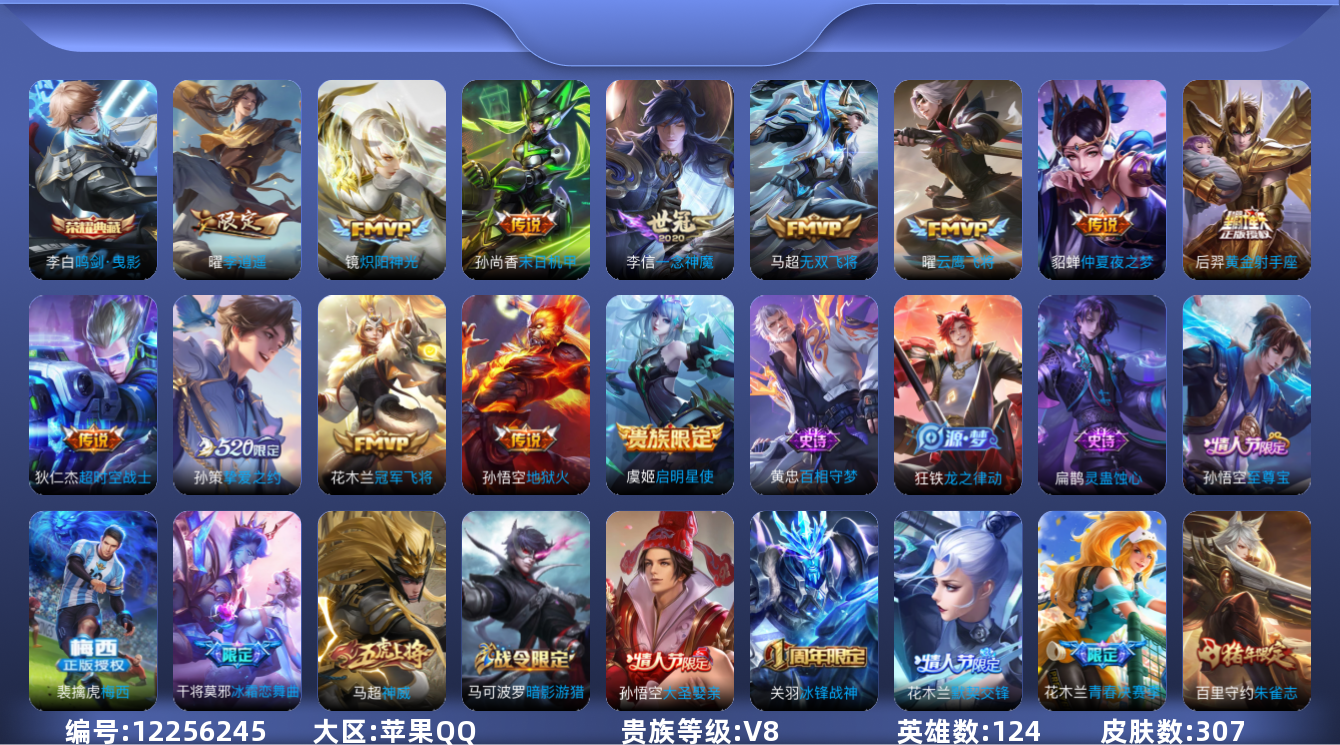[12256245]V8 1典藏 13传说 124英雄 307皮肤 可修改实名 信用分25分 女号 优质装备:鸣剑·曳影,黄金射手座,冠军飞将,云鹰飞将(小将军),炽阳神光,一念神魔,末日机甲-孙尚香(绿蚂蚱),地狱火,仲夏夜之梦(大飞蛾),李逍遥,超时空战士-狄仁杰,挚爱之约,无双飞将 珍宝阁皮:优雅恋人,蔷薇恋人 限定皮:至尊宝,梅西,神威(电光马子),飞衡(韩信年限),瑞麟志(木兰年限),遇见飞天,五谷丰年,冰锋战神,梁祝,天狼狩猎者,天狼溯光者,逐梦之音,李小龙,朱雀志(守约年限),如梦令-后羿,默契交锋-花木兰,纯白花嫁,一生所爱,大圣娶亲,引擎之心,青春决赛季,冰霜恋舞曲,蜜橘之夏 史诗皮:灵蛊蚀心,龙之律动,百相守梦-黄忠,紫霞仙子,电玩小子(小书包),黄金分割率,千年之狐,蒙恬荣光圣徽,无限星赏官,冰冠公主,偶像歌手,电玩·爆裂旋风,乱世虎臣,节奏热浪,修罗,女仆咖啡,摇滚巨星,水果甜心,绅士熊喵,星夜王子,心灵骇客,德古拉伯爵,暗隐猎兽者,幽灵船长,鬼剑武藏,心灵战警,舞动绿茵,地狱岩魂,纤云弄巧,缤纷独角兽,乘风破浪,逐浪之夏,水晶猎龙者,曙光守护者,金属风暴,原初追逐者,圣诞狂欢,圣诞恋歌,鹰眼统帅,王者之锤,暗夜贵公子,魅力维加斯,黎明之约,赏金猎手,无心,未来纪元-赵云