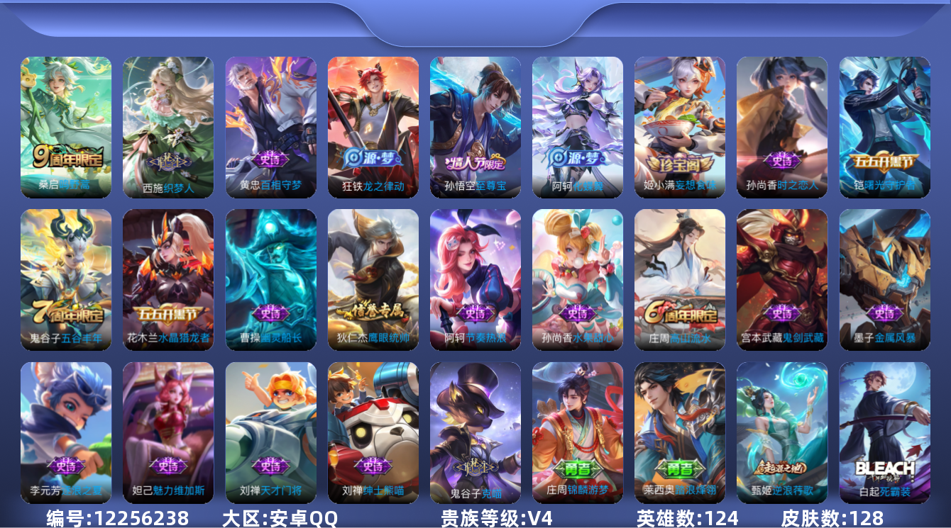 - [12227887]V7 11传说 125英雄 221皮肤 可修改实名 优质装备:炽阳神光,一念神魔,末日机甲-孙尚香(绿蚂蚱),超时空战士-狄仁杰,山海·炽霜斩(李信年限),画中仙,涂山容容 传说皮:九山相柳,星之鸣奏,幻光神枪 珍宝阁皮:妄想食味,玩趣恶龙 限定皮:愿照·九州拓(澜年限),愿照·千秋盛(女娲年限),傲雪梅枪,高山流水,五谷丰年,梁祝,李小龙,山海·玄木吟(马可年限) 史诗皮:器灵·浮梦炉,绮世丹青,瑰影绮梦,化蝶舞,龙之律动,星界战将,百相守梦-黄忠,蒙犽顽岩魄,海诺心动手记,千年之狐,闲日渔趣,匿光侦查者,江河有灵,百解令(蒙犽),蒙恬荣光圣徽,偶像歌手,猫狗日记-孙策,节奏热浪,修罗,女仆咖啡,摇滚巨星,水果甜心,绅士熊喵,星夜王子,德古拉伯爵,幽灵船长,鬼剑武藏,舞动绿茵,地狱岩魂,乘风破浪,逐浪之夏,水晶猎龙者,金属风暴,原初追逐者,圣诞狂欢,圣诞恋歌,鹰眼统帅,魅力维加斯,赏金猎手,天秀·音浪,无心,未来纪元-赵云