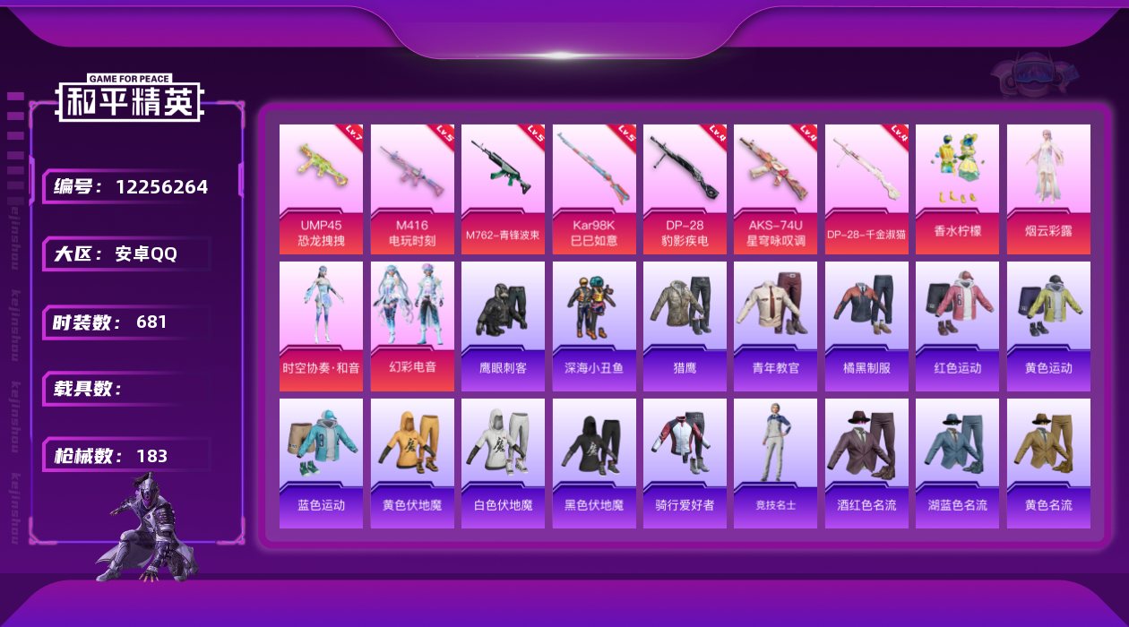 [12256264]4粉装 7特效枪 8印记 可二次 可修改实名 身法装备:Mark.06(新蓝螳螂) 优质装备:香水柠檬,UMP45恐龙拽拽,七级UMP45-恐龙拽拽,M416电玩时刻,M762-青锋波束,时空协奏·和音,DP-28-千金淑猫,AKS-74U-星穹咏叹调,幻彩电音,Kar98K-巳巳如意 热门装扮:烟云彩露,鹰眼刺客,深海小丑鱼 稀有枪皮:DP-28-豹影疾电 五级特效枪:五级M762-青锋波束,五级Kar98K-巳巳如意,五级M416-电玩时刻 四级特效枪:四级DP-28-千金淑猫,四级DP-28-豹影疾电,四级AKS-74U-星穹咏叹调 紫色装扮:田园牧歌,轻风白浪,和煦暖阳,SS22特训,莱茵河畔,SS23特训,幻彩翩翩,灵蜜圈圈,妙红点点,香榭午后,娇憨猪猪,梦幻奶油,萌趣咩咩,SS21特训,熠彩粉晶,SS31特训套装,SS2特训,人气偶像,军械专家,冰川特警,冷焰舞者,千禧之恋,SS30特训套装,青涩时光,SS20特训,SS15特训,时空追击者,SS16特训,冰爽海盐,SS13特训,浪漫樱花,萌趣颜团子,特种颜团子,飞驰魅影,音速流光,SS19特训,英勇保护者,豚鼠丹丹,吉莉礼服,雪兔飞飞,SS17特训,异彩先驱,SS18特训,都市魅力,酒红色名流,酷潮明星,野性战心,长空猛禽,雪山精英,霓虹极客,霓虹街区,青年教官,青春校园,风暴特警,耀眼新星,荣耀,蓝彩潮人,蓝色守护者,蓝色运动,虎虎生威吉莉,街头潮人,飞行日记,龙腾端午,骑行爱好者,魅力单车,鹤鸣,麻辣教官,黄色伏地魔,黄色名流,黄色运动,黑色伏地魔,龙的传人,龟仙人,冰河战士,龙魂突击队,蝶变,香桃花海,极地朋克,极速红龙,柠萌假日,格斗先锋,橘黑制服,沙漠兵团,暗金炫舞,海岛探路者,涂山之恋,深蓝色名流,滨海假日,幻影武者,坚韧舞者,夏日音浪,完美偶像,帅气教官,幻世战舞者,怒火燎原,战地督导,战地菁英,探宝勇士,湖蓝色名流,滨海厨神,绮丽涂鸦,疯狂小兔子,白熊同盟,白色伏地魔,破晓战魂,破蛋小黄鸡,甜蜜告白,福星高照,空投萌叽,竞技达人朋克,红色运动,甜蜜熊情侣,王牌教练,牛气冲天,灰色格斗者,灼焰舞者,炫蓝之夏,热血青春,燃烧卡路里,牛气满满,猛禽,猎鹰,小熊娃娃,雏菊兔兔,萝兰蝴蝶,SS29特训,狂花道·雅典娜,湖畔霞光,星途旅人,创世·幻影,白光莹,纯真浪花,热情海星,曼妙人鱼,SS28