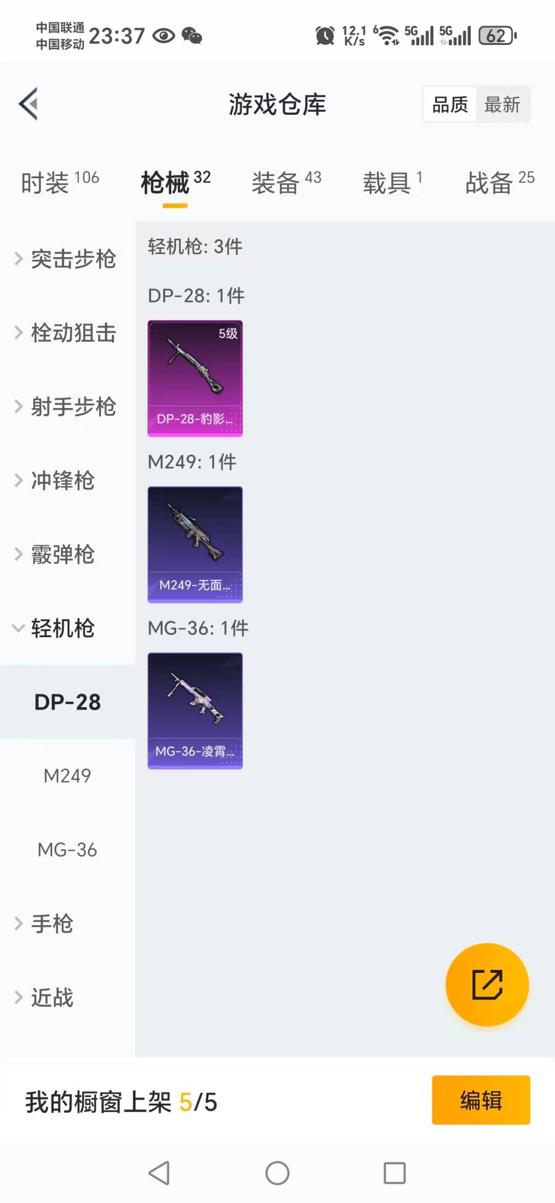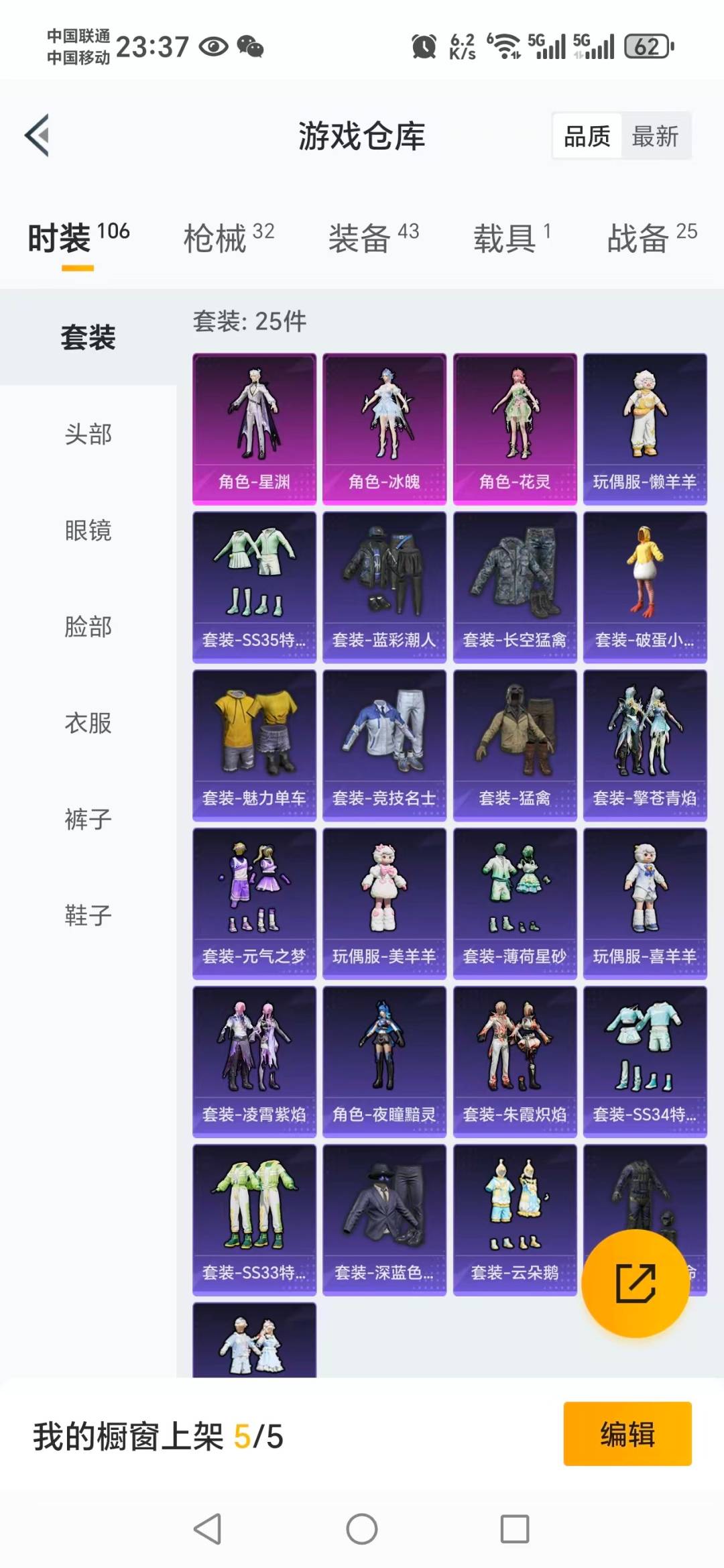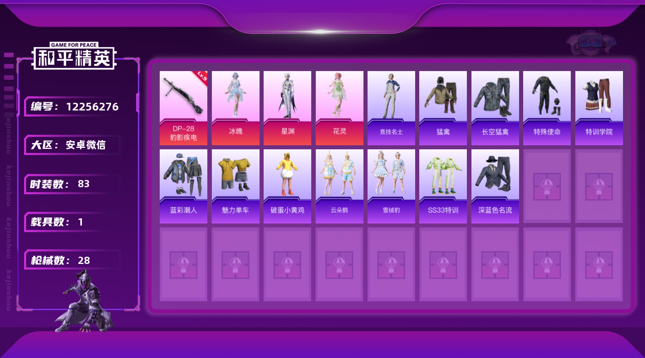 [12256276]3粉装 1特效枪 1载具 1印记 可二次 可修改实名 社交场景限制 优质装备:冰魄,花灵,星渊 稀有枪皮:DP-28-豹影疾电 五级特效枪:五级DP-28-豹影疾电 紫色装扮:云朵鹅,雪绒豹,SS33特训套装,魅力单车,长空猛禽,深蓝色名流,蓝彩潮人,特殊使命,特训学院,猛禽,破蛋小黄鸡,竞技名士 优质战备:精灵梦叶罗丽降落伞,喜羊羊与灰太狼降落伞