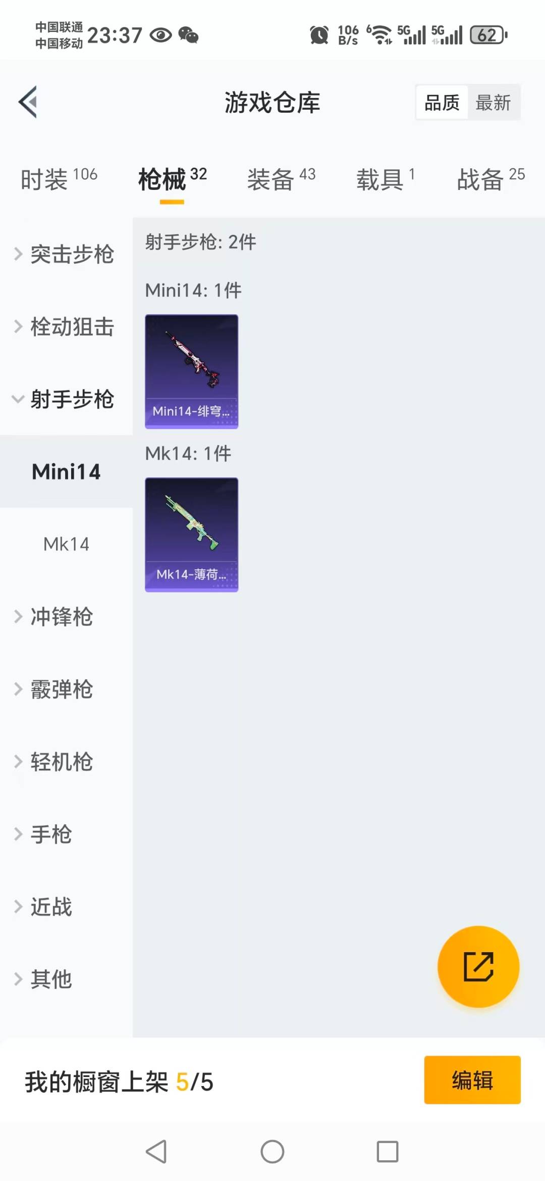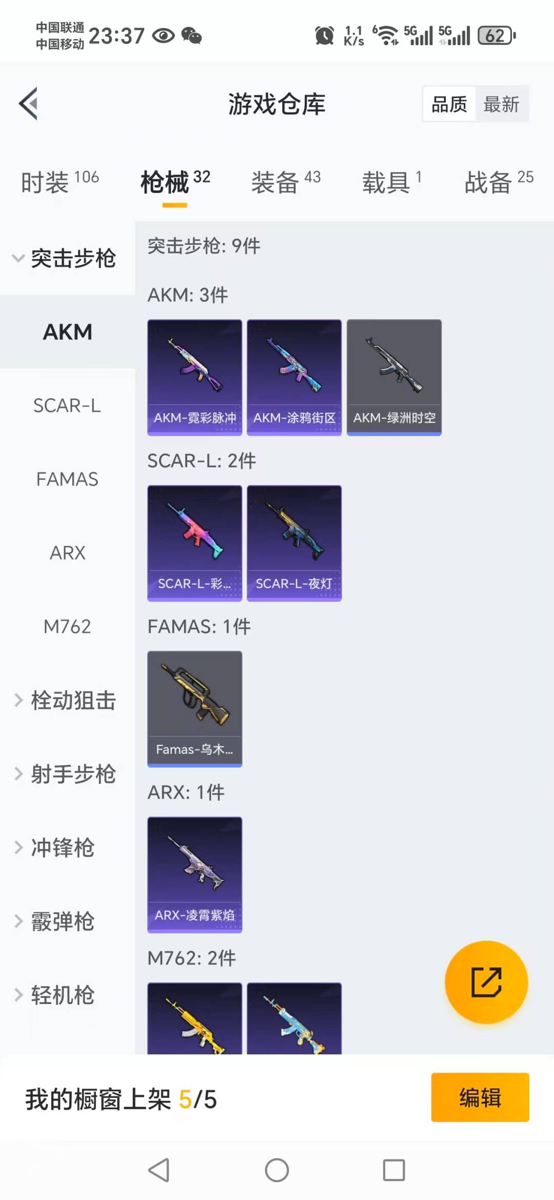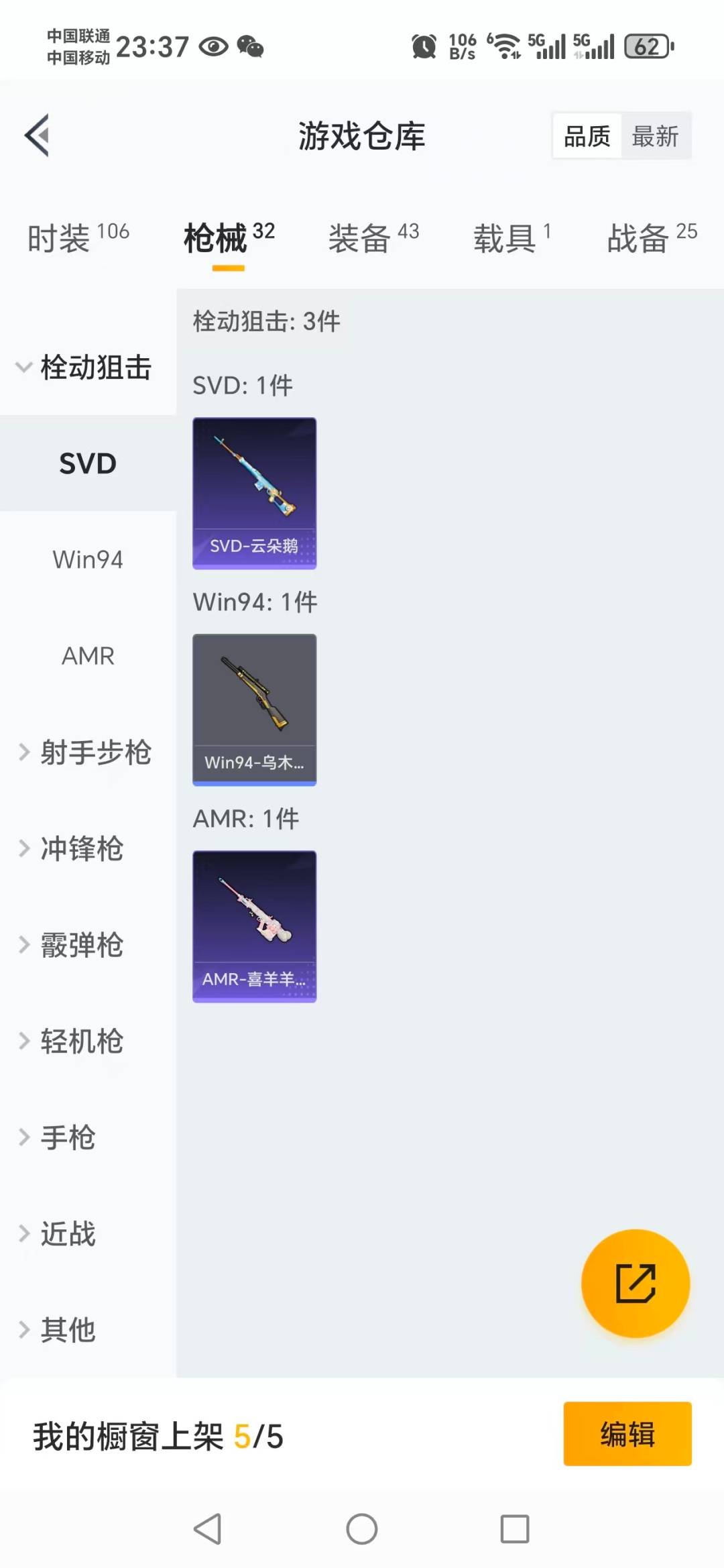 - [12087323]总资产:83.4M 5干员外观 1近战传说 13传说枪械 哈夫币:9.363K 可二次 可修改实名 优质装备:近战-影锋 烽火地带段位:铂金 全面战场段位:上等兵 传说武器皮肤:AS Val突击步枪-蛇年祥瑞,SR-25射手步枪-水墨云图,SCAR-H战斗步枪-水墨云图,M1014霰弹枪-影锋,SCAR-H战斗步枪-铁艺苍穹,AK-12突击步枪-夜鹰,G18-飞虎,SMG45冲锋枪-骑士,勇士冲锋枪-能天使-午夜邮差,M4A1突击步枪-蚀金玫瑰,QBZ95-1突击步枪-破军,Vector冲锋枪-能天使-午夜邮差 史诗武器皮肤:SR-3M紧凑突击步枪-英雄,QBZ95-1突击步枪-ACE,M4A1突击步枪-特勤执行,M700狙击步枪-蝮蛇,PKM通用机枪-蝮蛇,Ash-12战斗步枪-守夜人,SG552突击步枪-尖端治疗,SR-25射手步枪-尖端治疗,SG552突击步枪-深海恐惧,AKM突击步枪-林中猎手,M1014霰弹枪-林中猎手,SV-98狙击步枪-林中猎手,M250通用机枪-囚徒,SV-98狙击步枪-囚徒,M700狙击步枪-阿萨拉工艺,UZI冲锋枪-危险实验,M249轻机枪-维京,沙漠之鹰-曙光,Vector冲锋枪-阿萨拉文明,S12K霰弹枪-曙光,PKM通用机枪-英雄,M700狙击步枪-竞技风,QSZ92G-风林火山,93R-博士,ASh-12战斗步枪-刀锋 干员外观:威龙-铁面判官,红狼-蚀金玫瑰,骇爪-水墨云图,无名-夜鹰,威龙-飞虎