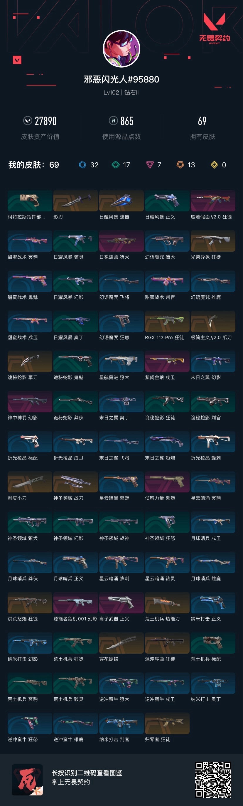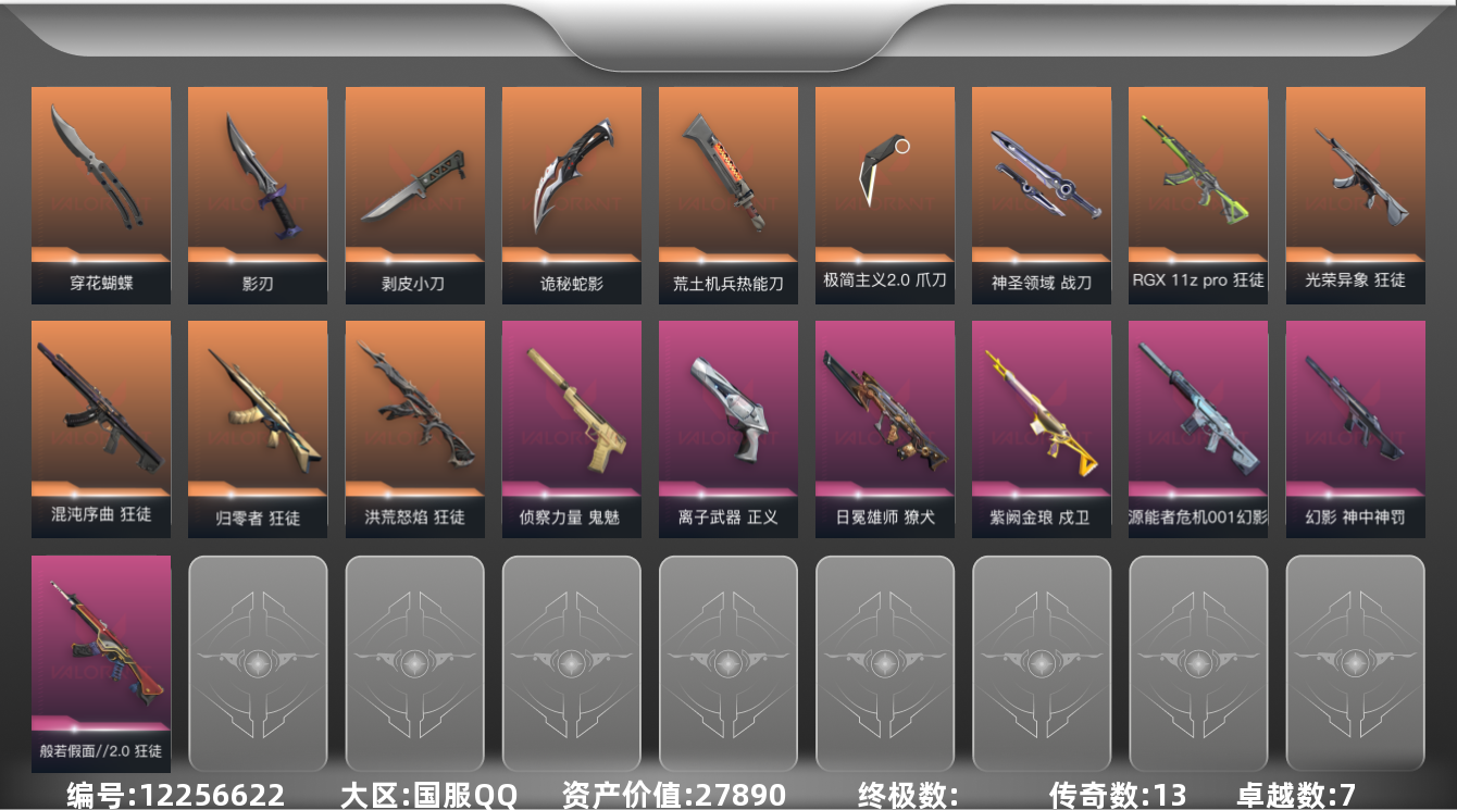 [12256622]13橙皮 7紫皮 69皮肤 22英雄 100卡面 865已用源晶 钻石 优质装备:狂徒-归零者,狂徒-混沌序曲,狂徒-洪荒怒焰,正义-离子武器,鬼魅-侦察力量,剥皮小刀,幻影-源能者危机001,影刃,荒土机兵热能刀,穿花蝴蝶,神圣领域 战刀,诡秘蛇影,极简主义2.0 爪刀,戍卫-紫阙金琅,獠犬-日冕雄师 步枪皮肤:狂徒-般若假面//2.0,狂徒-光荣异象,RGX 11z pro 狂徒,幻影-神中神罚