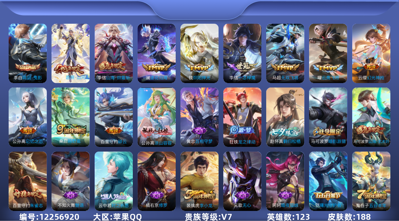 [12256920]V7 1典藏 11传说 123英雄 188皮肤 可修改实名 优质装备:鸣剑·曳影,云鹰飞将(小将军),炽阳神光,一念神魔,无双飞将,碎云,山海·炽霜斩(李信年限),记忆之芯(机甲兔),澜逐花归海,涂山容容 传说皮:幻光神枪 珍宝阁皮:胡桃夹子,玩趣恶龙 限定皮:愿照·山河定(司空震年限),逐霄战戟,鸣野蒿,五谷丰年,李小龙,朱雀志(守约年限),时之祈愿-云中君,山海·玄木吟(马可年限) 史诗皮:星界战将,龙之律动,茶境仙,百相守梦-黄忠,黄金分割率,特工魅影,江河有灵,鹤归松栖(赵怀真),魅语,蒙恬荣光圣徽,电玩·爆裂旋风,暗夜猫娘,龙骑士(小龙虾),末日机甲-吕布,乱世虎臣,修罗,摇滚巨星,水果甜心,绅士熊喵,天才门将,星夜王子,德古拉伯爵,暗隐猎兽者,幽灵船长,鬼剑武藏,舞动绿茵,地狱岩魂,缤纷独角兽,乘风破浪,逐浪之夏,水晶猎龙者,曙光守护者,金属风暴,原初追逐者,圣诞狂欢,圣诞恋歌,鹰眼统帅,魅力维加斯,无心,未来纪元-赵云