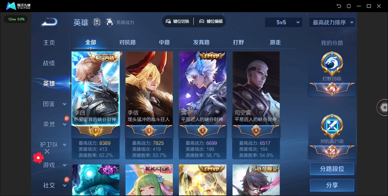 - PX_2062092-贵族等级: V5 英雄数: 112 皮肤数: 88 传说皮: 一念神魔,无双飞将,澜逐花归海 限定皮: 李小龙,神器·万象笔,鸣野蒿,愿照·九州拓