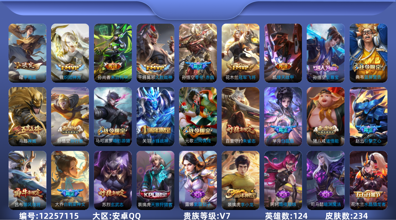[12257115]V7 7传说 124英雄 234皮肤 可修改实名 优质装备:冠军飞将,绛天战甲(鸡嘴战神),久胜战神,炽阳神光,末日机甲-孙尚香(绿蚂蚱),零号·赤焰,李逍遥 珍宝阁皮:优雅恋人,蔷薇恋人 限定皮:至尊宝,白鹤梁神女,白晶晶,神威(电光马子),遇见飞天,高山流水,冰锋战神,梁祝,御风骁将(吕布年限),天狼狩猎者,天狼溯光者,逐梦之音,李小龙,逐梦之影,玄武志(苏烈年限),朱雀志(守约年限),孙行者,猪悟能,引擎之心 史诗皮:紫霞仙子,白龙吟,黄金分割率,千年之狐,蒙恬荣光圣徽,偶像歌手,暗夜猫娘,乱世虎臣,节奏热浪,女仆咖啡,水果甜心,天才门将,星夜王子,功夫厨神,德古拉伯爵,暗隐猎兽者,幽灵船长,暗渊魔法,心灵战警,繁星吟游(呼啦呼啦),拒霜思,乘风破浪,水晶猎龙者,热力回旋,金属风暴,原初追逐者,鹰眼统帅,王者之锤,黎明之约