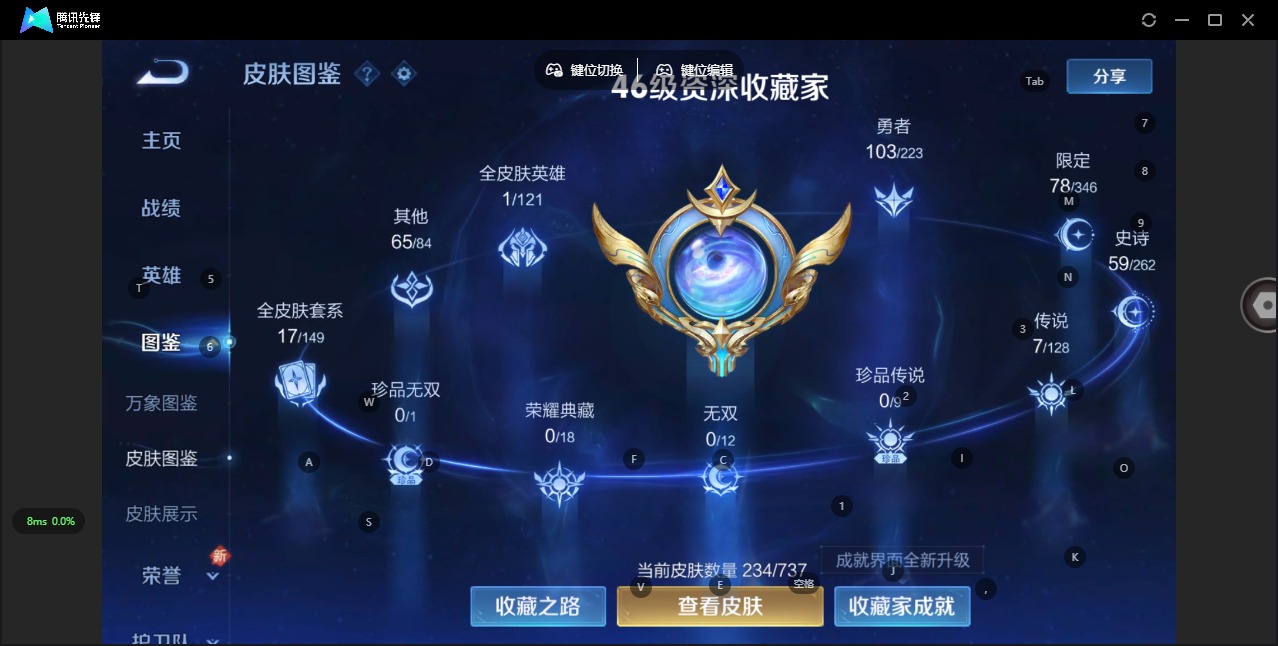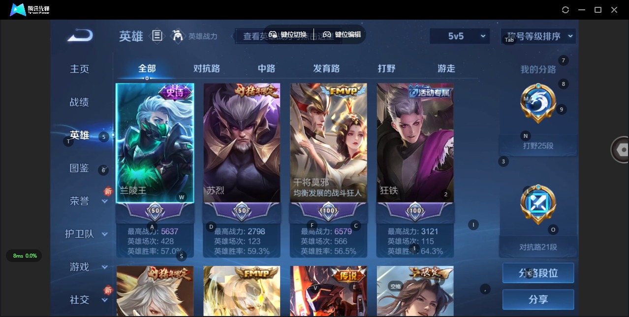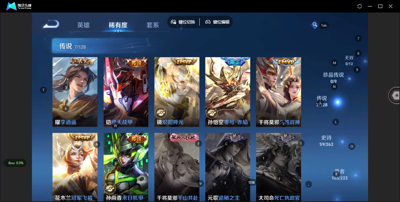 - [11472095]V7 1典藏 4传说 124英雄 194皮肤 可修改实名 优质装备:鸣剑·曳影,仲夏夜之梦(大飞蛾),涂山容容 珍宝阁皮:蔷薇恋人 限定皮:愿照·岁时盈(虞姬年限),鸣野蒿,至尊宝,飞衡(韩信年限),遇见飞天,梁祝,天狼绘梦者,李小龙,霸王别姬-项羽,霸王别姬-虞姬,大圣娶亲,天魔缭乱,蜜橘之夏 史诗皮:星界战将,龙之律动,紫霞仙子,黄金分割率,特工魅影,千年之狐,偶像歌手,龙骑士(小龙虾),乱世虎臣,节奏热浪,修罗,水果甜心,星夜王子,功夫厨神,暗隐猎兽者,鬼剑武藏,纤云弄巧,繁星吟游(呼啦呼啦),乘风破浪,逐浪之夏,水晶猎龙者,曙光守护者,原初追逐者,圣诞狂欢,鹰眼统帅,魅力维加斯,黎明之约,未来纪元-赵云