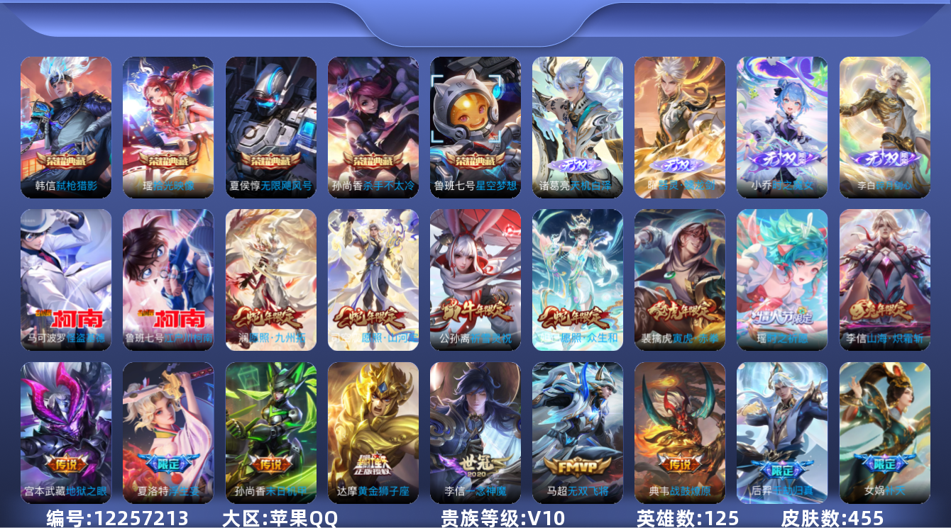 [12257213]V10 5典藏 4无双 2珍品传说 53传说 125英雄 455皮肤 可修改实名 优质装备:星空梦想(太空人),无限飓风号(高达),杀手不太冷,弑枪猎影(韩信典藏),碎月剑心(李白无双),小乔时之魔女(小乔无双),拾光映像(瑶典藏),器灵·螭龙剑,天机白泽,江户川柯南,怪盗基德,黄金狮子座,黄金射手座,云鹰飞将(小将军),绛天战甲(鸡嘴战神),黄金白羊座,久胜战神,一念神魔,云霓雀翎,末日机甲-孙尚香(绿蚂蚱),仲夏夜之梦(大飞蛾),音你心动-小乔,零号·赤焰,地狱之眼,飞鸢探春,游龙清影(小青龙),淬星耀世,超时空战士-狄仁杰,遇见胡旋,末日机甲-孙策,花朝如约(花篮子),无双飞将,碎云,神器·狴犴令,山海·炽霜斩(李信年限),山海·琳琅生(小乔年限),炽翼辉光(娃娃菜牛角包),浮生妄,记忆之芯(机甲兔),遇见神鼓,大乔-时之奇旅,艾琳觅芳踪,玄雷天君,千劫归真,涂山容容 传说皮:典韦战鼓燎原,幻光神枪 珍宝阁皮:万物之道,优雅恋人,蔷薇恋人 限定皮:愿照·九州拓(澜年限),愿照·山河定(司空震年限),愿照·众生和(妲己年限),逐霄战戟,鸣野蒿,至尊宝,异界灵契(白毛香),傲雪梅枪,补天,寅虎·展翼(孙膑年限),星穹之声,绯月行,白鹤梁神女,白晶晶,神威(电光马子),至美·乘鲤谣,至美·化雀舞,遇见飞天,高山流水,无限倾心-虞姬,齐天大圣,匿光决锋者,怒海麟威,降魔,冰锋战神,梁祝,御风骁将(吕布年限),逐梦之星,烈魂,岱宗(典韦年限),天狼溯光者,祈雪灵祝(雪兔子),李小龙,辉光之辰,如梦令-嫦娥,霸王别姬-项羽,霸王别姬-虞姬,孙行者,猪悟能,青春决赛季,乒乒小将,热情桑巴,神奇女侠,匿光追影者,女儿国国王,寅虎·瑞焰(虎皮蛋子),寅虎·心曲(虎婆),寅虎·赤拳(老虎年限),时之祈愿-云中君,时之祈愿-瑶(瑶传限),百木心枪,玉兔公主,启示之音,时之奇旅-妲己,神器·万象笔,梦圆繁星,山海·玄木吟(马可年限) 史诗皮:器灵·浮梦炉,糖绘人间,化蝶舞,灵蛊蚀心,星界战将,谪仙醉月,龙之律动,藏狐·褐绒,石田雨龙,百相守梦-周瑜,戍鼓铭心,炽弈燎原,破空之剑,曹操夜都魔契,乘龙·聚宝船(安琪拉年限),百相守梦-百里守约,百相守梦-黄忠,织梦人,紫霞仙子,苍穹之光,电玩小子(小书包),白龙吟,黄金分割率,特工魅影,千年之狐,永昼,江河有灵,末日机甲-莱西奥,真