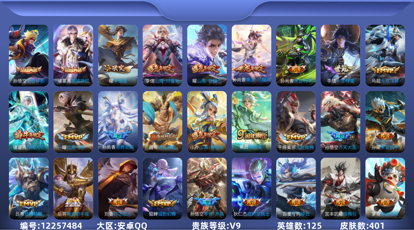 [12257484]V9 2典藏 31传说 125英雄 401皮肤 可修改实名 优质装备:全息碎影(猴子典藏),星域神启(倪克斯贼亮),黄金射手座,云鹰飞将(小将军),绛天战甲(鸡嘴战神),猫影幻舞,久胜战神,一念神魔,末日机甲-孙尚香(绿蚂蚱),地狱火,零号·赤焰,胖达荣荣,李逍遥,时之恋人-刘备(电焊工),超时空战士-狄仁杰,末日机甲-孙策,无双飞将,碎云,山海·炽霜斩(李信年限),山海·琳琅生(小乔年限),山海·苍雷引(电光曜子),燃星之曲,电玩·雷克斯,灼幽烈阳,惊梅引,遇见神鼓 传说皮:乘龙·问璇玑(孙尚香年限) 珍宝阁皮:妄想食味,蔷薇恋人 限定皮:逐霄战戟,陌上桑,鸣野蒿,至尊宝,凤凰于飞,异界灵契(白毛香),傲雪梅枪,时雨天司(水龙头),神威(电光马子),飞衡(韩信年限),玄嵩(庄周年限),山海·碧波行(瑶年限),高山流水,齐天大圣,匿光决锋者,怒海麟威,降魔,五谷丰年,青龙志(铠年限),幽恒(沐浴露),梁祝,御风骁将(吕布年限),龙胆,烈魂,岱宗(典韦年限),天狼溯光者,天狼绘梦者,李小龙,朱雀志(守约年限),孙行者,引擎之心,云端筑梦师,神奇女侠,美猴王,寅虎·心曲(虎婆),时之祈愿-云中君,匿光启智者,神器·万象笔,山海·玄木吟(马可年限),冰霜神祇 史诗皮:化蝶舞,灵蛊蚀心,龙之律动,百相守梦-周瑜,炽弈燎原,撼地雄心,破空之剑,蔬乡物语(鲁班七号),百相守梦-黄忠,紫霞仙子,苍穹之光,电玩小子(小书包),白龙吟,黄金分割率,特工魅影,千年之狐,永昼,江河有灵,鹤归松栖(赵怀真),真我赫兹(镜),真我赫兹(百里守约),完美假期,魅语,百解令(蒙犽),高渐离燃音魔法,蒙恬荣光圣徽,无限星赏官,冰冠公主,青蛇,偶像歌手,白蛇,晚萤,电玩·兔顽号,电玩·爆裂旋风,百相守梦(关羽),龙骑士(小龙虾),末日机甲-吕布,猫狗日记-孙策,猫狗日记-大乔,时之恋人-孙尚香,乱世虎臣,节奏热浪,修罗,女仆咖啡,摇滚巨星,水果甜心,绅士熊喵,天才门将,星夜王子,心灵骇客,时之奇旅-安琪拉,功夫厨神,德古拉伯爵,暗隐猎兽者,幽灵船长,鬼剑武藏,暗渊魔法,心灵战警,乐园奇幻夜,天秀·启明,舞动绿茵,地狱岩魂,诗语江南,纤云弄巧,繁星吟游(呼啦呼啦),拒霜思,缤纷独角兽,乘风破浪,逐浪之夏,龙鼓争鸣,月团寄思,水晶猎龙者,曙光守护者,热力回旋,箭羽风息,唤灵魅影,金属风暴,圣诞狂欢,圣