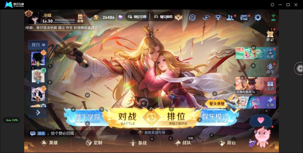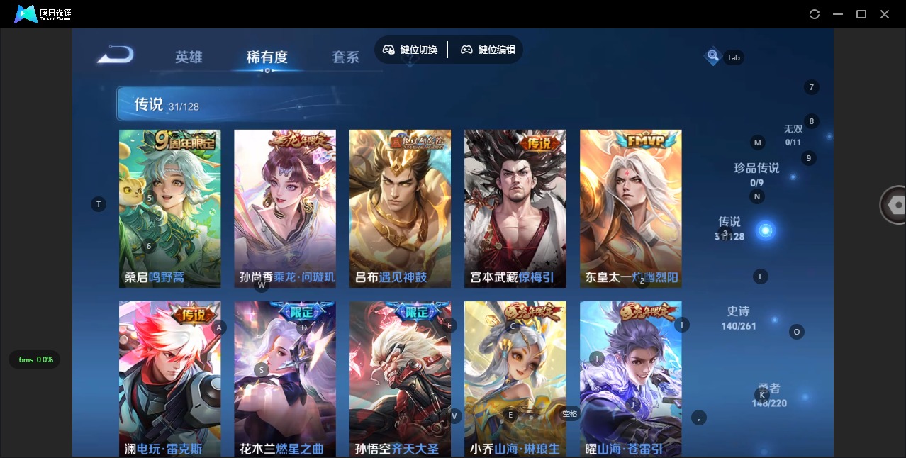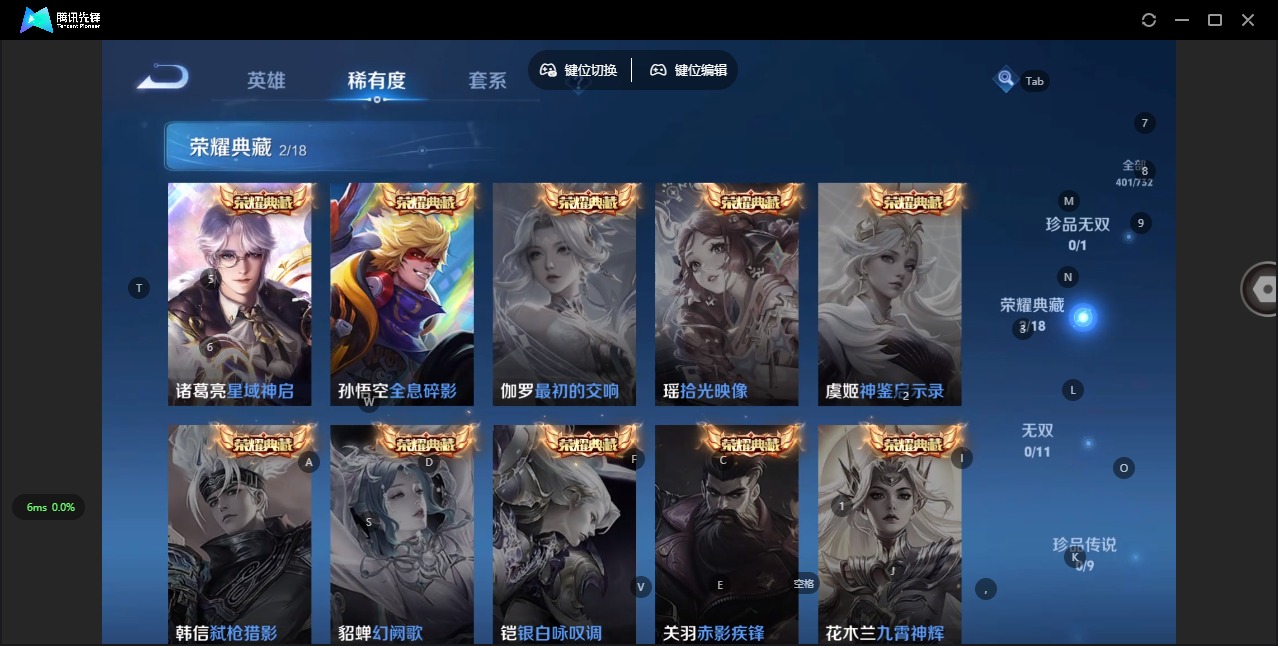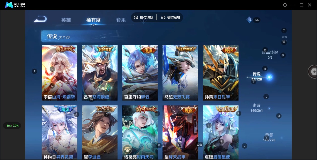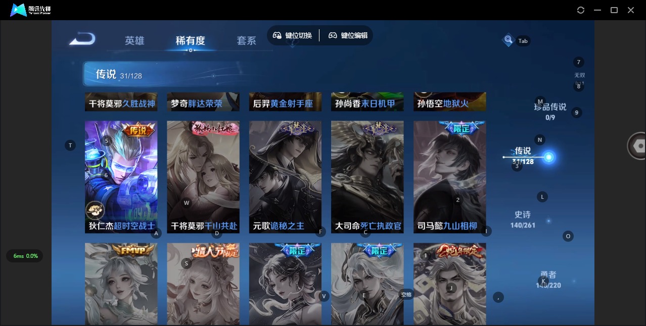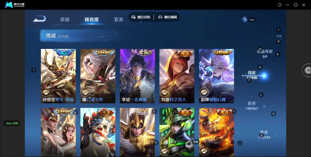 - [12061899]V6 5传说 122英雄 188皮肤 可修改实名 优质装备:地狱火 珍宝阁皮:玩趣恶龙 限定皮:愿照·九州拓(澜年限),鸣野蒿,至尊宝,凤求凰(白切鸡),时雨天司(水龙头),五谷丰年,青龙志(铠年限),梁祝,天狼狩猎者,李小龙,大圣娶亲,引擎之心,神器·万象笔 史诗皮:黄金分割率,特工魅影,千年之狐,魅语,冰冠公主,末日机甲-吕布,时之恋人-孙尚香,乱世虎臣,水果甜心,绅士熊喵,心灵骇客,鬼剑武藏,纤云弄巧,繁星吟游(呼啦呼啦),逐浪之夏,水晶猎龙者,圣诞狂欢,鹰眼统帅,魅力维加斯,赏金猎手,无心,未来纪元-赵云