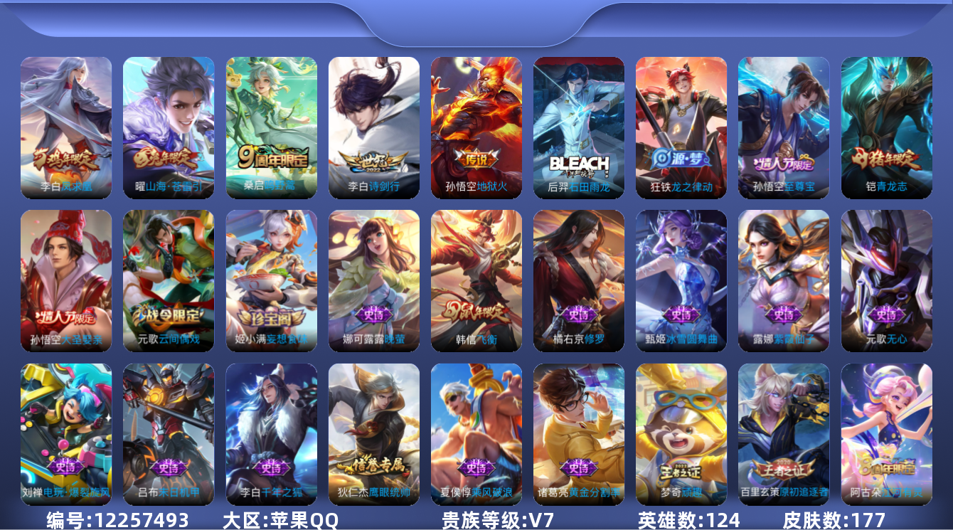 [12257493]V7 5传说 124英雄 177皮肤 可修改实名 优质装备:地狱火,山海·苍雷引(电光曜子) 珍宝阁皮:妄想食味,优雅恋人 限定皮:鸣野蒿,至尊宝,凤求凰(白切鸡),飞衡(韩信年限),诗剑行,青龙志(铠年限),大圣娶亲 史诗皮:星界战将,龙之律动,石田雨龙,紫霞仙子,白龙吟,黄金分割率,千年之狐,江河有灵,蒙恬荣光圣徽,晚萤,电玩·爆裂旋风,末日机甲-吕布,修罗,水果甜心,暗隐猎兽者,鬼剑武藏,繁星吟游(呼啦呼啦),缤纷独角兽,乘风破浪,逐浪之夏,原初追逐者,鹰眼统帅,王者之锤,魅力维加斯,黎明之约,无心,未来纪元-赵云