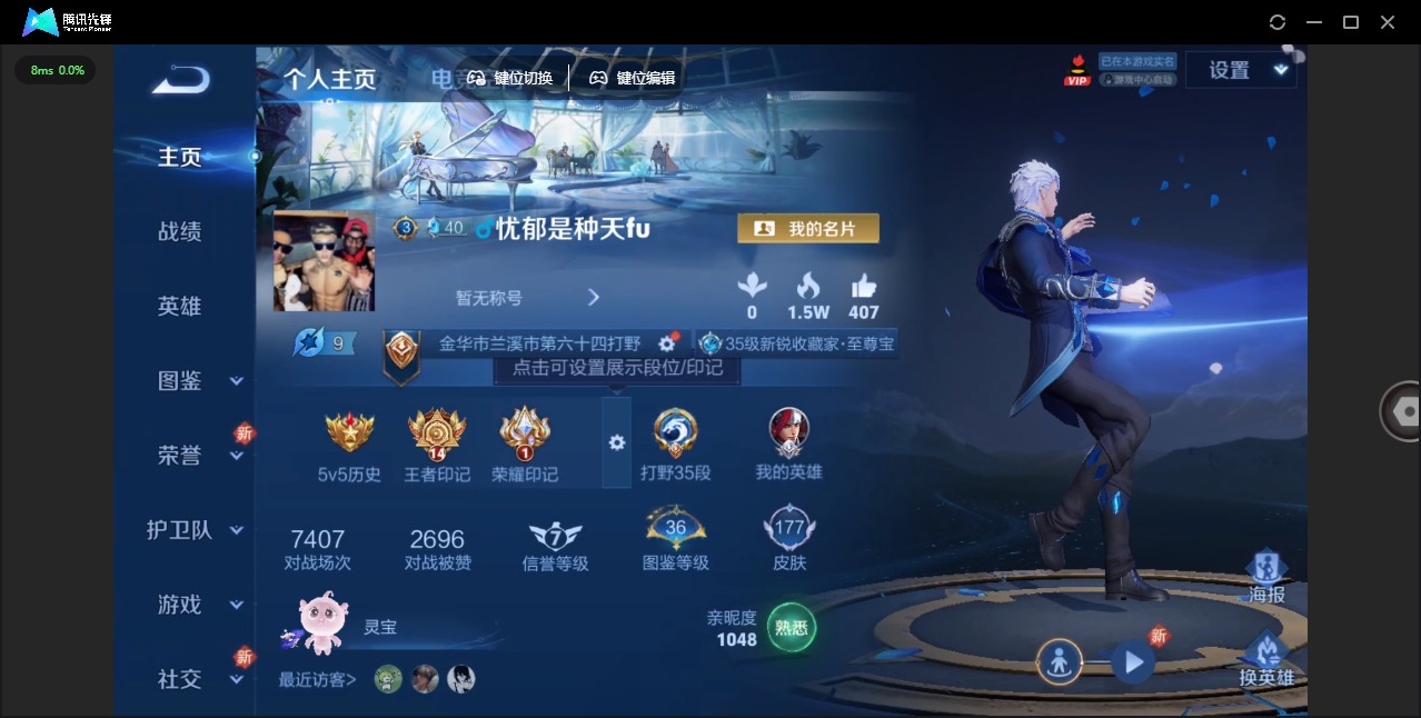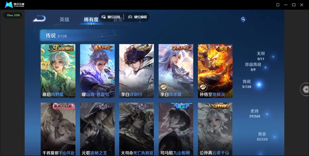 - [12323061]V7 8传说 125英雄 254皮肤 可修改实名 优质装备:末日机甲-孙尚香(绿蚂蚱),地狱火,地狱之眼,涂山容容 珍宝阁皮:胡桃夹子 限定皮:鸣野蒿,夏侯惇霜北刀,至尊宝,白虎志(电光耗子),凤求凰(白切鸡),时之彼端,遇见飞天,高山流水,齐天大圣,降魔,五谷丰年,青龙志(铠年限),游园惊梦,梁祝,御风骁将(吕布年限),岱宗(典韦年限),李小龙,朱雀志(守约年限),辉光之辰,大圣娶亲,美猴王 史诗皮:百相守梦-周瑜,怒海争锋,百相守梦-黄忠,苍穹之光,千年之狐,匿光侦查者,魅语,冰冠公主,晚萤,猫狗日记-孙策,乱世虎臣,修罗,摇滚巨星,水果甜心,绅士熊喵,天才门将,心灵骇客,功夫厨神,德古拉伯爵,暗隐猎兽者,幽灵船长,鬼剑武藏,心灵战警,纤云弄巧,繁星吟游(呼啦呼啦),乘风破浪,箭羽风息,金属风暴,原初追逐者,圣诞狂欢,圣诞恋歌,鹰眼统帅,魅力维加斯,赏金猎手,无心,未来纪元-赵云