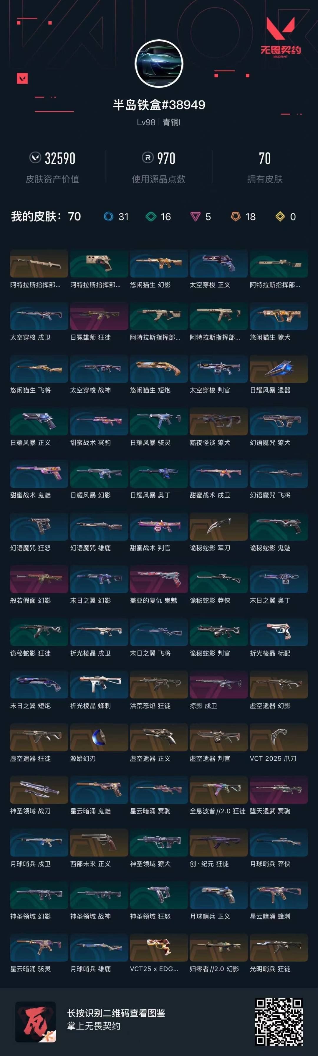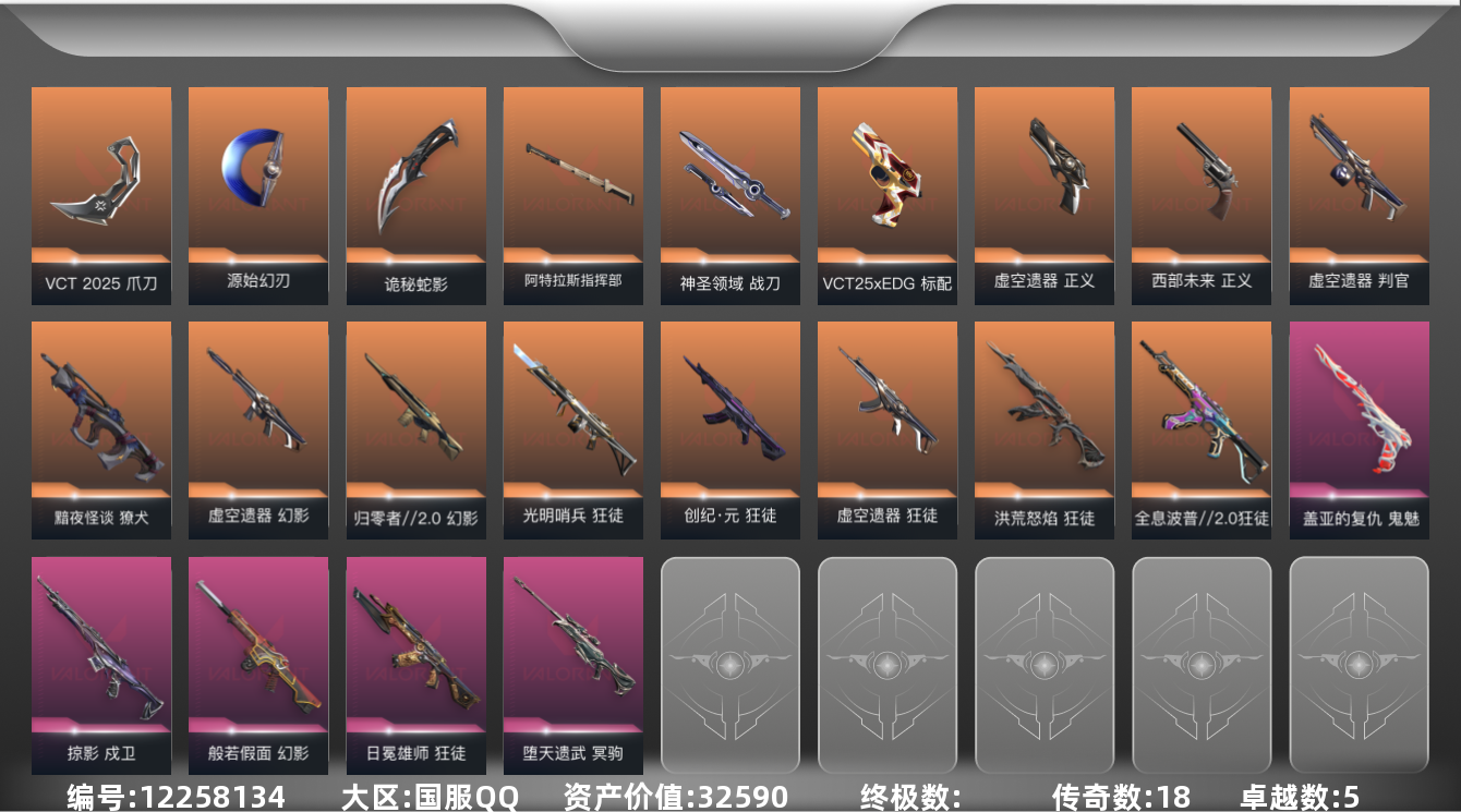 [12258134]18橙皮 5紫皮 70皮肤 27英雄 94卡面 970已用源晶 青铜 优质装备:狂徒-光明哨兵,冥驹-堕天遗武,狂徒-洪荒怒焰,幻影-般若假面,狂徒-日冕雄师,狂徒-全息波普//2.0,戍卫-掠影,鬼魅-盖亚的复仇,神圣领域 战刀,VCT 2025 爪刀,源始幻刃,诡秘蛇影,阿特拉斯指挥部 套装:虚空遗器,VCT 2025赛季礼包,VCTCN2025套装 佩枪皮肤:标配-VCT25xEDG,正义-虚空遗器,正义-西部未来 霰弹枪皮肤:判官-虚空遗器 步枪皮肤:獠犬-黯夜怪谈,幻影-归零者//2.0,狂徒-创·纪元,狂徒-虚空遗器,幻影-虚空遗器