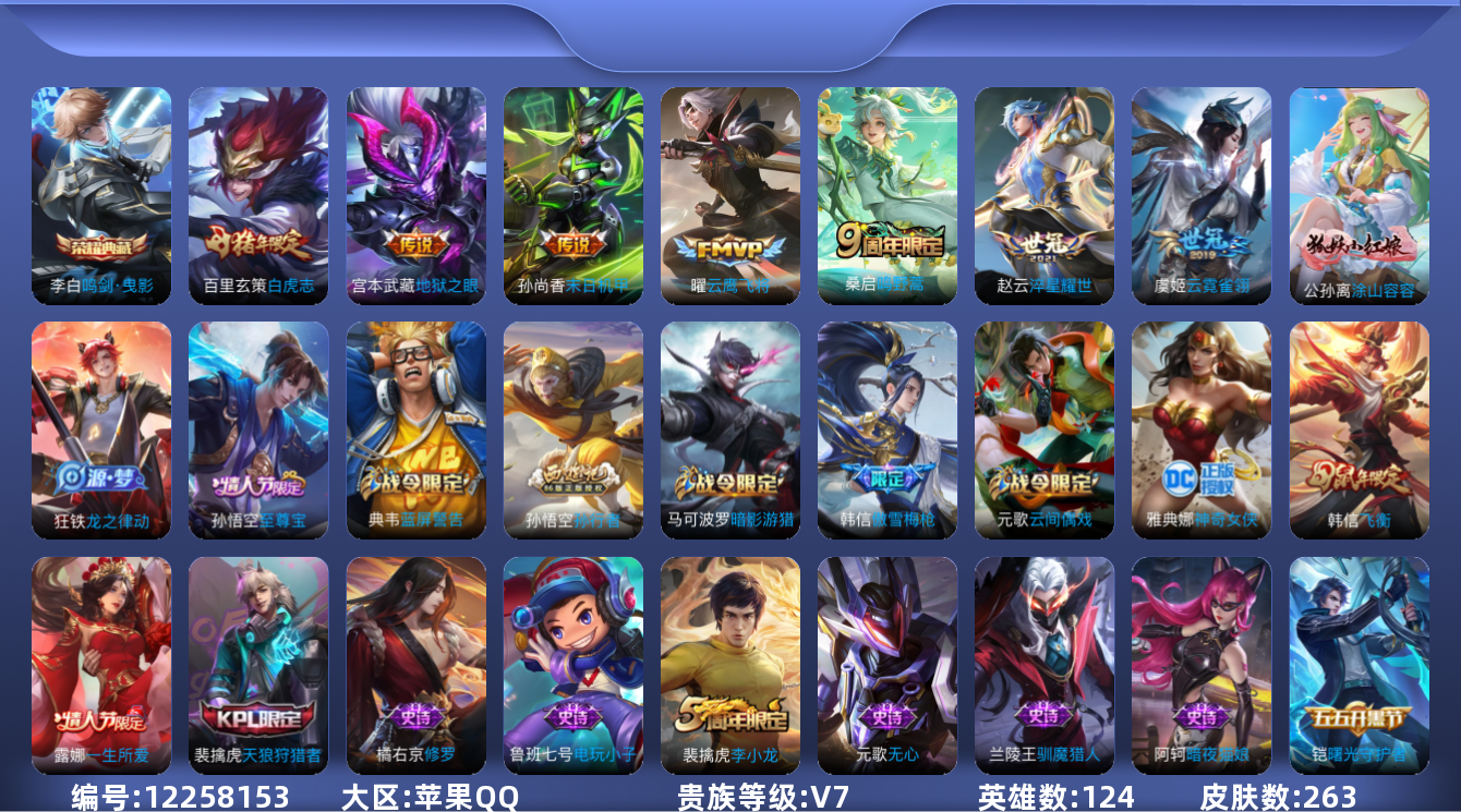 [12258153]V7 1典藏 6传说 124英雄 263皮肤 可修改实名 优质装备:鸣剑·曳影,云鹰飞将(小将军),云霓雀翎,末日机甲-孙尚香(绿蚂蚱),地狱之眼,淬星耀世,涂山容容 珍宝阁皮:万物之道,蔷薇恋人,玩趣恶龙 限定皮:鸣野蒿,至尊宝,白虎志(电光耗子),傲雪梅枪,魔法小厨娘,飞衡(韩信年限),遇见飞天,游园惊梦,梁祝,天狼狩猎者,李小龙,逐梦之影,孙行者,一生所爱,神奇女侠 史诗皮:龙之律动,苍穹之光,电玩小子(小书包),白龙吟,黄金分割率,特工魅影,千年之狐,江河有灵,无限星赏官,冰冠公主,偶像歌手,暗夜猫娘,龙骑士(小龙虾),猫狗日记-孙策,节奏热浪,修罗,女仆咖啡,摇滚巨星,水果甜心,天才门将,心灵骇客,功夫厨神,暗隐猎兽者,幽灵船长,鬼剑武藏,心灵战警,地狱岩魂,纤云弄巧,繁星吟游(呼啦呼啦),缤纷独角兽,乘风破浪,逐浪之夏,月团寄思,水晶猎龙者,曙光守护者,热力回旋,金属风暴,原初追逐者,圣诞狂欢,圣诞恋歌,鹰眼统帅,黎明之约,无心,未来纪元-赵云