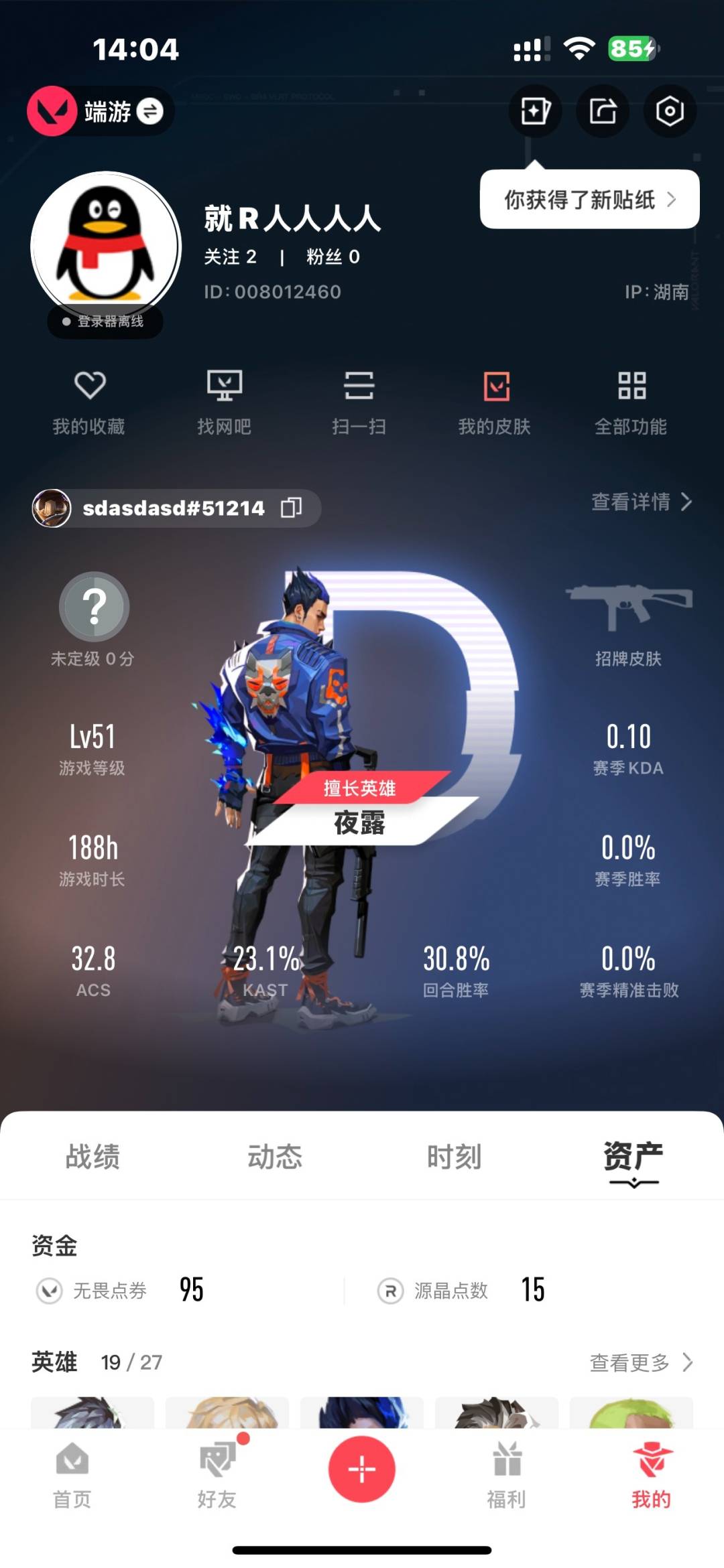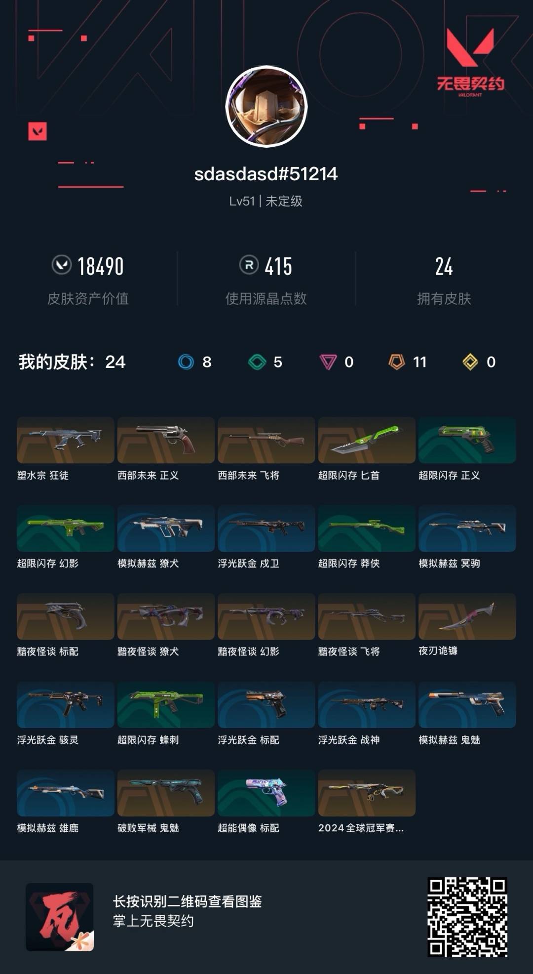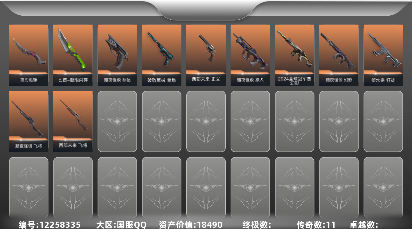 [12258335]11橙皮 24皮肤 19英雄 43卡面 415已用源晶 未定级 优质装备:黯夜怪谈套装,狂徒-塑水宗,幻影-2024全球冠军赛,幻影-黯夜怪谈,鬼魅-破败军械,夜刃诡镰,匕首-超限闪存 佩枪皮肤:标配-黯夜怪谈,正义-西部未来 步枪皮肤:獠犬-黯夜怪谈 狙击枪皮肤:飞将-黯夜怪谈,飞将-西部未来