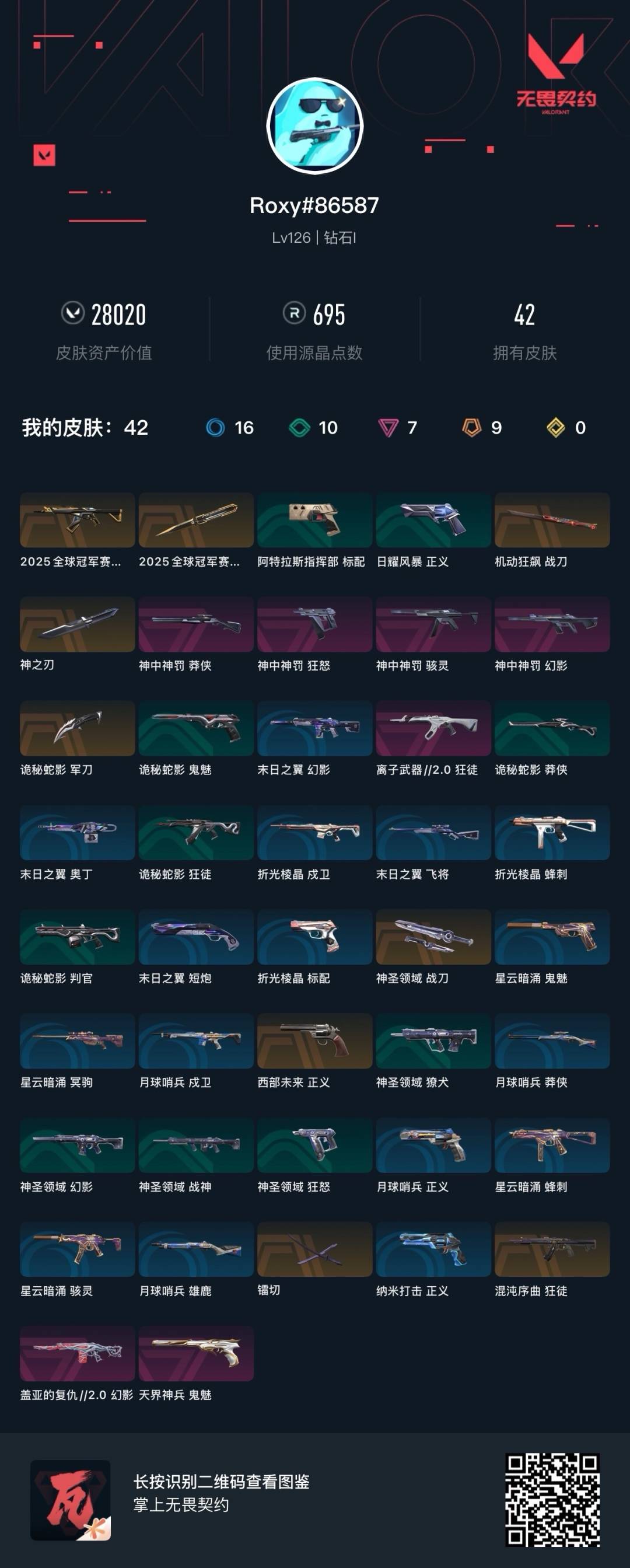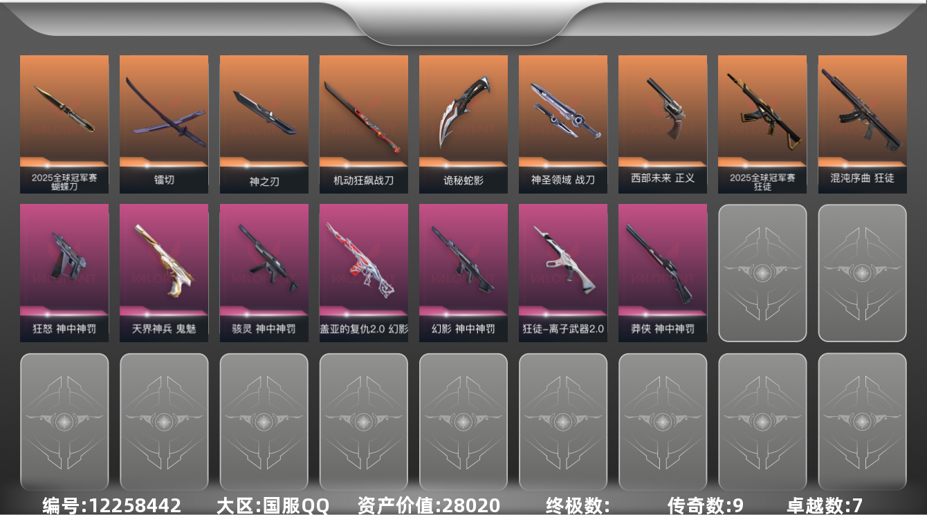 [12258442]9橙皮 7紫皮 42皮肤 26英雄 73卡面 695已用源晶 钻石 优质装备:2025全球冠军赛 蝴蝶刀,狂徒-混沌序曲,幻影-盖亚的复仇2.0,鬼魅-天界神兵,机动狂飙战刀,镭切,神圣领域 战刀,诡秘蛇影,神之刃,2025全球冠军赛 狂徒 套装:神罚套装,神中神罚套装 佩枪皮肤:狂怒-神中神罚,正义-西部未来 冲锋枪皮肤:骇灵-神中神罚 步枪皮肤:狂徒-离子武器2.0,幻影-神中神罚 狙击枪皮肤:莽侠-神中神罚