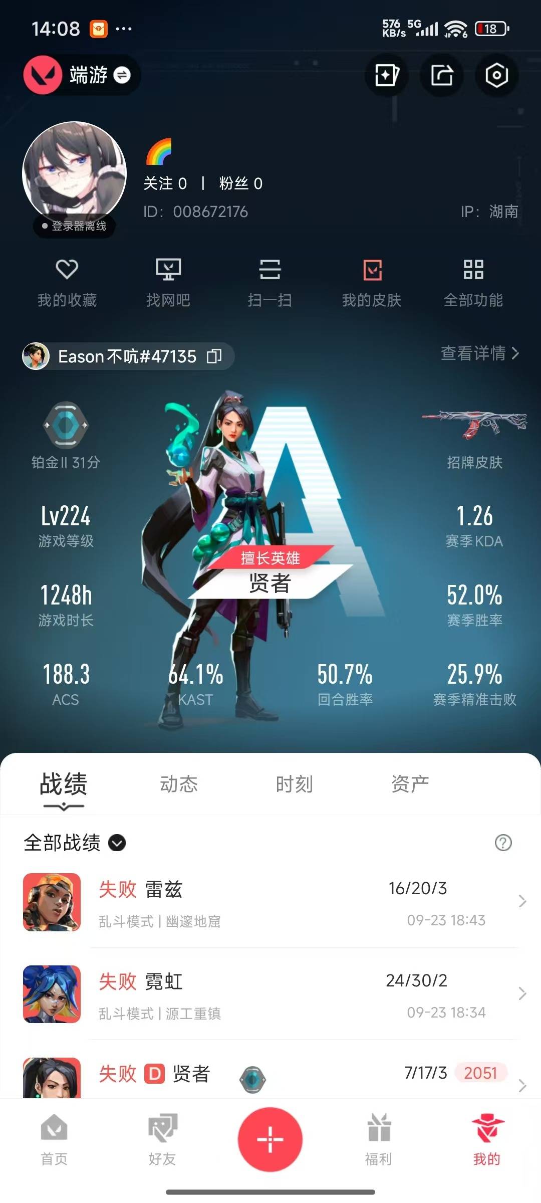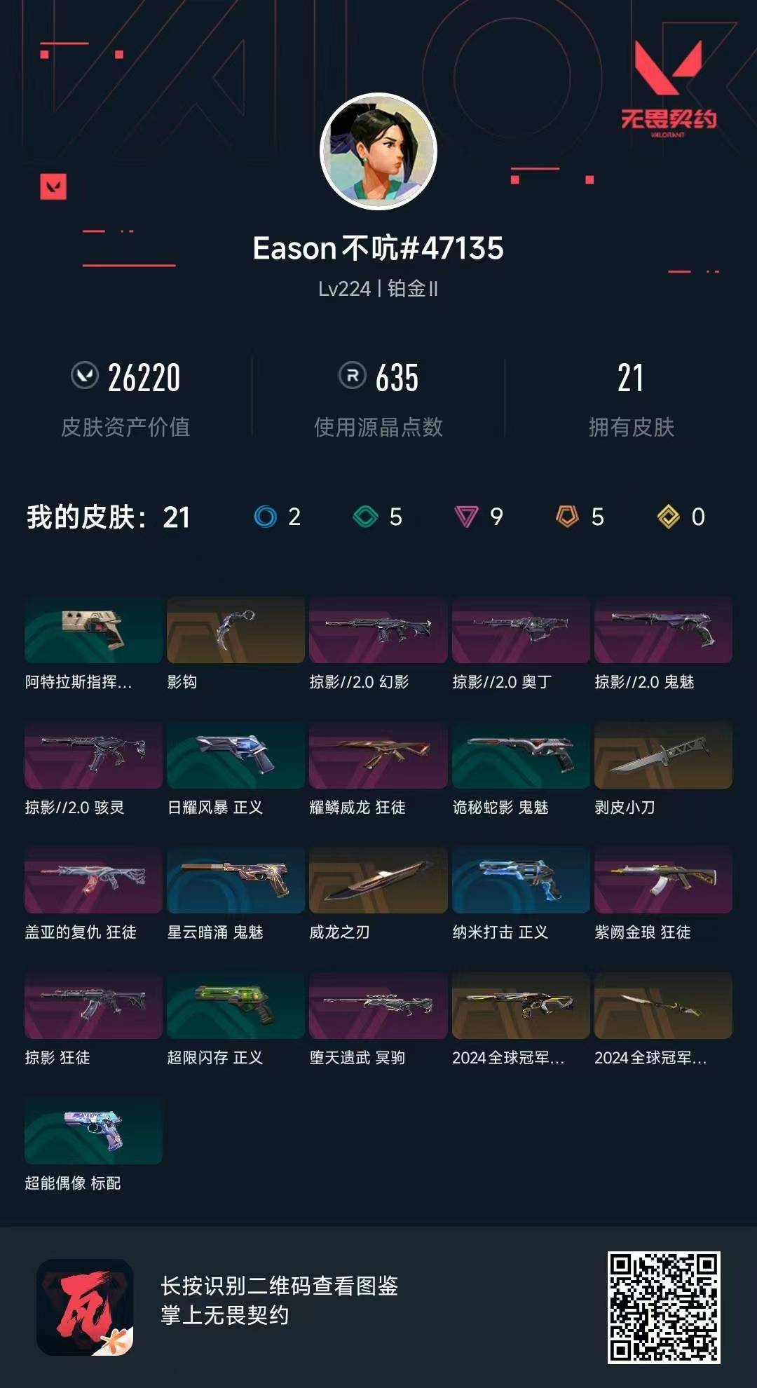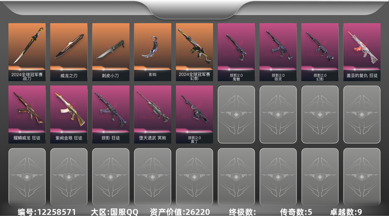 [12258571]5橙皮 9紫皮 21皮肤 27英雄 72卡面 635已用源晶 铂金 优质装备:2024全球冠军赛套装,幻影-2024全球冠军赛,狂徒-掠影,狂徒-紫阙金琅,狂徒-盖亚的复仇,冥驹-堕天遗武,剥皮小刀,狂徒-耀鳞威龙,威龙之刃,影钩 亮点皮肤:战刀-2024全球冠军赛 套装:掠影2.0套装 佩枪皮肤:鬼魅-掠影2.0 冲锋枪皮肤:骇灵-掠影2.0 步枪皮肤:幻影-掠影2.0 机枪皮肤:奥丁-掠影2.0