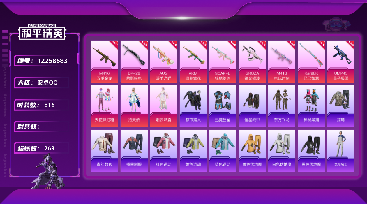 [12258683]3粉装 9特效枪 18印记 可二次 可修改实名 身法装备:都市猎人,8号机(新粉螳螂) 优质装备:都市猎人,M416五爪金龙,天使彩虹糖,洛天依,AKM绿萝繁花,SCAR-L-锦绣绵绵,七级M416-五爪金龙,M416电玩时刻,UMP45量子极限,GROZA-镜光银凌,AUG-暖羊咩咩,Kar98K-巳巳如意 热门装扮:烟云彩露,神秘黑猫,恒星战甲,迅捷狂鲨,东方飞龙,都市猎人 稀有枪皮:DP-28-豹影疾电 五级特效枪:五级GROZA-镜光银凌,五级Kar98K-巳巳如意,五级UMP45-量子极限,五级DP-28-豹影疾电,五级AUG-暖羊咩咩,五级M416-电玩时刻,五级SCAR-L-锦绣绵绵,五级AKM-绿萝繁花 紫色装扮:SS30特训套装,SS31特训套装,SS33特训套装,青涩时光,旭日情侣,顶瓜瓜,SS23特训,田园牧歌,轻风白浪,和煦暖阳,SS22特训,夏日音浪,北国孤狼,吉莉礼服,完美偶像,帅气教官,幻世战舞者,幻影武者,战地督导,冷焰舞者,人气偶像,冰川特警,娇憨猪猪,时空追击者,暴风机械师,SS16特训,爆裂葡萄,瑞龙福将,团圆交子,SS17特训,迅捷之星,科技之星,SS14特训,萌趣颜团子,特种颜团子,青春冒险家,潮流游乐家,SS15特训,SS21特训,甜心亚梦,虚音幻奏,猎梦纪元,SS20特训,萌趣咩咩,暖心熊熊,雪兔飞飞,异彩先驱,SS18特训,飞驰魅影,音速流光,极速竞梦,SS19特训,军刀雅典娜,龙的传人,飞行日记,魅力单车,鹤鸣,麻辣教官,黄色伏地魔,黄色名流,黄色运动,黎明保卫者,黑色伏地魔,龙腾端午,龟仙人,冰河战士,龙魂突击队,蝶变,香桃花海,都市魅力,酒红色名流,酷潮明星,野性战心,长空猛禽,雪山征服者,雪山精英,霓虹极客,霓虹街区,青年教官,无面战甲,探宝勇士,炫蓝之夏,湖蓝色名流,滨海假日,滨海厨神,灰色格斗者,灼焰舞者,热血青春,牛气冲天,牛气满满,特战英豪,特战装甲,特殊使命,深蓝色名流,狂战萌兔,格斗先锋,暗金炫舞,极地朋克,极速红龙,柠萌假日,涂山之恋,橘黑制服,沙漠兵团,沙漠探路者,沙漠毒蛇,海岛探路者,特训学院,跃动心情,绮丽涂鸦,红色运动,荣耀,蓝彩潮人,蓝色运动,虎虎生威吉莉,血色贵族,街头潮人,狂沙舞者,白色伏地魔,猎鹰,猛禽,王牌教练,甜蜜告白,甜蜜熊情侣,疯狂小兔子,白熊同盟,破晓战魂,破蛋小黄鸡,