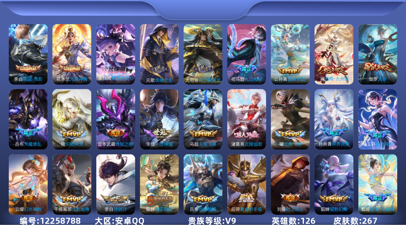 [12258788]V9 2典藏 1珍品传说 32传说 126英雄 267皮肤 典藏英雄武则天 可修改实名 优质装备:鸣剑·曳影,九霄神辉(木兰典藏),酷洛米之心,黄金射手座,云鹰飞将(小将军),绛天战甲(鸡嘴战神),猫影幻舞,久胜战神,炽阳神光,一念神魔,云霓雀翎,地狱火,海洋之心,地狱之眼,飞鸢探春,胖达荣荣,时之恋人-刘备(电焊工),淬星耀世,遇见胡旋,无双飞将,诡秘之主,涂山容容 传说皮:死亡执政官,九山相柳,云诺千山,星之鸣奏,幻光神枪 珍宝阁皮:玩趣恶龙 限定皮:愿照·九州拓(澜年限),至尊宝,凤凰于飞,太华(伽罗年限),武陵仙君(小桃花),异界灵契(白毛香),傲雪梅枪,时之彼端,神威(电光马子),飞衡(韩信年限),玄嵩(庄周年限),至美·化雀舞,高山流水,诗剑行,怒海麟威,五谷丰年,幽恒(沐浴露),游园惊梦,梁祝,岱宗(典韦年限),虎魄,天狼绘梦者,李小龙,辉光之辰,如梦令-嫦娥,如梦令-后羿,孙行者,引擎之心,天魔缭乱 史诗皮:鸭鸭历险记-刘禅,器灵·浮梦炉,化蝶舞,龙之律动,雪豹·霜爪,石田雨龙,百相守梦-周瑜,蔬乡物语(鲁班七号),百相守梦-黄忠,织梦人,守夜人,遇见神鹿,紫霞仙子,白龙吟,江河有灵,魅语,冰冠公主,偶像歌手,晚萤,龙骑士(小龙虾),猫狗日记-孙策,时之恋人-孙尚香,乱世虎臣,修罗,女仆咖啡,摇滚巨星,水果甜心,星夜王子,心灵骇客,时之奇旅-安琪拉,功夫厨神,德古拉伯爵,幽灵船长,鬼剑武藏,心灵战警,天秀·启明,繁星吟游(呼啦呼啦),缤纷独角兽,乘风破浪,水晶猎龙者,曙光守护者,热力回旋,箭羽风息,金属风暴,圣诞狂欢,鹰眼统帅,奇遇舞章,千筹问战,无心