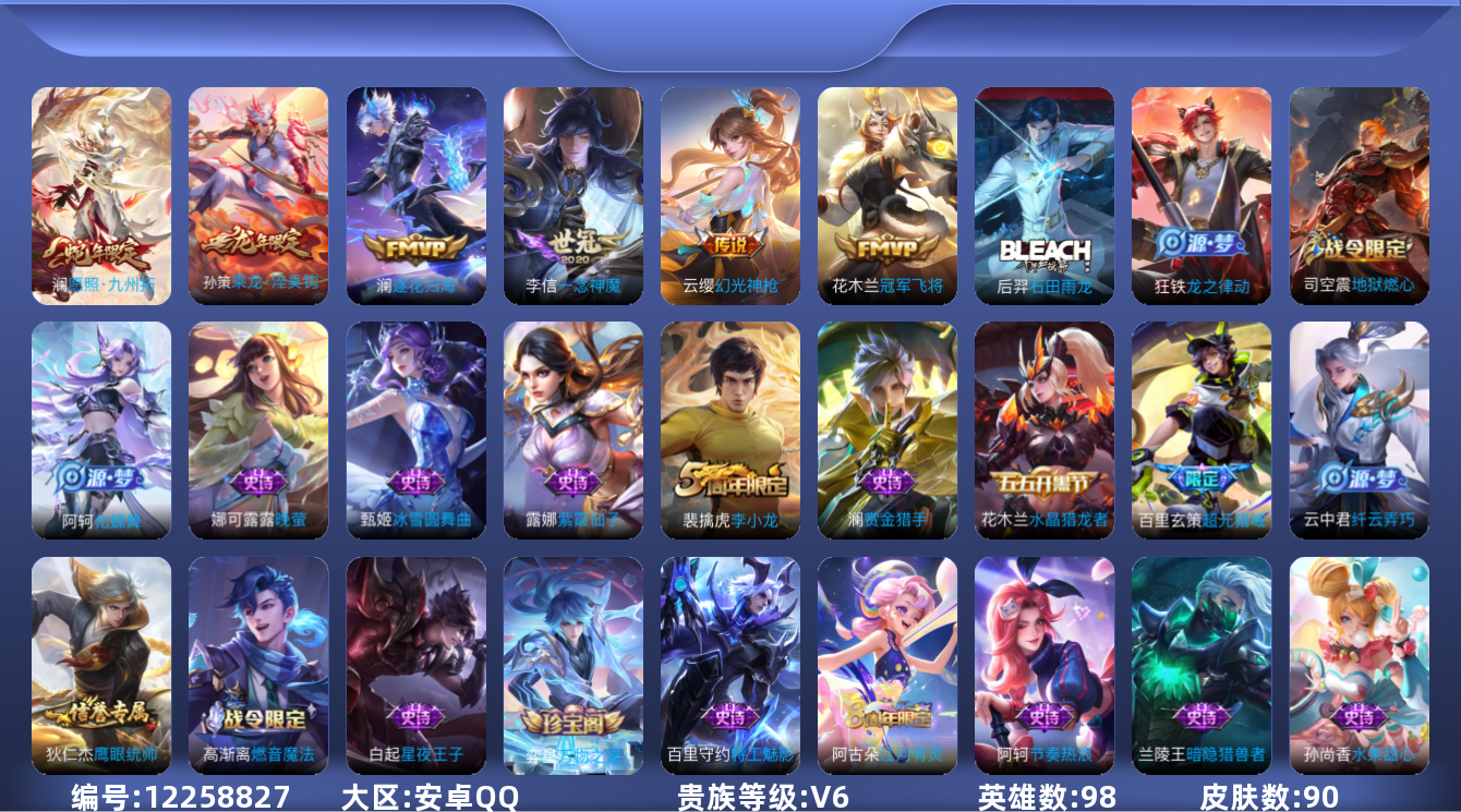 [12258827]V6 6传说 98英雄 90皮肤 可修改实名 优质装备:冠军飞将,一念神魔,澜逐花归海 传说皮:乘龙·淬吴钩(孙策年限),幻光神枪 珍宝阁皮:万物之道 限定皮:愿照·九州拓(澜年限),李小龙 史诗皮:化蝶舞,龙之律动,石田雨龙,超元猎域,紫霞仙子,特工魅影,江河有灵,高渐离燃音魔法,晚萤,节奏热浪,水果甜心,天才门将,星夜王子,暗隐猎兽者,纤云弄巧,水晶猎龙者,金属风暴,鹰眼统帅,魅力维加斯,赏金猎手