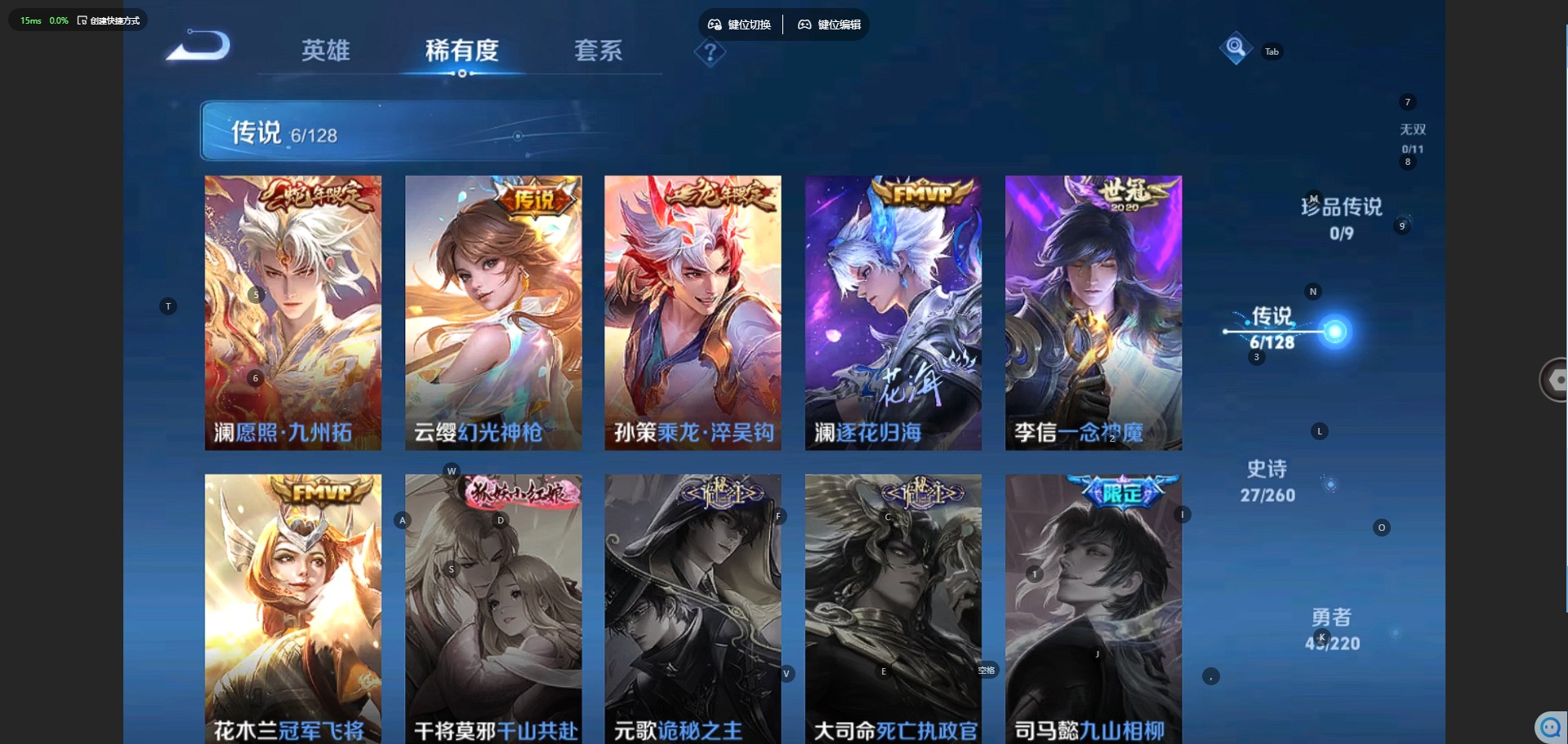- [12295820]V8 7传说 124英雄 171皮肤 可修改实名 女号 优质装备:久胜战神,地狱火 限定皮:鸣野蒿,至尊宝,白虎志(电光耗子),武陵仙君(小桃花),魔法小厨娘,飞衡(韩信年限),青龙志(铠年限),梁祝,御风骁将(吕布年限),岱宗(典韦年限),李小龙,逐梦之光,朱雀志(守约年限),永曜之星,辉光之辰,神奇女侠,美猴王 史诗皮:紫霞仙子,白龙吟,黄金分割率,千年之狐,冰冠公主,晚萤,暗夜猫娘,摇滚巨星,水果甜心,天才门将,星夜王子,心灵骇客,暗隐猎兽者,纤云弄巧,繁星吟游(呼啦呼啦),缤纷独角兽,逐浪之夏,圣诞狂欢,圣诞恋歌,暗夜贵公子,魅力维加斯