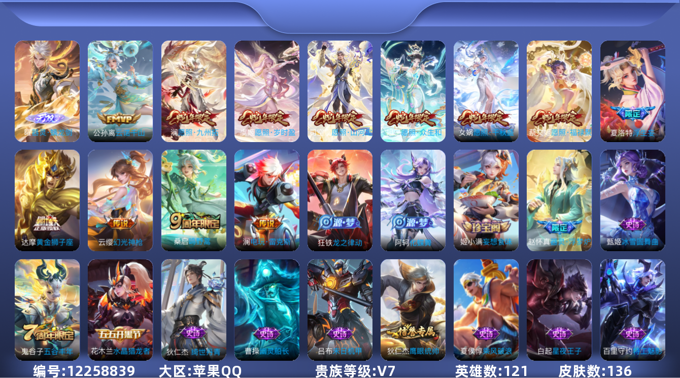 - [10011440]王者荣耀-安卓QQ 贵9 荣耀典藏4 传说皮肤17 史诗皮肤83 皮肤数量253 皮肤价值:243000 英雄124 永恒钻石I 总场次6066 【内测皮肤】2 姬小满_妄想食味 嬴政_优雅恋人 【荣耀皮肤】4 韩信_弑枪猎影 武则天 芈月_大秦宣太后 小乔_天鹅之梦 【传说皮肤】17 桑启_鸣野蒿 兰陵王_影龙天霄 鲁班七号_寅虎瑞焰 裴擒虎_寅虎赤拳 兰陵王_默契交锋 虞姬_启明星使 百里守约_碎云 刘备_时之恋人 梦奇_胖达荣荣 武则天_海洋之心 王昭君_星穹之声 娜可露露_前尘镜 孙悟空_零号赤焰 镜_炽阳神光 貂蝉_猫影幻舞 虞姬_云霓雀翎 张良_黄金白羊座 【史诗皮肤】83 后羿_石田雨龙 刘禅_鸭鸭历险记 狂铁_龙之律动 百里守约_百相守梦 狄仁杰_魔术师 赵云_皇家上将 廉颇_寅虎御盾 孙膑_寅虎展翼 杨玉环_寅虎心曲 牛魔_奔雷神使 瑶_遇见神鹿 伽罗_箭羽风息 铠_曙光守护者 花木兰_水晶猎龙者 黄忠_烈魂 赵云_龙胆 庄周_云端筑梦师 妲己_热情桑巴 阿古朵_江河有灵 鬼谷子_五谷丰年 庄周_高山流水 裴擒虎_李小龙 甄姬_游园惊梦 狂铁_电玩高手 黄忠_火炮绅士 老夫子_航海奇遇记 米莱狄_胡桃异想国 元歌_云间偶戏 蒙犽_狂想玩偶喵 马可波罗_暗影游猎 阿轲_迷踪丽影 鲁班大师_匿光启智者 孙膑_天狼运算者 金蝉_唐三藏 猪八戒_猪悟能 阿古朵_顽趣 弈星_滕王阁序 庄周_天秀幻梦 高渐离_天秀音浪 钟馗_乐园奇幻夜 沈梦溪_月团寄思 杨戬_天秀启明 蒙犽_龙鼓争鸣 孙尚香_时之恋人 娜可露露_晚萤 大乔_猫狗日记 阿轲_节奏热浪 白起_星夜王子 程咬金_功夫厨神 李元芳_逐浪之夏 刘禅_天才门将 蔡文姬_舞动绿茵 百里守约_特工魅影 安琪拉_心灵骇客 雅典娜_冰冠公主 亚瑟_心灵战警 兰陵王_暗隐猎兽者 小乔_缤纷独角兽 刘邦_德古拉伯爵 吕布_末日机甲 曹操_幽灵船长 阿轲_暗夜猫娘 妲己_女仆咖啡 妲己_魅力维加斯 貂蝉_圣诞恋歌 宫本武藏_鬼剑武藏 廉颇_地狱岩魂 鲁班七号_电玩小子 吕布_圣诞狂欢 墨子_金属风暴 墨子_龙骑士 孙尚香_水果甜心 王昭君_偶像歌手 甄姬_冰雪圆舞曲 蒙犽_百解令 嫦娥_拒霜思 云中君_纤云弄巧 蔡文姬_繁星吟游 雅典娜_黎明之约 张飞_乱世虎臣 狄仁杰_鹰眼统帅