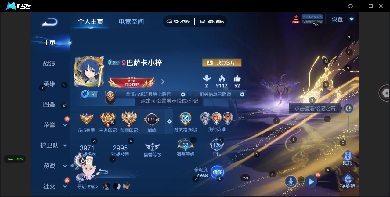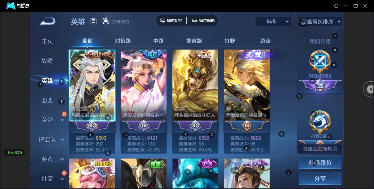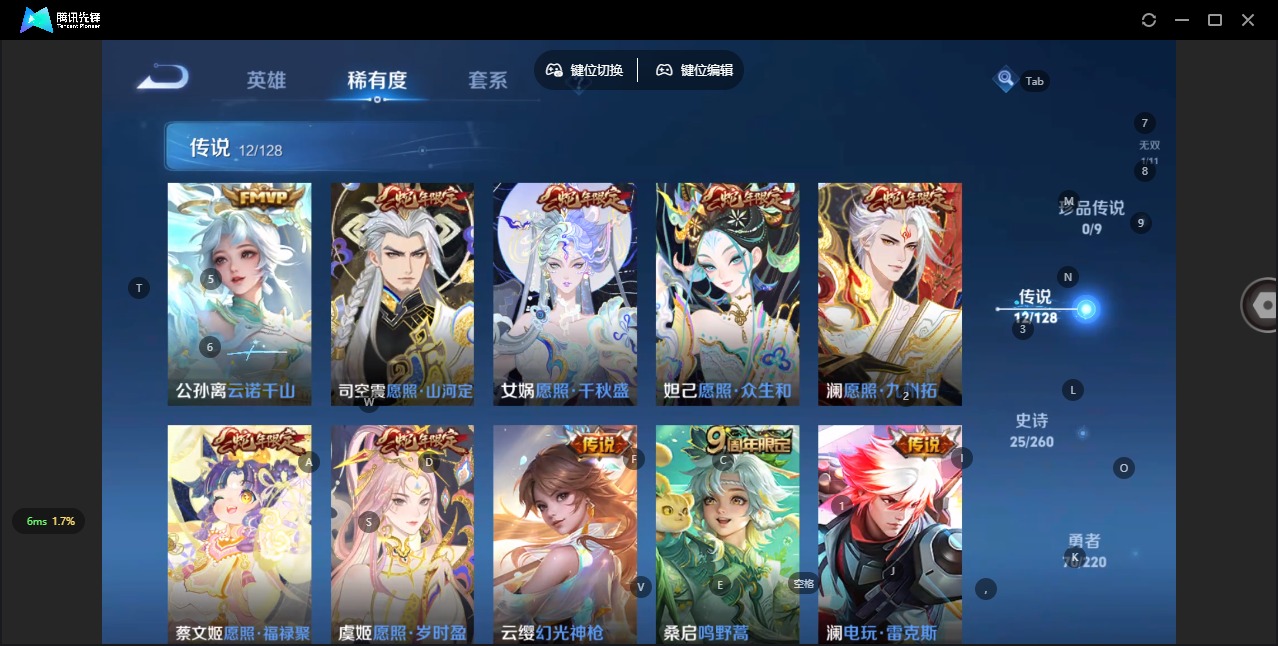 - [12089707]V6 4传说 71英雄 77皮肤 可修改实名 安全保护中 优质装备:绛天战甲(鸡嘴战神),末日机甲-孙尚香(绿蚂蚱),地狱之眼 限定皮:至尊宝,时雨天司(水龙头),霸王别姬-虞姬,孙行者,乒乒小将 史诗皮:苍穹之光,黄金分割率,百解令(蒙犽),节奏热浪,女仆咖啡,水果甜心,鬼剑武藏,地狱岩魂,逐浪之夏,曙光守护者,金属风暴,圣诞狂欢,鹰眼统帅,黎明之约