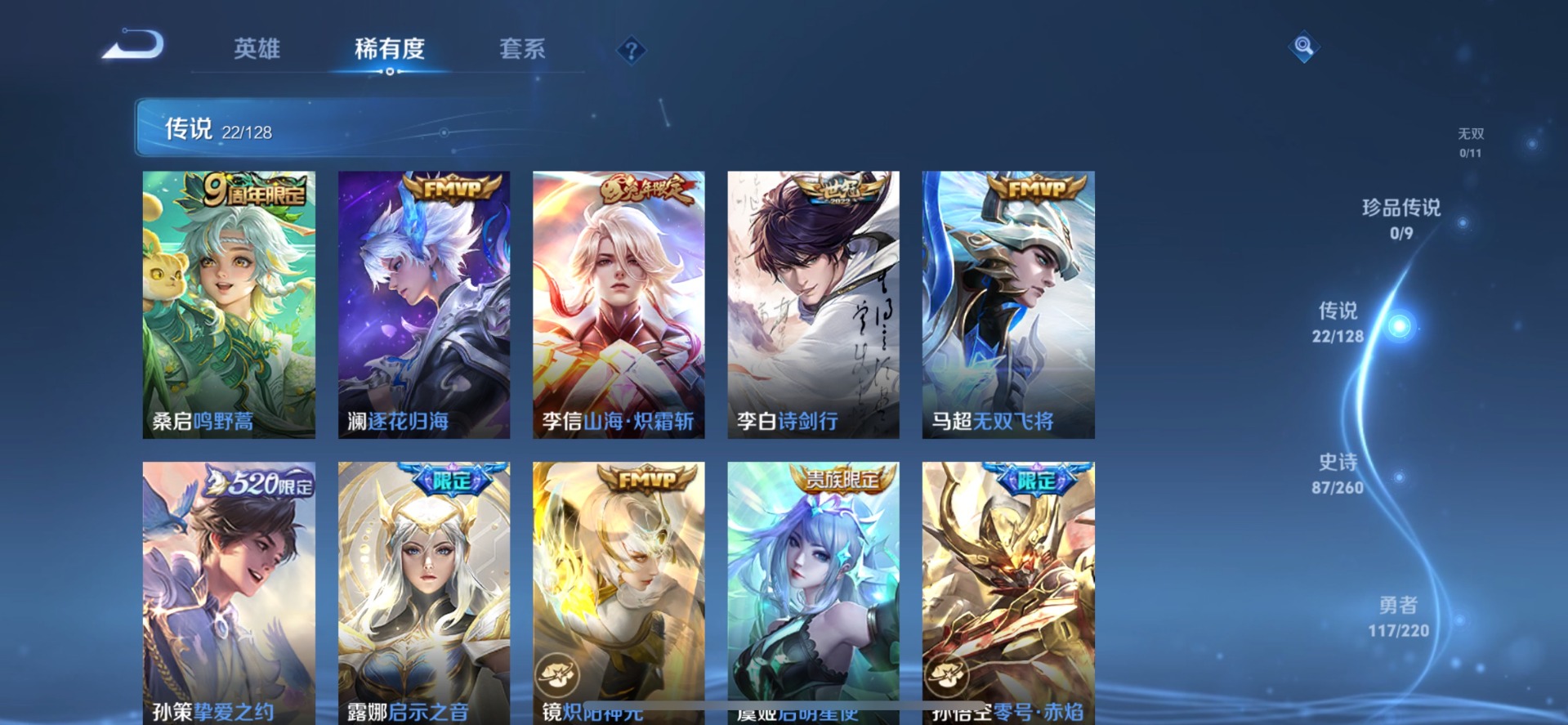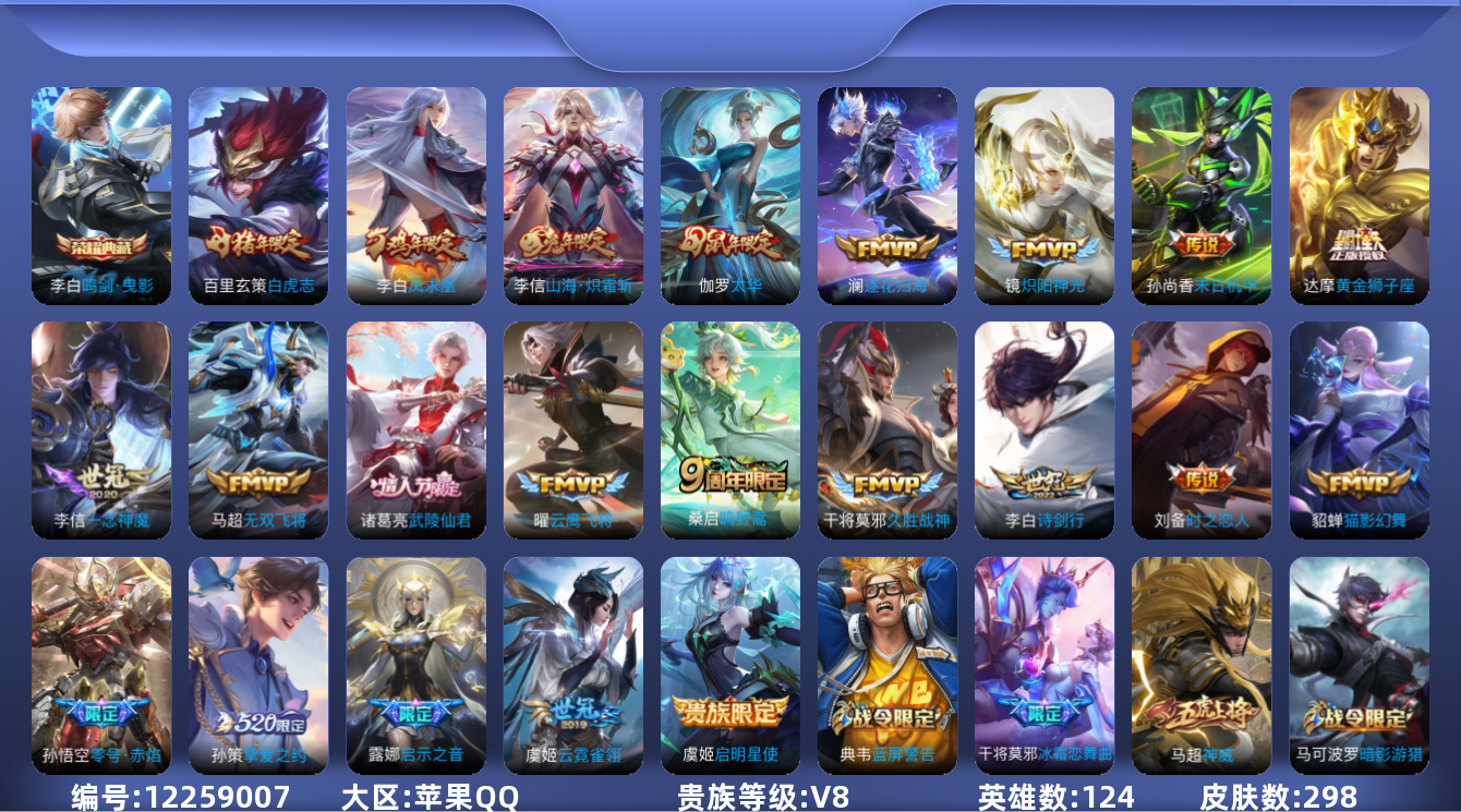 [12259007]V8 1典藏 22传说 124英雄 298皮肤 可修改实名 优质装备:鸣剑·曳影,黄金狮子座,云鹰飞将(小将军),猫影幻舞,久胜战神,炽阳神光,一念神魔,云霓雀翎,末日机甲-孙尚香(绿蚂蚱),零号·赤焰,时之恋人-刘备(电焊工),挚爱之约,无双飞将,山海·炽霜斩(李信年限),澜逐花归海 珍宝阁皮:妄想食味,优雅恋人,女武神 限定皮:鸣野蒿,白虎志(电光耗子),凤求凰(白切鸡),凤凰于飞,太华(伽罗年限),武陵仙君(小桃花),神威(电光马子),飞衡(韩信年限),遇见飞天,高山流水,诗剑行,五谷丰年,冰锋战神,游园惊梦,梁祝,烈魂,天狼征服者,天狼绘梦者,李小龙,如梦令-嫦娥,如梦令-后羿,一生所爱,大圣娶亲,冰霜恋舞曲,启示之音 史诗皮:紫霞仙子,黄金分割率,特工魅影,千年之狐,永昼,江河有灵,魅语,蒙恬荣光圣徽,无限星赏官,偶像歌手,晚萤,电玩·爆裂旋风,龙骑士(小龙虾),末日机甲-吕布,猫狗日记-孙策,猫狗日记-大乔,乱世虎臣,节奏热浪,修罗,女仆咖啡,摇滚巨星,水果甜心,天才门将,星夜王子,心灵骇客,功夫厨神,德古拉伯爵,暗隐猎兽者,幽灵船长,鬼剑武藏,心灵战警,地狱岩魂,纤云弄巧,繁星吟游(呼啦呼啦),拒霜思,缤纷独角兽,乘风破浪,逐浪之夏,水晶猎龙者,曙光守护者,箭羽风息,金属风暴,原初追逐者,圣诞狂欢,圣诞恋歌,鹰眼统帅,王者之锤,暗夜贵公子,魅力维加斯,黎明之约,赏金猎手,无心