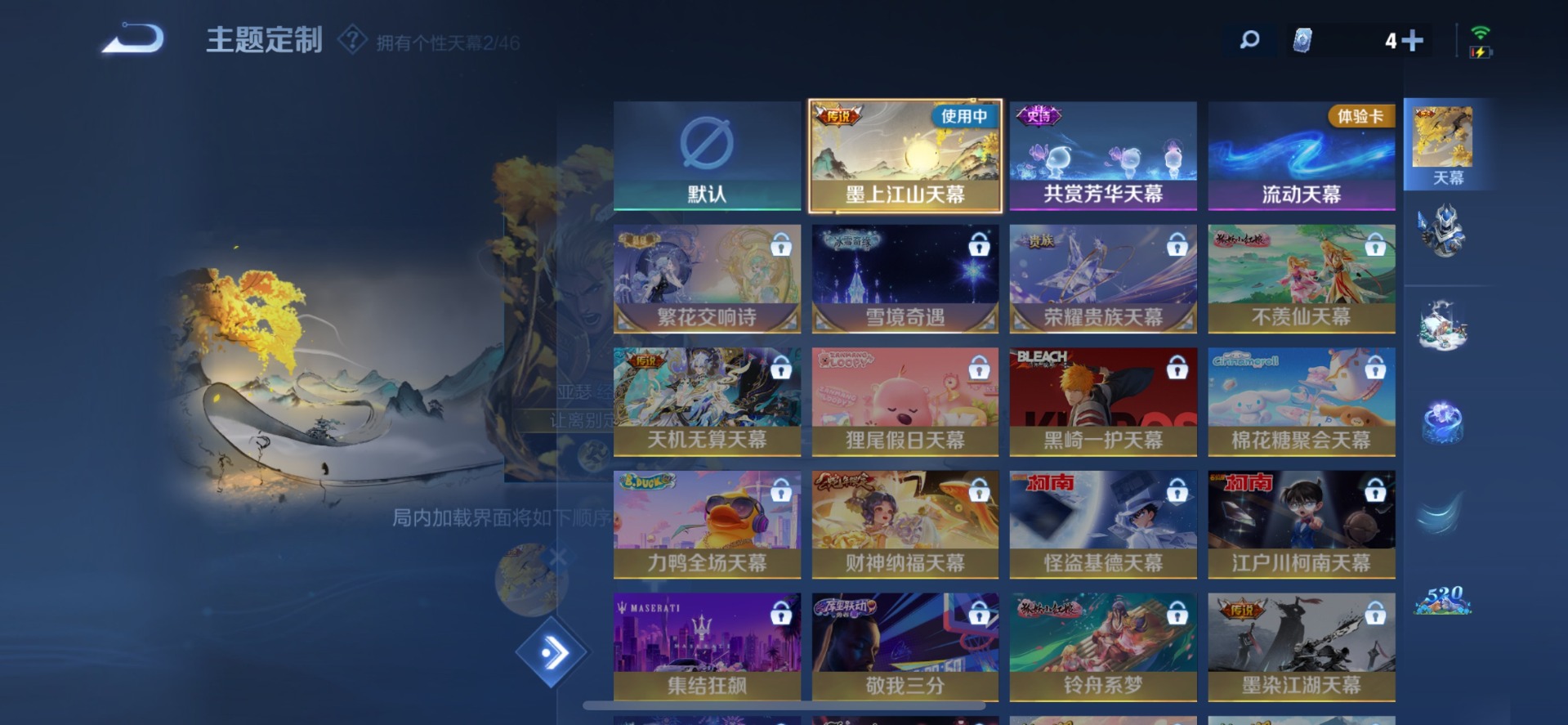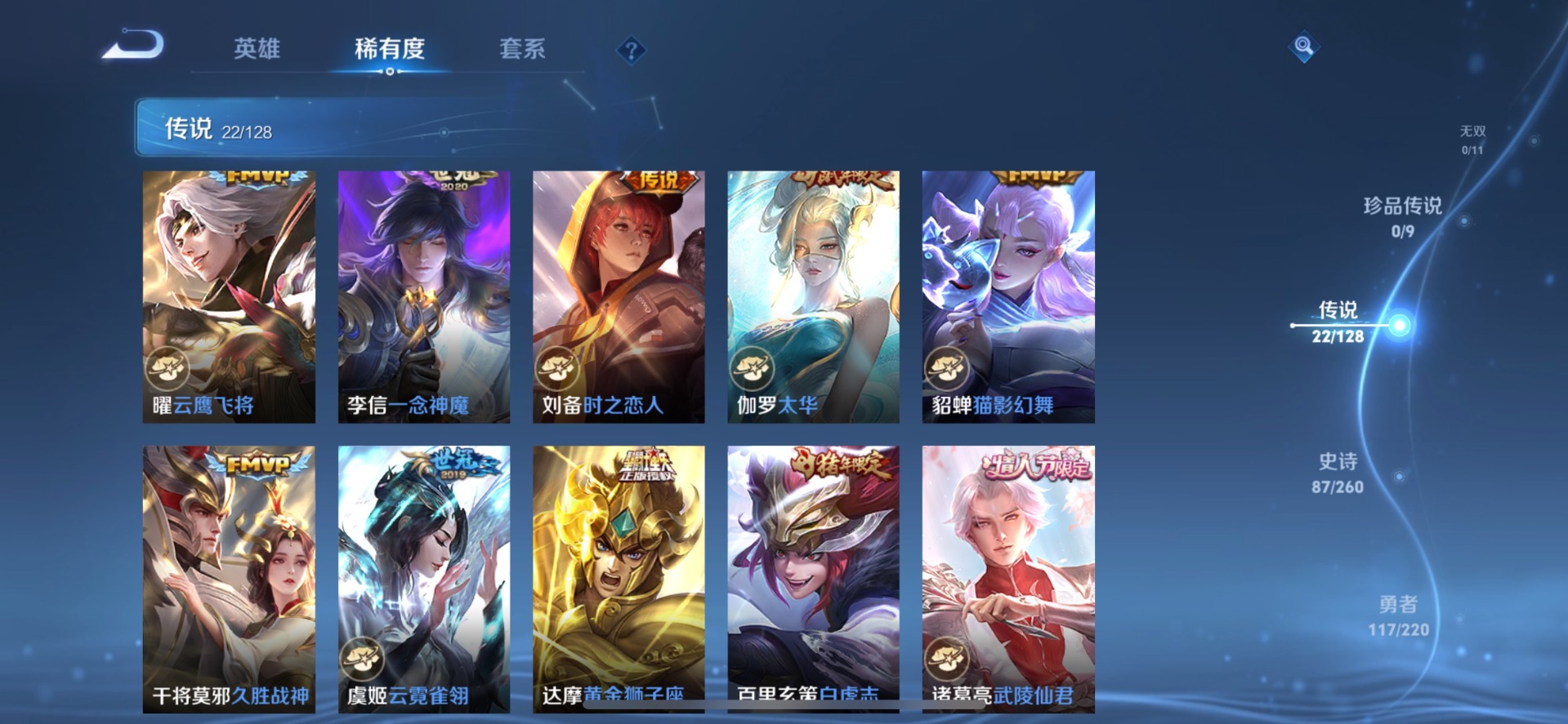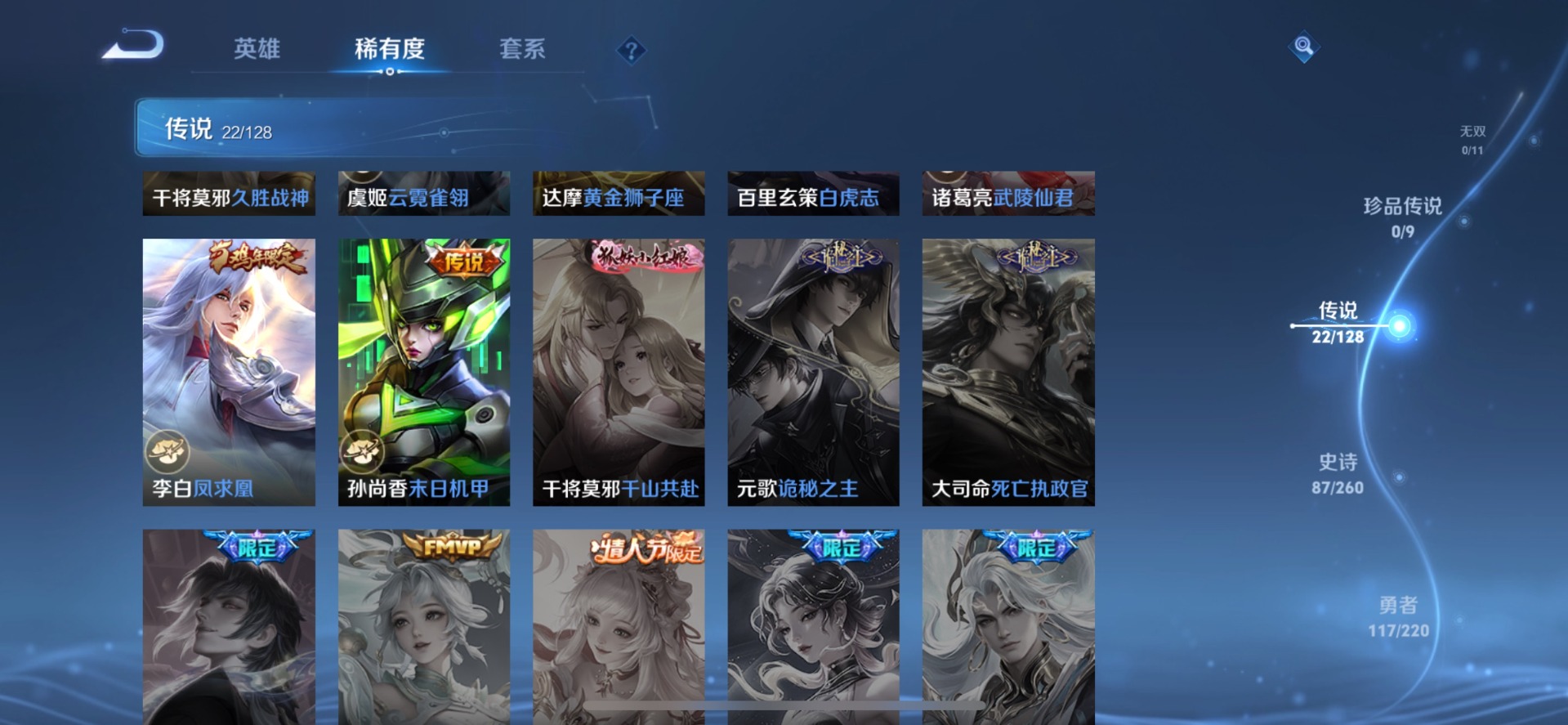 黄忠烈魂,曹操天狼征服者,伽罗太华,干将莫邪冰霜恋舞曲,后羿如梦令,露娜启示之音,露娜一生所爱,裴擒虎李小龙,上官婉儿梁祝,上官婉儿天狼绘梦者,李白诗剑行,桑启鸣野蒿,孙悟空大圣娶亲,百里玄策白虎志,马超神威,韩信飞衡,嫦娥如梦令,王昭君凤凰于飞,关羽冰锋战神