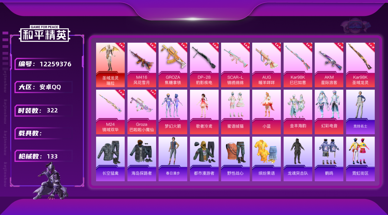 [12259376]1红装 6粉装 10特效枪 8印记 可二次 可修改实名 优质装备:圣域龙灵-瑞拉,一级圣域龙灵-瑞拉(1级瑞拉),梦幻火箭(新101)(新火箭少女101粉色套装),M416风花雪月,GROZA焦糖拿铁,AKM星际浪客,SCAR-L-锦绣绵绵,M24镜域双华,Groza巴啦啦小魔仙,七级GROZA-焦糖拿铁,七级M416-风花雪月,AUG-暖羊咩咩,Kar98K-圣域龙灵,幻彩电音,Kar98K-巳巳如意 热门装扮:歌者泠鸢,蜜语绒猫,小蓝,金丰海韵 稀有枪皮:DP-28-豹影疾电 五级特效枪:五级Kar98K-巳巳如意,五级DP-28-豹影疾电,五级AUG-暖羊咩咩,五级SCAR-L-锦绣绵绵 四级特效枪:四级AKM-星际浪客 三级特效枪:三级Kar98K-圣域龙灵,三级M24-镜域双华 一级特效枪:一级GROZA-巴啦啦小魔仙 紫色装扮:田园牧歌,轻风白浪,和煦暖阳,SS22特训,SS23特训,摩登艾咪,龙舌兰冰茶,SS21特训,紫芒星,SS31特训套装,SS30特训套装,SS33特训套装,顶瓜瓜,吉莉礼服,浓情摩卡,魔力冰咖,都市漫游者,野性战心,长空猛禽,霓虹街区,缤纷果语,飞行日记,鹤鸣,龟仙人,冰河战士,龙魂突击队,蝶变,香桃花海,荒原牛仔,云鹰凌岚,柠萌假日,海岛探路者,空岛之星,王牌教练,SS29特训,星途旅人,白光莹,纯真浪花,热情海星,曼妙人鱼,SS28特训,冰公主,异域银装,鱼渊荷华,玉兔迎春,燕燕于飞,巳巳如意,竞技名士,摩登魅猫,街头风暴,银尘,情公主,SS24特训(SS24特训套装),湖泊玉兰,焰鹰斗篷,幻羽潜行,幽夜迷踪,SS27特训,无暇誓言,童真绒兔,萌趣绒叽,SS26特训,春光漫游,快闪甜心,贝斯之夜,智谋强哥,大橘大利,星渊小夜曲,星影赞美诗,春日漫步,粉恋花,蓝冰羽,紫幽梦,SS32特训服(SS32特训套装),青玉碎影,萌黄之夏,暗夜风云,纯白跃动,蓝调潮影,糖霜甜心,恋语绒绒,光之冒险,幽幻花璃 优质战备:精灵梦叶罗丽降落伞,星途旅人降落伞,深渊漩涡飞行器,宇宙意志降落伞,金丰海韵降落伞,千金淑猫降落伞,绝色倾城降落伞,镜域双华降落伞,镜域双华-灵镜之阶,蜜语绒猫降落伞,沙丘之主降落伞,智耀战神降落伞,圣域龙灵降落伞,圣域金龙飞行器,纯梦嫁纱降落伞,梦幻火箭降落伞