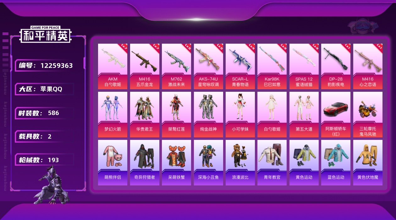 [12259363]7粉装 9特效枪 2载具 8印记 可二次 可修改实名 身法装备:萌熊伴侣背包(粉熊背包) 优质装备:阿斯顿·马丁DBS(红),萌熊伴侣背包(粉熊背包),M416五爪金龙,M416心之恋语,奇异狩猎者,梦幻火箭(新101)(新火箭少女101粉色套装),M762激战未来,绚金战神,华贵君王,SCAR-L青春物语,AKM白勺歌姬,SPAS-12蜜语绒猫,七级AKM-白勺歌姬,七级M416-五爪金龙,AKS-74U-星穹咏叹调,Kar98K-巳巳如意 热门装扮:桀骜红莲,第五大道,白勺歌姬,小可学妹,呆萌铁蟹,深海小丑鱼,浪漫波比,萌熊伴侣 载具:鬼马风驰 稀有枪皮:DP-28-豹影疾电 五级特效枪:五级M762-激战未来,五级AKS-74U-星穹咏叹调 四级特效枪:四级Kar98K-巳巳如意,四级SPAS-12-蜜语绒猫,四级SCAR-L-青春物语 一级特效枪:一级M416-心之恋语,一级DP-28-豹影疾电 紫色装扮:SS22特训,SS23特训,SS21特训,SS31特训套装,人气偶像,伏击者,冰川特警,冷焰舞者,北国孤狼,千禧之恋,旭日情侣,SS30特训套装,云朵鹅,雪绒豹,SS33特训套装,青涩时光,顶瓜瓜,SS20特训,青春冒险家,潮流游乐家,SS15特训,暗夜傀儡,时空追击者,暴风机械师,SS16特训,冰爽海盐,银白舞王,SS13特训,治愈之星,科技之星,SS14特训,萌趣颜团子,特种颜团子,飞驰魅影,音速流光,极速竞梦,SS19特训,雪兔飞飞,SS17特训,异彩先驱,SS18特训,酒红色名流,长空猛禽,霓虹极客,青年教官,缤纷果语,耀眼新星,蓝彩潮人,蓝色运动,虎虎生威吉莉,超能勇士,跃动心情,绛羽幽主,飞行日记,鹤鸣,麻辣教官,黄色伏地魔,黄色运动,黑色伏地魔,龙的传人,冰河战士,龙魂突击队,蝶变,香桃花海,极地朋克,柠萌假日,格斗先锋,沙漠兵团,滨海假日,娴静芝兰,夏日音浪,夜莺强袭者,完美偶像,帅气教官,幻世战舞者,怒火燎原,战地菁英,探宝勇士,湖蓝色名流,滨海厨神,绮丽涂鸦,疯狂小兔子,白色伏地魔,破蛋小黄鸡,福星高照,空岛之星,空投萌叽,竞技勇士朋克,竞技达人朋克,甜蜜熊情侣,牛气冲天,炫蓝之夏,热血青春,牛气满满,镭射皇者,静谧青瓷,雏菊兔兔,萝兰蝴蝶,SS29特训,纯真浪花,热情海星,曼妙人鱼,霓彩节奏,玉兔迎春,竞技名士,街头风暴,SS24特