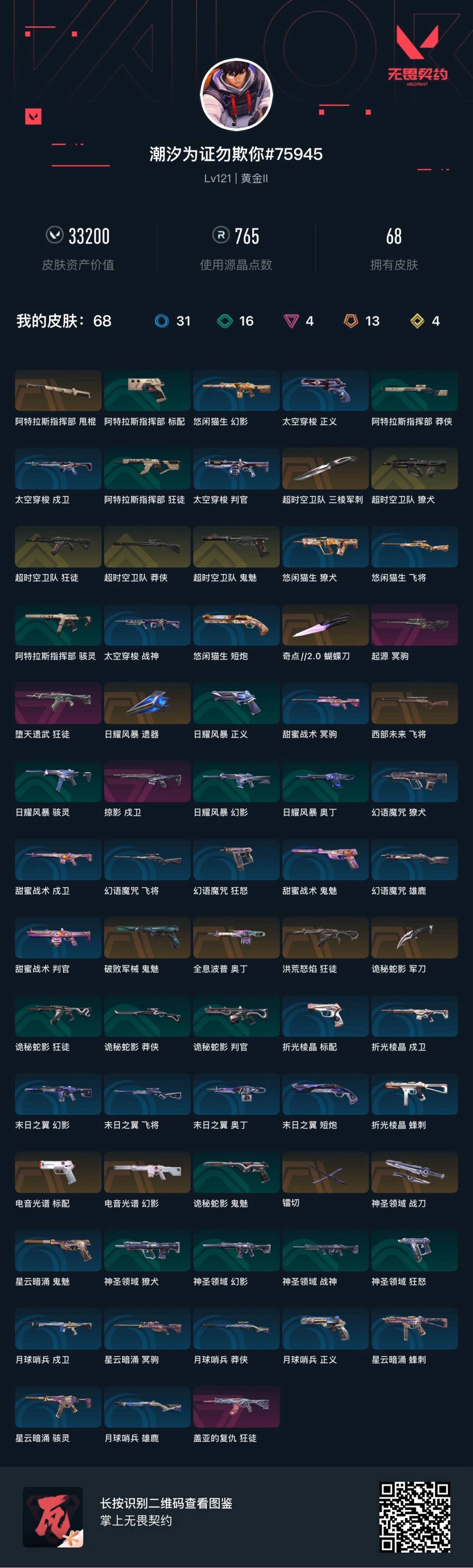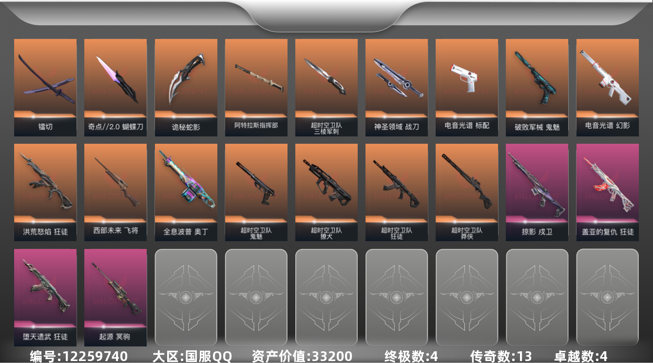 [12259740]13橙皮 4金皮 4紫皮 68皮肤 26英雄 77卡面 765已用源晶 黄金 优质装备:狂徒-盖亚的复仇,狂徒-洪荒怒焰,戍卫-掠影,冥驹-起源,奥丁-全息波普,鬼魅-破败军械,蝴蝶刀-奇点//2.0,镭切,神圣领域 战刀,诡秘蛇影,超时空卫队 三棱军刺,阿特拉斯指挥部 套装:超时空卫队 佩枪皮肤:标配-电音光谱,鬼魅-超时空卫队 步枪皮肤:幻影-电音光谱,獠犬-超时空卫队,狂徒-超时空卫队,狂徒-堕天遗武 狙击枪皮肤:飞将-西部未来,莽侠-超时空卫队