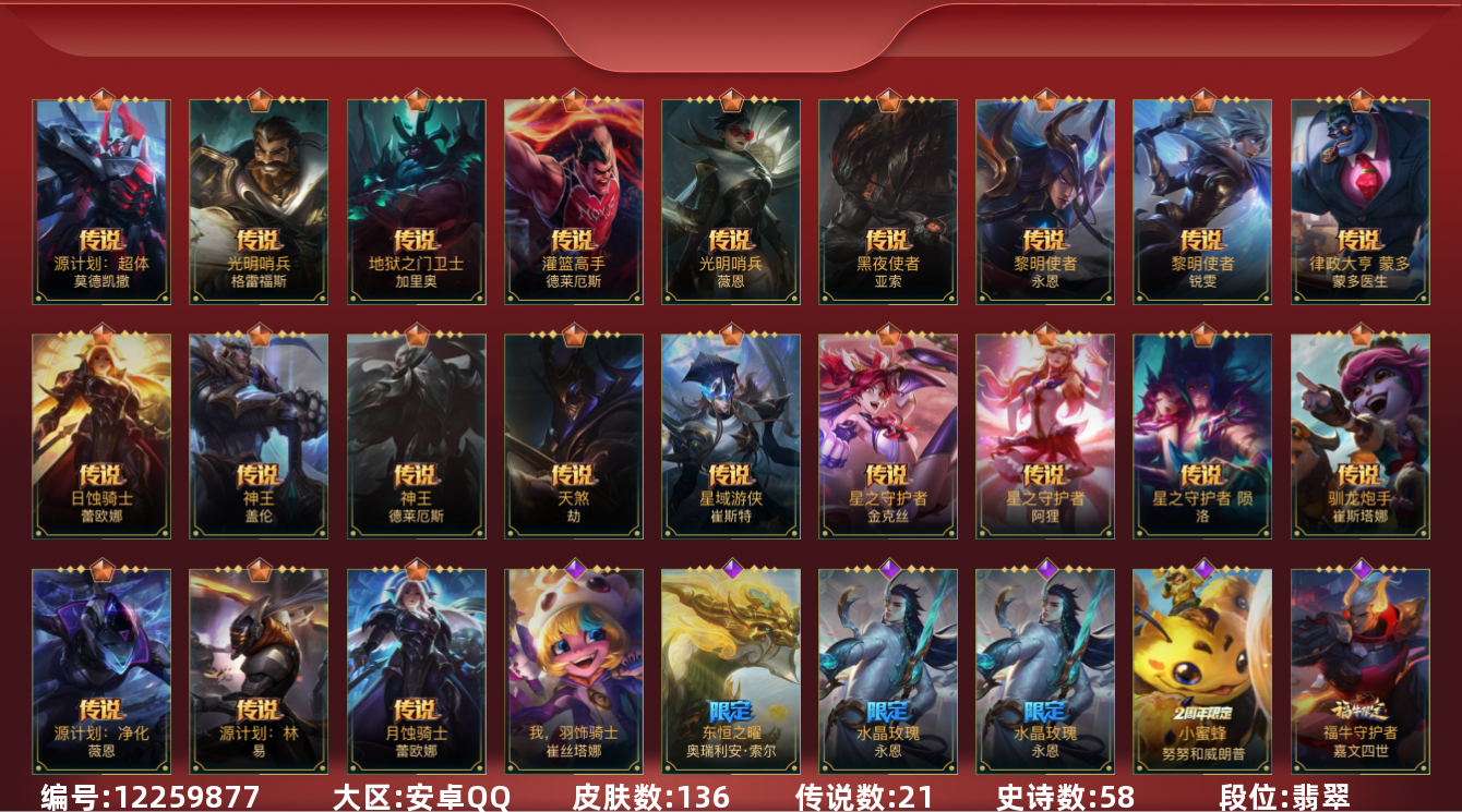 [12259877]1限定 21传说 58史诗 136皮肤 可二次 可修改实名 优质装备:灌篮高手,光明哨兵薇恩,黑夜使者亚索,黎明使者锐雯,律政大亨,日蚀骑士蕾欧娜,神王盖伦,神王诺手,天煞劫,星域游侠卡牌,星之守护者金克丝,星之守护者阿狸,星之守护者 陨,驯龙炮手,源计划:净化,月蚀骑士蕾欧娜,源计划:林,光明哨兵格雷福斯 段位:翡翠 限定皮肤:水晶玫瑰永恩 传说皮:源计划:超体,地狱之门卫士,黎明使者永恩 亮点:暗星尊,灌篮高手,炼狱魔犬,神拳盲僧,神王诺手