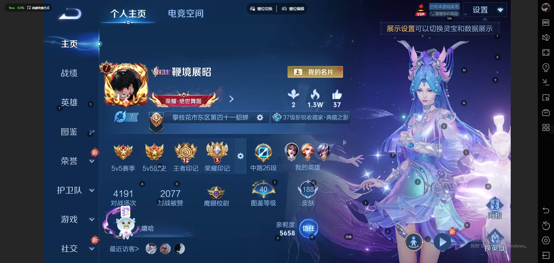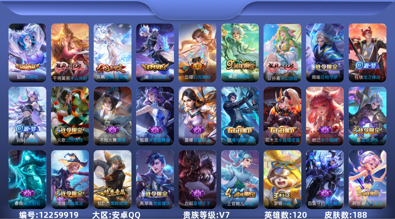 [12259919]V7 1典藏 5传说 120英雄 188皮肤 可修改实名 优质装备:幻阙歌(貂蝉典藏),澜逐花归海,千山共赴,涂山容容 传说皮:幻光神枪 珍宝阁皮:胡桃夹子 限定皮:愿照·千秋盛(女娲年限),逐霄战戟,鸣野蒿,梁祝 史诗皮:化蝶舞,星界战将,龙之律动,百相守梦-周瑜,茶境仙,上官婉儿群星魔术团,蔬乡物语(鲁班七号),紫霞仙子,特工魅影,江河有灵,魅语,高渐离燃音魔法,蒙恬荣光圣徽,偶像歌手,乱世虎臣,节奏热浪,女仆咖啡,水果甜心,天才门将,星夜王子,功夫厨神,德古拉伯爵,暗隐猎兽者,幽灵船长,鬼剑武藏,心灵战警,地狱岩魂,逐浪之夏,水晶猎龙者,曙光守护者,唤灵魅影,金属风暴,圣诞恋歌,鹰眼统帅,魅力维加斯,黎明之约