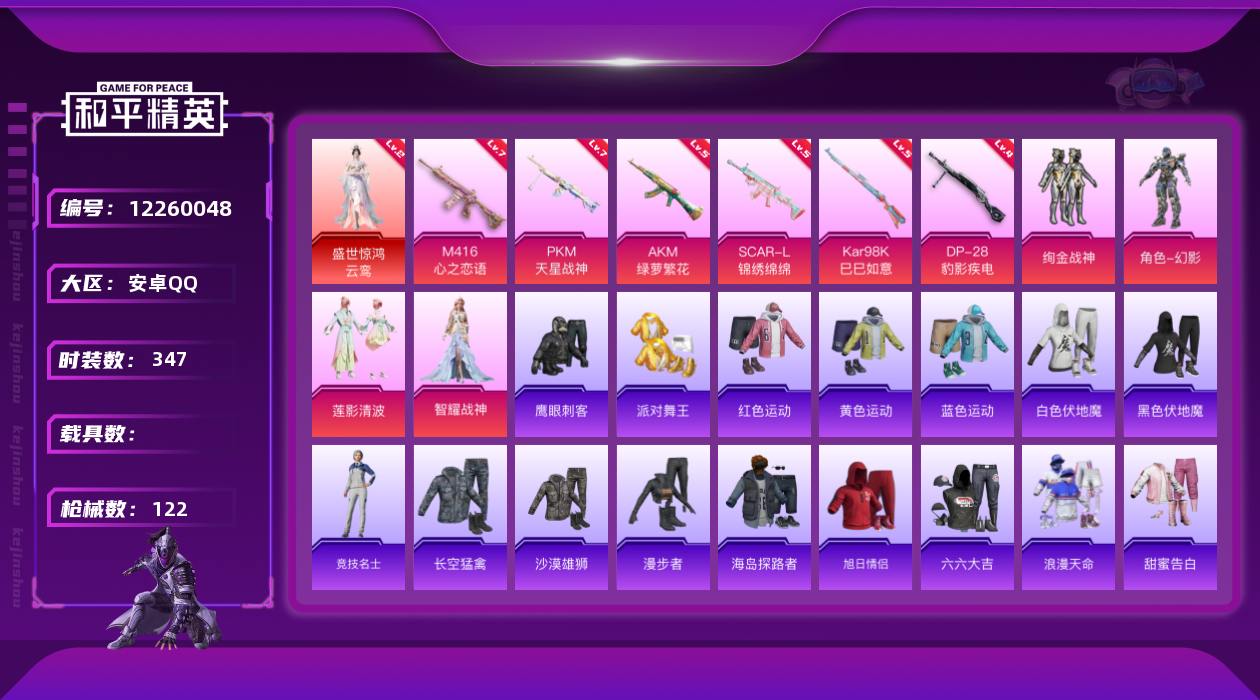 [12260048]1红装 4粉装 6特效枪 7印记 可二次 可修改实名 身法装备:舞王派对(派对舞王、小金鞋) 优质装备:盛世惊鸿-云鸾,二级盛世惊鸿-云鸾(2级云鸾),舞王派对(派对舞王、小金鞋),M416心之恋语,绚金战神,PKM天星战神,AKM绿萝繁花,SCAR-L-锦绣绵绵,七级PKM-天星战神,七级M416-心之恋语,智耀战神,Kar98K-巳巳如意 热门装扮:幻影,莲影清波,鹰眼刺客,派对舞王(小金鞋) 稀有枪皮:DP-28-豹影疾电 五级特效枪:五级Kar98K-巳巳如意,五级SCAR-L-锦绣绵绵,五级AKM-绿萝繁花 四级特效枪:四级DP-28-豹影疾电 紫色装扮:SS31特训套装,六六大吉,旭日情侣,SS30特训套装,SS33特训套装,青涩时光,顶瓜瓜,竞技角斗士,天籁歌者,长空猛禽,霓虹街区,缤纷果语,耀眼新星,荣耀,蓝色运动,街头潮人,超能勇士,黄色运动,黑色伏地魔,龙的传人,龟仙人,冰河战士,龙魂突击队,蝶变,沙漠雄狮,海岛探路者,涂山之恋,坚韧舞者,夏日倾情,白色伏地魔,破蛋小黄鸡,甜蜜告白,空岛之星,红色运动,灰色格斗者,热血青春,雏菊兔兔,萝兰蝴蝶,SS29特训,星途旅人,白光莹,SS28特训,异域银装,鱼渊荷华,燕燕于飞,巳巳如意,森林游猎者,青团波波,糖糖葫芦,棉花软糖,竞技名士,临安公主,怀庆长公主,深海梦境,惊鸿侠骨,神气柴柴,懵萌河马,SS24特训(SS24特训套装),SS25特训,绝对偶像,金戈铁马,锦衣飞扬,星际旅行,焰鹰斗篷,幻羽潜行,幽夜迷踪,SS27特训,萌趣绒叽,浪漫天命,小丑鱼,晨曦薄雾,SS26特训,春光漫游,快闪甜心,贝斯之夜,智谋强哥,大橘大利,星渊小夜曲,粉恋花,蓝冰羽,紫幽梦,SS32特训服(SS32特训套装),青玉碎影,绯格组合,新风雅兰,恋语绒绒,漫步者,冰冻风暴 优质战备:圣堂之誓降落伞,创世·救赎降落伞,金丰海韵降落伞,镜光幻境降落伞,超新星降落伞,盛世惊鸿降落伞,凤舞九天飞行器,临安公主降落伞,智耀战神降落伞,桃粉嫣然降落伞,炫光之旅降落伞