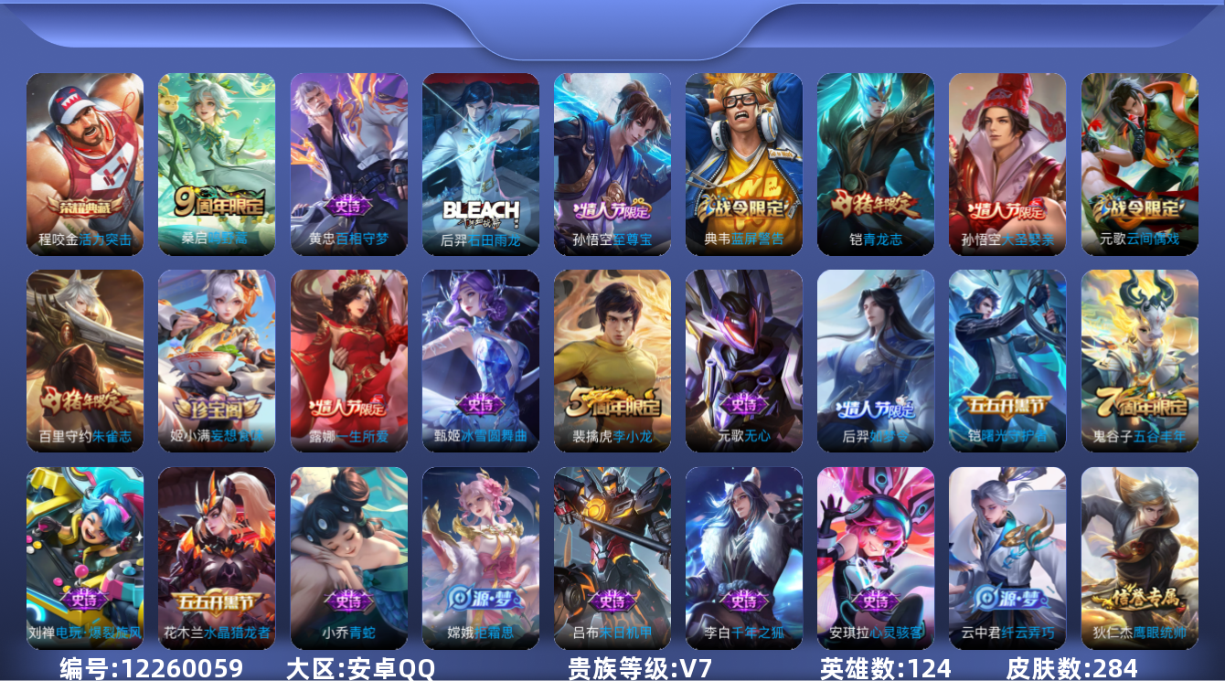 - [12032153]V10 11典藏 37传说 124英雄 253皮肤 典藏英雄武则天 可修改实名 优质装备:天鹅之梦(小乔典藏),星空梦想(太空人),倪克斯神谕(宇宙婆娘),活力突击,杀手不太冷,大秦宣太后,鸣剑·曳影,全息碎影(猴子典藏),星域神启(倪克斯贼亮),九霄神辉(木兰典藏),赤影疾锋,黄金狮子座,黄金射手座,冠军飞将,云鹰飞将(小将军),绛天战甲(鸡嘴战神),黄金白羊座,猫影幻舞,久胜战神,炽阳神光,一念神魔,云霓雀翎,末日机甲-孙尚香(绿蚂蚱),仲夏夜之梦(大飞蛾),零号·赤焰,海洋之心,地狱之眼,胖达荣荣,乞巧织情,时之恋人-刘备(电焊工),淬星耀世,超时空战士-狄仁杰,末日机甲-孙策,碎云,神器·狴犴令,艾琳觅芳踪 珍宝阁皮:妄想食味 限定皮:武陵仙君(小桃花),异界灵契(白毛香),傲雪梅枪,补天,寅虎·展翼(孙膑年限),星穹之声,绯月行,时雨天司(水龙头),五谷丰年,武圣,如梦令-嫦娥,如梦令-后羿,真爱至上,纯白花嫁,孙行者,一生所爱,青春决赛季,匿光追影者,女儿国国王,寅虎·御盾(廉颇年限),寅虎·瑞焰(虎皮蛋子),寅虎·心曲(虎婆),寅虎·赤拳(老虎年限),时之祈愿-云中君,时之祈愿-瑶(瑶传限),百木心枪,玉兔公主,启示之音,匿光启智者,时之奇旅-妲己,神器·万象笔,梦圆繁星 史诗皮:龙之律动,百相守梦-黄忠,紫霞仙子,苍穹之光,电玩小子(小书包),白龙吟,黄金分割率,特工魅影,千年之狐,偶像歌手,龙骑士(小龙虾),暗夜猫娘,魅语,无限星赏官,冰冠公主,末日机甲-吕布,猫狗日记-孙策,猫狗日记-大乔,时之恋人-孙尚香,乱世虎臣,节奏热浪,修罗,女仆咖啡,摇滚巨星,水果甜心,绅士熊喵,天才门将,星夜王子,心灵骇客,时之奇旅-安琪拉,功夫厨神,暗隐猎兽者,幽灵船长,鬼剑武藏,暗渊魔法,心灵战警,乐园奇幻夜,天秀·启明,舞动绿茵,地狱岩魂,缤纷独角兽,乘风破浪,逐浪之夏,龙鼓争鸣,月团寄思,水晶猎龙者,曙光守护者,热力回旋,箭羽风息,唤灵魅影,金属风暴,圣诞狂欢,圣诞恋歌,暗夜贵公子,魅力维加斯,雪上飞焰,寅虎·御盾,无心,未来纪元-赵云