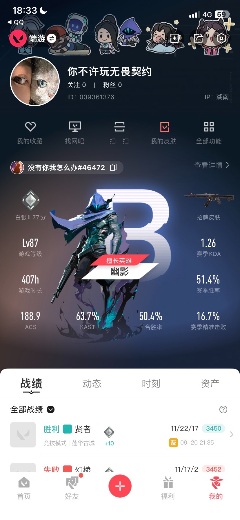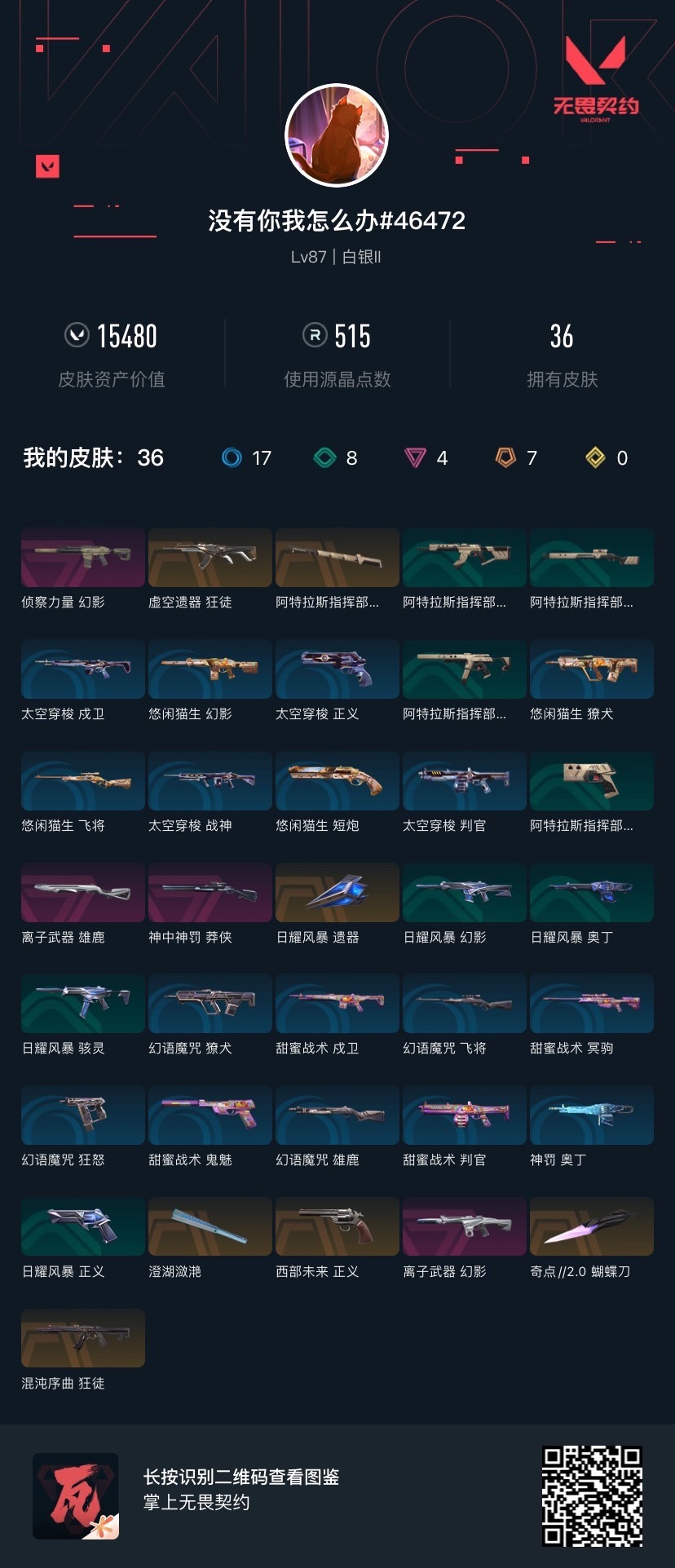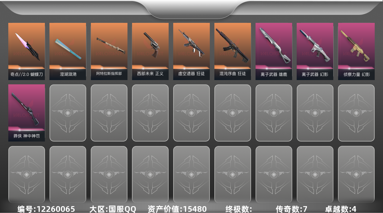 [12260065]7橙皮 4紫皮 36皮肤 24英雄 67卡面 515已用源晶 白银 优质装备:狂徒-混沌序曲,幻影-侦察力量,幻影-离子武器,澄湖潋滟,蝴蝶刀-奇点//2.0,阿特拉斯指挥部,雄鹿-离子武器 佩枪皮肤:正义-西部未来 步枪皮肤:狂徒-虚空遗器 狙击枪皮肤:莽侠-神中神罚