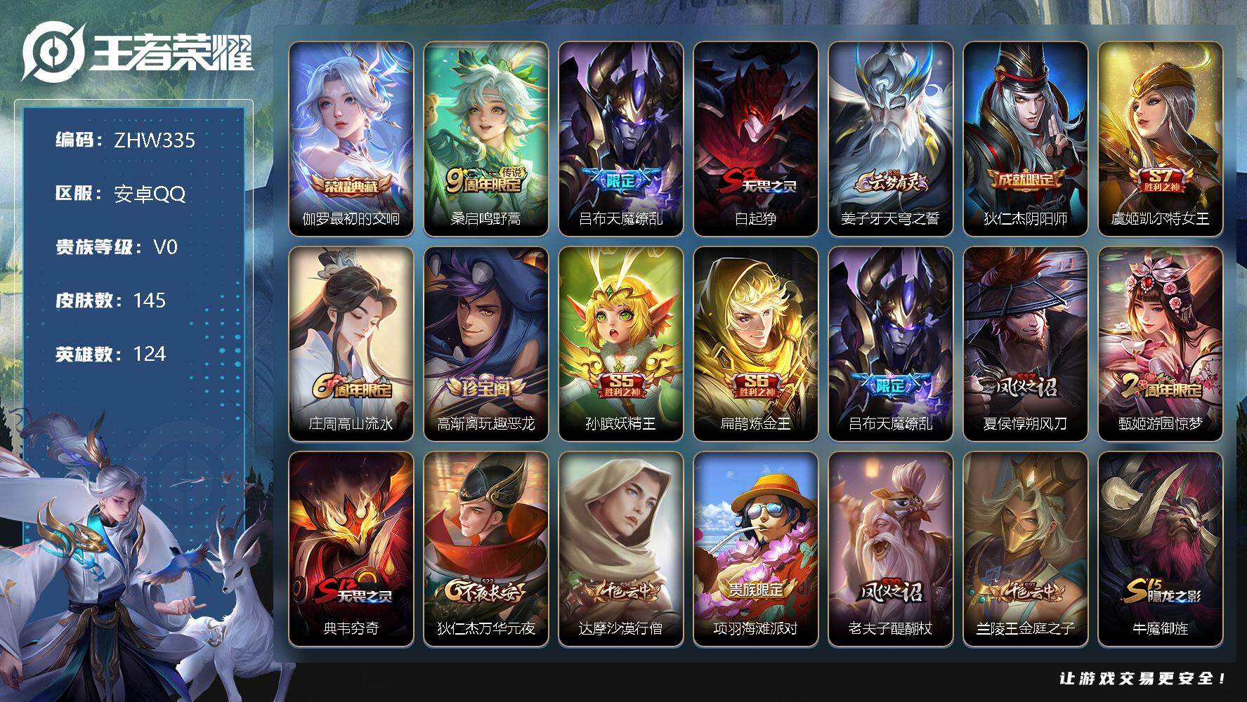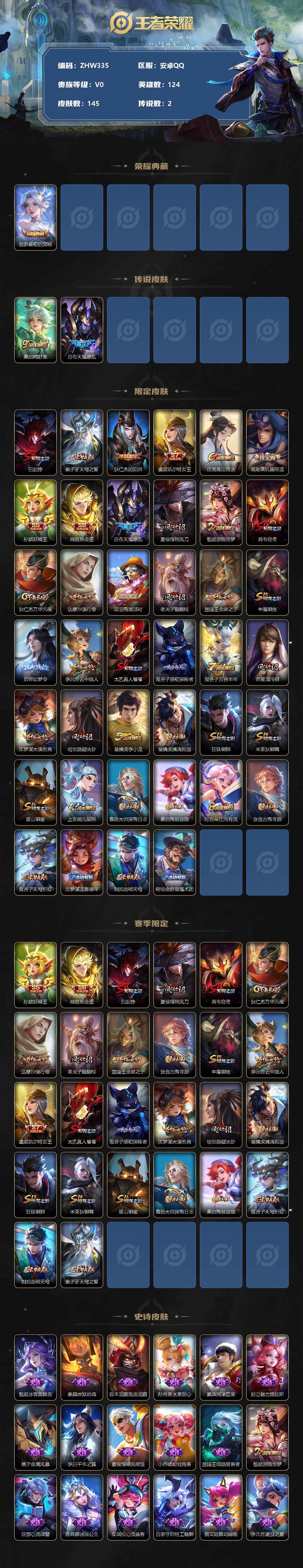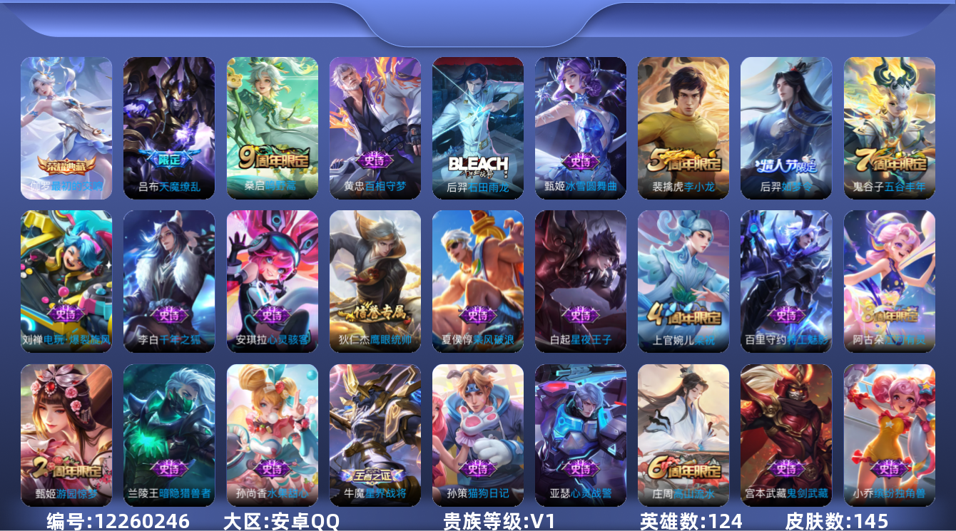 [12260246]【商品标题】:安卓Q-V0-至尊星耀IV段位-124英雄-145皮肤-1典藏-0珍品无双-0无双-0珍品传说-2传说-32史诗