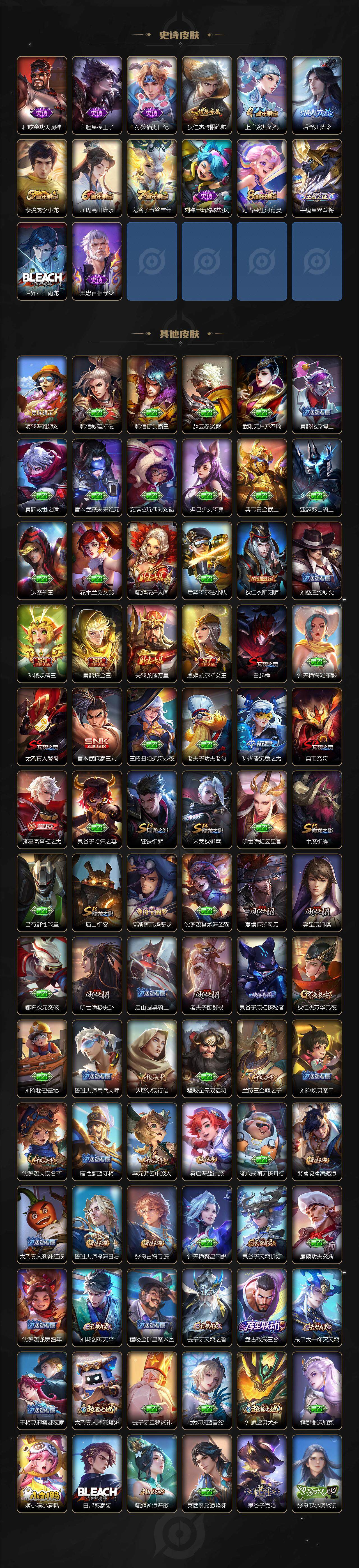 【限定皮肤】:白起狰,姜子牙天穹之誓,狄仁杰阴阳师,虞姬凯尔特女王,庄周高山流水,高渐离玩趣恶龙,孙膑妖精王,扁鹊炼金王,吕布天魔缭乱,夏侯惇朔风刀,甄姬游园惊梦,典韦穷奇,狄仁杰万华元夜,达摩沙漠行僧,项羽海滩派对,老夫子醍醐杖,兰陵王金庭之子,牛魔御旌,后羿如梦令,李元芳云中旅人,太乙真人饕餮,鬼谷子原初探秘者,鬼谷子五谷丰年,弈星混沌棋,沈梦溪大漠名商,明世隐疑决卦,裴擒虎李小龙,裴擒虎擒涛扼浪,狂铁御狮,米莱狄御霄,盾山御銮,上官婉儿梁祝,鲁班大师探海日志,桑启海盐诗旅,阿古朵江河有灵,张良古海寻踪,鬼谷子天穹祈灯,沈梦溪龙舞盛年,刘邦剑破天穹,程咬金群星魔术团