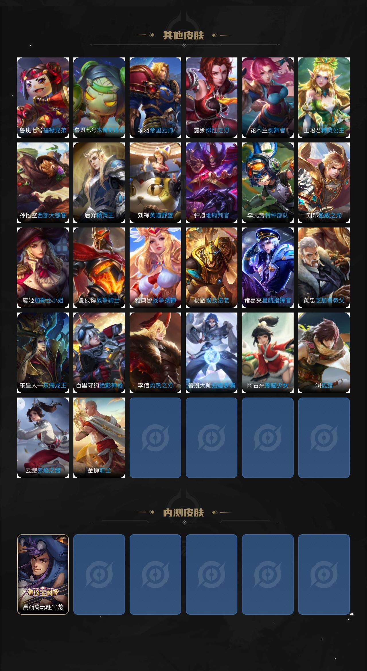 孙膑妖精王,扁鹊炼金王,虞姬凯尔特女王,白起狰,太乙真人饕餮,典韦穷奇,狂铁御狮,米莱狄御霄,牛魔御旌,盾山御銮,夏侯惇朔风刀,明世隐疑决卦,老夫子醍醐杖,鬼谷子原初探秘者,狄仁杰万华元夜,弈星混沌棋,达摩沙漠行僧,兰陵王金庭之子,沈梦溪大漠名商,李元芳云中旅人,桑启海盐诗旅,裴擒虎擒涛扼浪,鲁班大师探海日志,张良古海寻踪