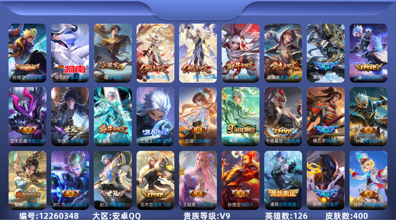 [12260348]V9 1典藏 1珍品传说 26传说 126英雄 400皮肤 典藏英雄武则天 可修改实名 优质装备:全息碎影(猴子典藏),怪盗基德,冠军飞将,久胜战神,一念神魔,地狱火,地狱之眼,音你心动-周瑜,李逍遥,乞巧织情,淬星耀世,超时空战士-狄仁杰,遇见胡旋,末日机甲-孙策,小动物乐团,澜逐花归海,涂山容容 传说皮:幻光神枪 珍宝阁皮:万物之道,女武神,玩趣恶龙 限定皮:愿照·九州拓(澜年限),愿照·山河定(司空震年限),逐霄战戟,鸣野蒿,夏侯惇霜北刀,魔法小厨娘,白晶晶,时雨天司(水龙头),高山流水,五谷丰年,梁祝,天狼溯光者,奔雷神使(牛魔年限),祈雪灵祝(雪兔子),李小龙,朱雀志(守约年限),霸王别姬-虞姬,默契交锋-兰陵王,孙行者,大圣娶亲,乒乒小将,蜜橘之夏,匿光追影者,女儿国国王,寅虎·心曲(虎婆),寅虎·赤拳(老虎年限),无尽星芒,枫霜尽,梦圆繁星,山海·玄木吟(马可年限) 史诗皮:鸭鸭历险记-刘禅,化蝶舞,灵蛊蚀心,龙之律动,雪豹·霜爪,怒海争锋,破空之剑,蒙犽顽岩魄,埋骨钱,芈月浮光幕影,海诺心动手记,琥珀纪元伽罗,夜落电台,决胜骁骑,上官婉儿群星魔术团,蔬乡物语(鲁班七号),百相守梦-百里守约,百相守梦-黄忠,紫霞仙子,苍穹之光,电玩小子(小书包),白龙吟,黄金分割率,特工魅影,千年之狐,匿光侦查者,末日机甲-莱西奥,魅语,百解令(蒙犽),高渐离燃音魔法,蒙恬荣光圣徽,无限星赏官,冰冠公主,青蛇,偶像歌手,白蛇,晚萤,电玩·爆裂旋风,暗夜猫娘,龙骑士(小龙虾),末日机甲-吕布,猫狗日记-孙策,猫狗日记-大乔,时之恋人-孙尚香,乱世虎臣,节奏热浪,修罗,女仆咖啡,摇滚巨星,水果甜心,绅士熊喵,天才门将,星夜王子,心灵骇客,时之奇旅-安琪拉,功夫厨神,德古拉伯爵,暗隐猎兽者,幽灵船长,鬼剑武藏,暗渊魔法,心灵战警,乐园奇幻夜,天秀·启明,舞动绿茵,地狱岩魂,诗语江南,纤云弄巧,拒霜思,缤纷独角兽,乘风破浪,逐浪之夏,月团寄思,水晶猎龙者,曙光守护者,热力回旋,箭羽风息,金属风暴,圣诞狂欢,圣诞恋歌,鹰眼统帅,暗夜贵公子,魅力维加斯,黎明之约,天秀·音浪,滕王阁序,无心,未来纪元-赵云