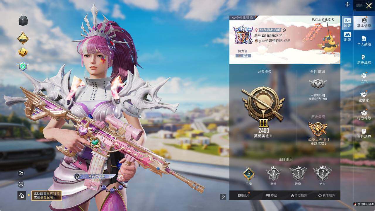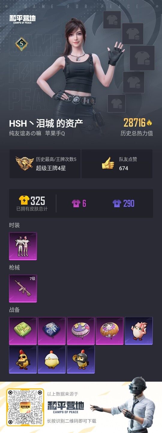 - [6700027]实名: 不可修改 时装数: 139 枪械数: 29 战备数: 31 热门装扮: 萨利娅 稀有枪皮: Kar98K-巳巳如意