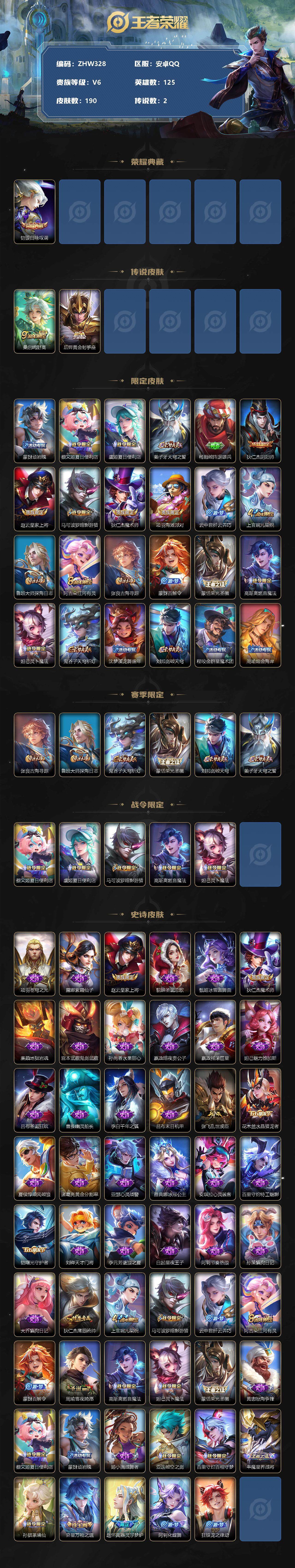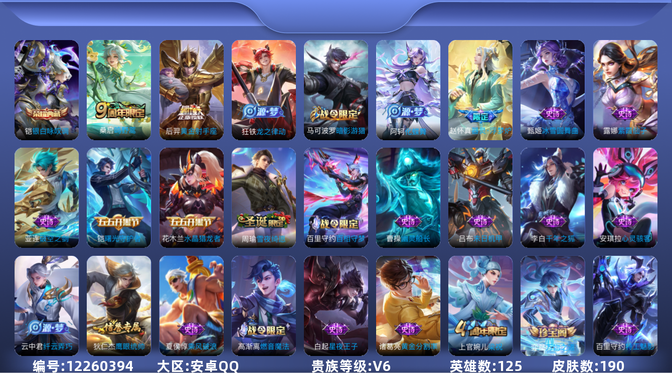 [12260394]【商品标题】:安卓Q-V6-至尊星耀II段位-125英雄-190皮肤-1典藏-0珍品无双-0无双-0珍品传说-2传说-52史诗