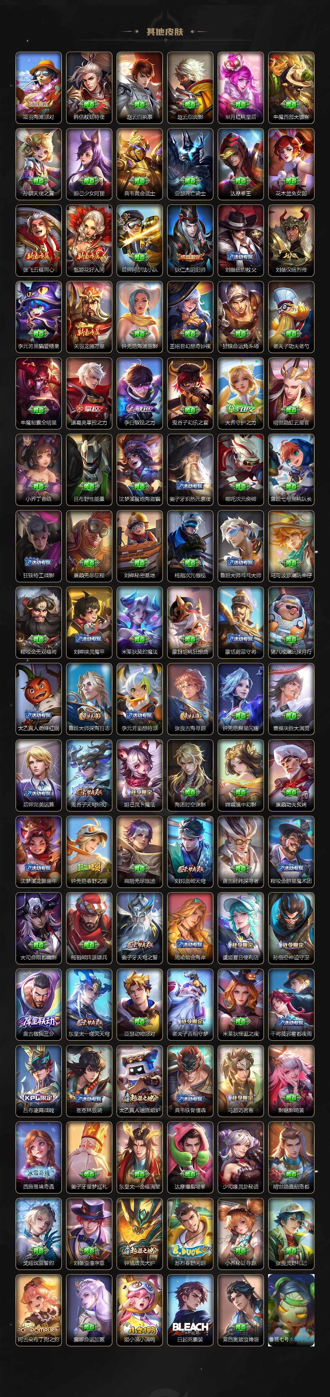 【其他皮肤】:项羽海滩派对,韩信教廷特使,赵云白执事,赵云忍炎影,芈月红桃皇后,牛魔西部大镖客,孙膑天使之翼,妲己少女阿狸,典韦黄金武士,亚瑟死亡骑士,达摩拳王,花木兰兔女郎,张飞五福同心,甄姬花好人间,后羿阿尔法小队,狄仁杰阴阳师,刘备纽约教父,刘备汉昭烈帝,李元芳黑猫爱糖果,关羽龙腾万里,钟无艳海滩丽影,王昭君幻想奇妙夜,狂铁命运角斗场,老夫子功夫老勺,牛魔制霸全明星,诸葛亮掌控之力,李白敏锐之力,鬼谷子幻乐