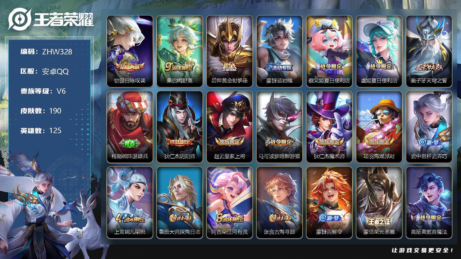 [12260394]【商品标题】:安卓Q-V6-至尊星耀II段位-125英雄-190皮肤-1典藏-0珍品无双-0无双-0珍品传说-2传说-52史诗 【荣耀典藏】:铠银白咏叹调 【传说皮肤】:桑启鸣野蒿,后羿黄金射手座 【限定皮肤】:蒙犽顽岩魄,蔡文姬夏日便利店,虞姬夏日便利店,姜子牙天穹之誓,杨戬破阵退雄兵,狄仁杰阴阳师,赵云皇家上将,马可波罗暗影游猎,狄仁杰魔术师,项羽海滩派对,云中君纤云弄巧,上官婉儿梁祝,鲁班大师探海日志,阿古朵江河有灵,张良古海寻踪,蒙犽百解令,蒙恬荣光圣徽,高渐离燃音魔法,妲己灵卜魔法,鬼谷子天穹祈灯,沈梦溪龙舞盛年,刘邦剑破天穹,程咬金群星魔术团,周瑜熔金海岸 【赛季限定】:张良古海寻踪,鲁班大师探海日志,鬼谷子天穹祈灯,蒙恬荣光圣徽,刘邦剑破天穹,姜子牙天穹之誓 【战令限定】:蔡文姬夏日便利店,虞姬夏日便利店,马可波罗暗影游猎,高渐离燃音魔法,妲己灵卜魔法 【史诗皮肤】:项羽苍穹之光,露娜紫霞仙子,赵云皇家上将,貂蝉圣诞恋歌,甄姬冰雪圆舞曲,狄仁杰魔术师,廉颇地狱岩魂,宫本武藏鬼剑武藏,孙尚香水果甜心,嬴政暗夜贵公子,嬴政摇滚巨星,妲己魅力维加斯,吕布圣诞狂欢,曹操幽灵船长,李白千年之狐,吕布末日机甲,张飞乱世虎臣,花木兰水晶猎龙者,夏侯惇乘风破浪,诸葛亮黄金分割率,亚瑟心灵战警,雅典娜冰冠公主,安琪拉心灵骇客,百里守约特工魅影,铠曙光守护者,刘禅天才门将,李元芳逐浪之夏,白起星夜王子,阿轲节奏热浪,孙策猫狗日记,大乔猫狗日记,狄仁杰鹰眼统帅,上官婉儿梁祝,马可波罗暗影游猎,云中君纤云弄巧,阿古朵江河有灵,蒙犽百解令,周瑜雪夜绮愿,妲己灵卜魔法,高渐离燃音魔法,蒙恬荣光圣徽,黄忠怒海争锋,蔡文姬夏日便利店,蒙犽顽岩魄,姬小满战舞者,亚连破空之剑,百里守约百相守梦,牛魔星界战将,孙膑茶境仙,弈星万物之道,赵怀真器灵浮梦炉,阿轲化蝶舞,狂铁龙之律动 【其他皮肤】:项羽海滩派对,韩信教廷特使,赵云白执事,赵云忍炎影,芈月红桃皇后,牛魔西部大镖客,孙膑天使之翼,妲己少女阿狸,典韦黄金武士,亚瑟死亡骑士,达摩拳王,花木兰兔女郎,张飞五福同心,甄姬花好人间,后羿阿尔法小队,狄仁杰阴阳师,刘备纽约教父,刘备汉昭烈帝,李元芳黑猫爱糖果,关羽龙腾万里,钟无艳海滩丽影,王昭君幻想奇妙夜,狂铁命运角斗场,老夫子功夫老勺,牛魔制霸全明星,诸葛亮掌控之力,李白敏锐之力,鬼谷子幻乐