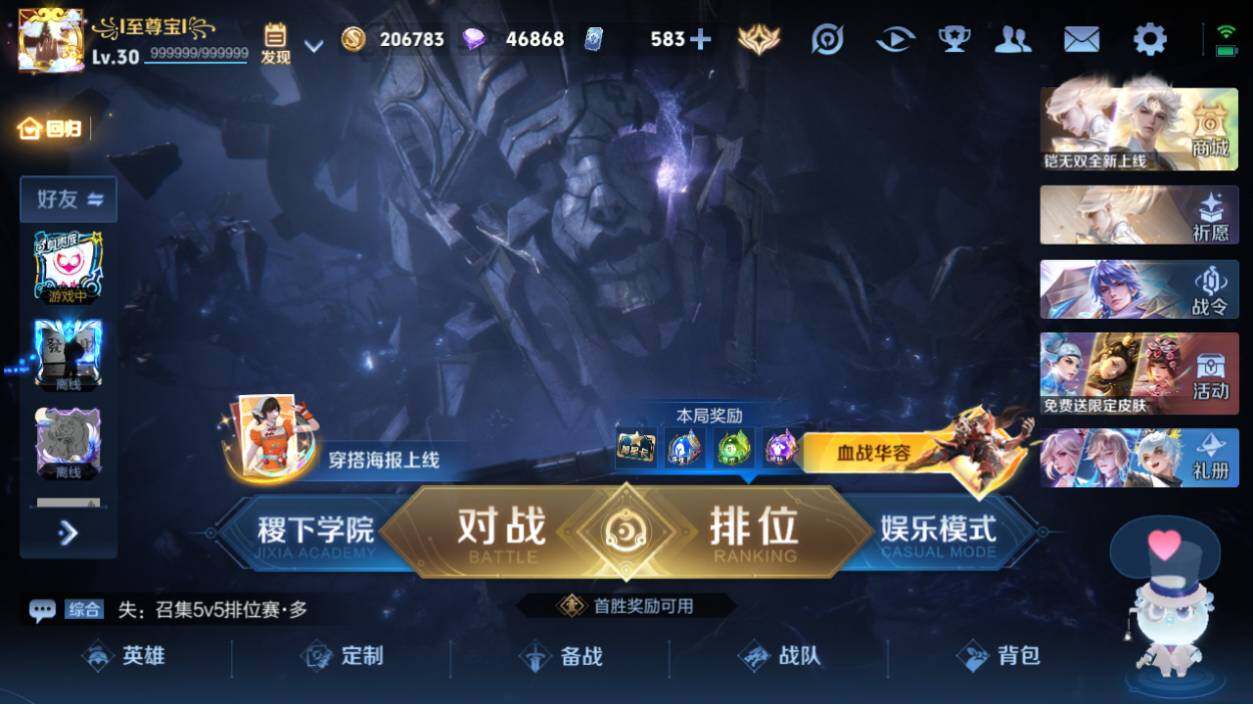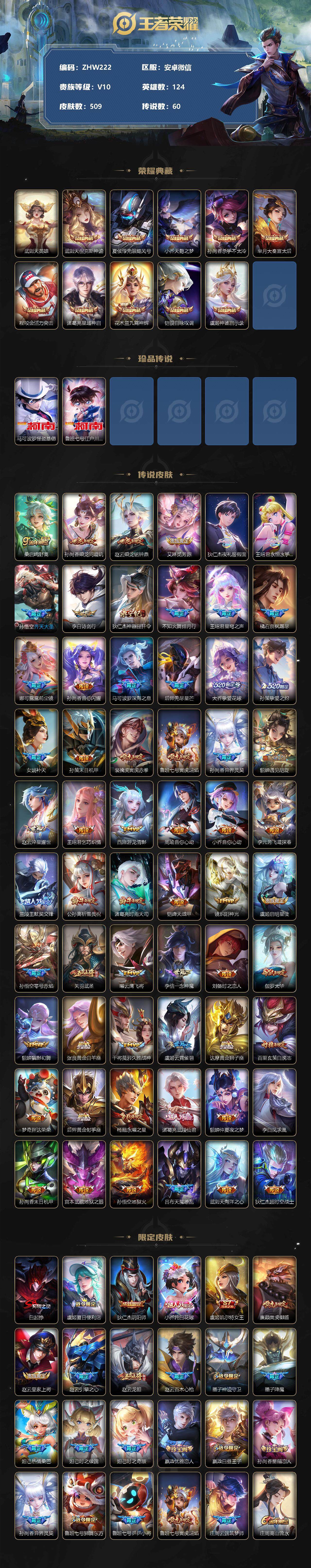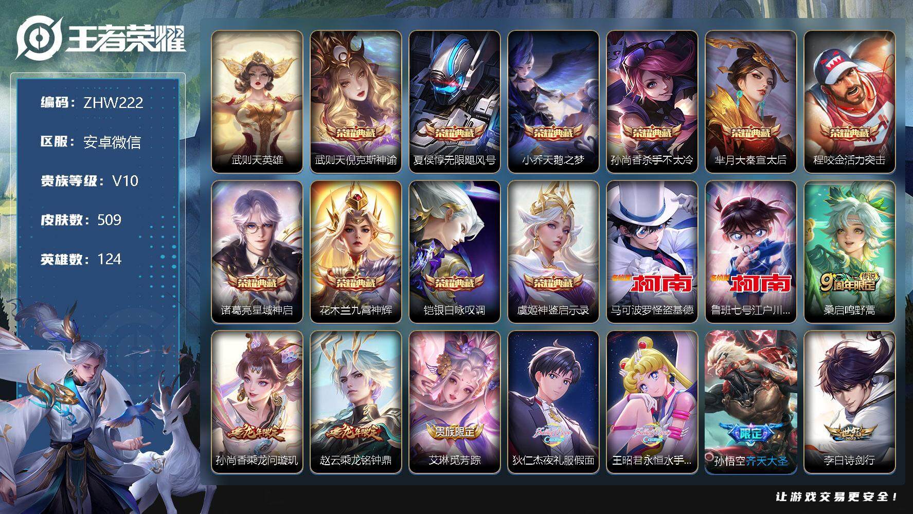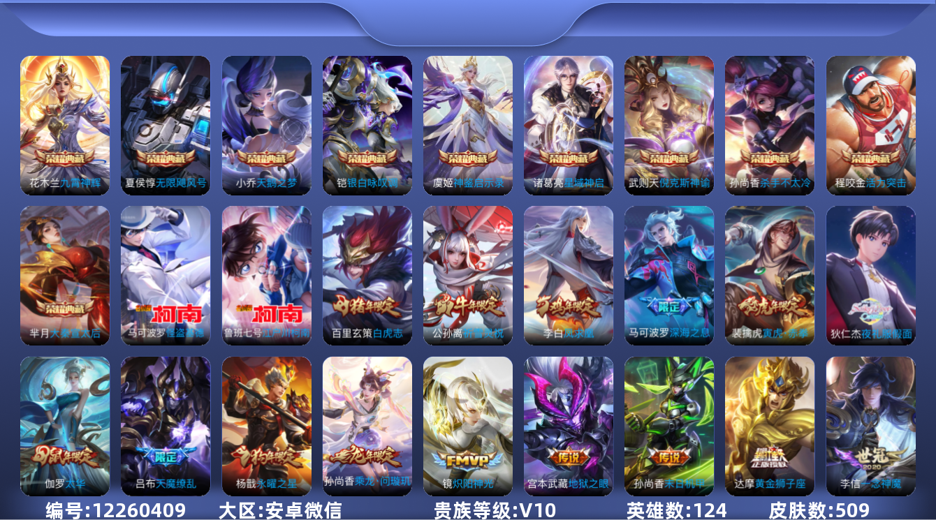 [12260409]【商品标题】:贵族10!游戏内带583点券!安卓WX-V10-荣耀黄金II段位-124英雄-509皮肤-10典藏-0珍品无双-0无双-2珍品传说-60传说-178史诗