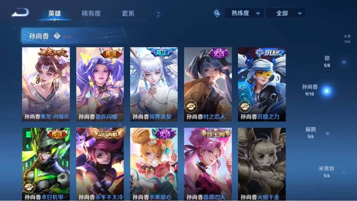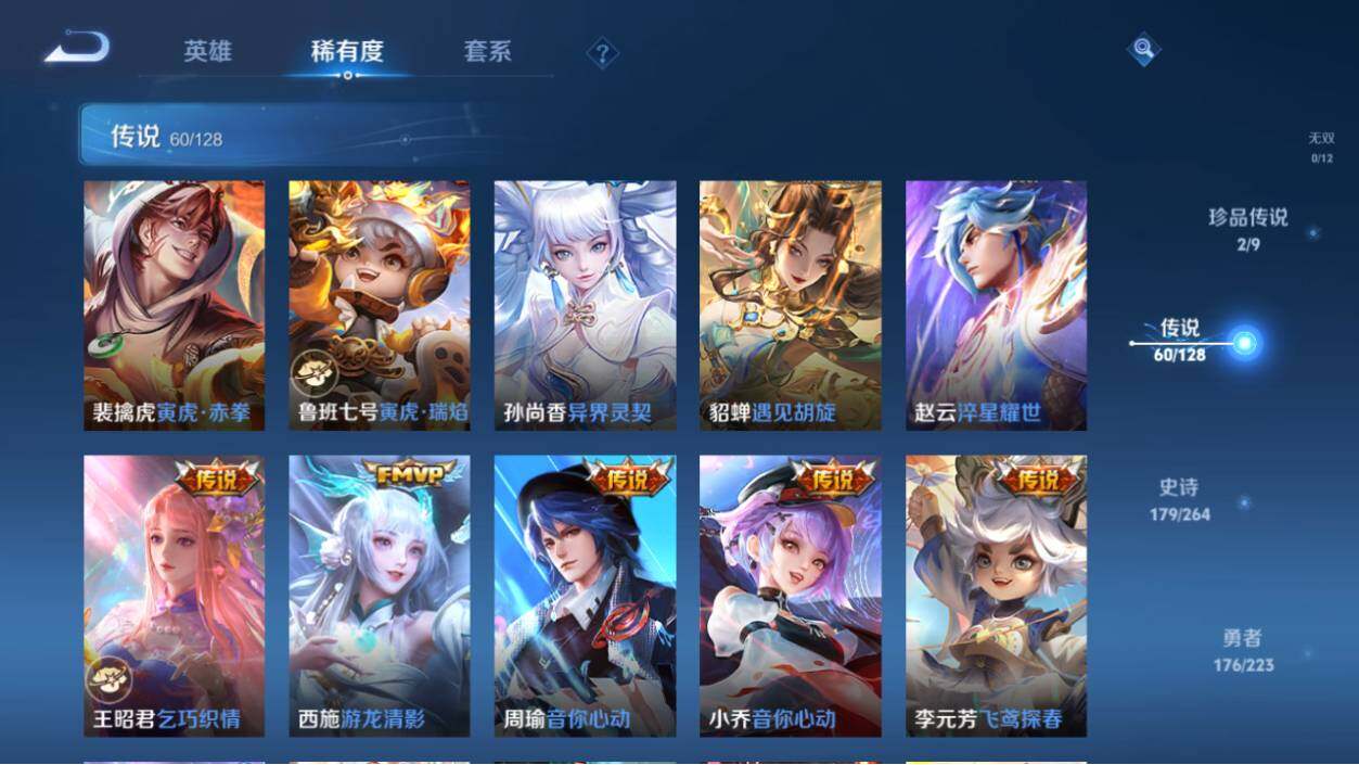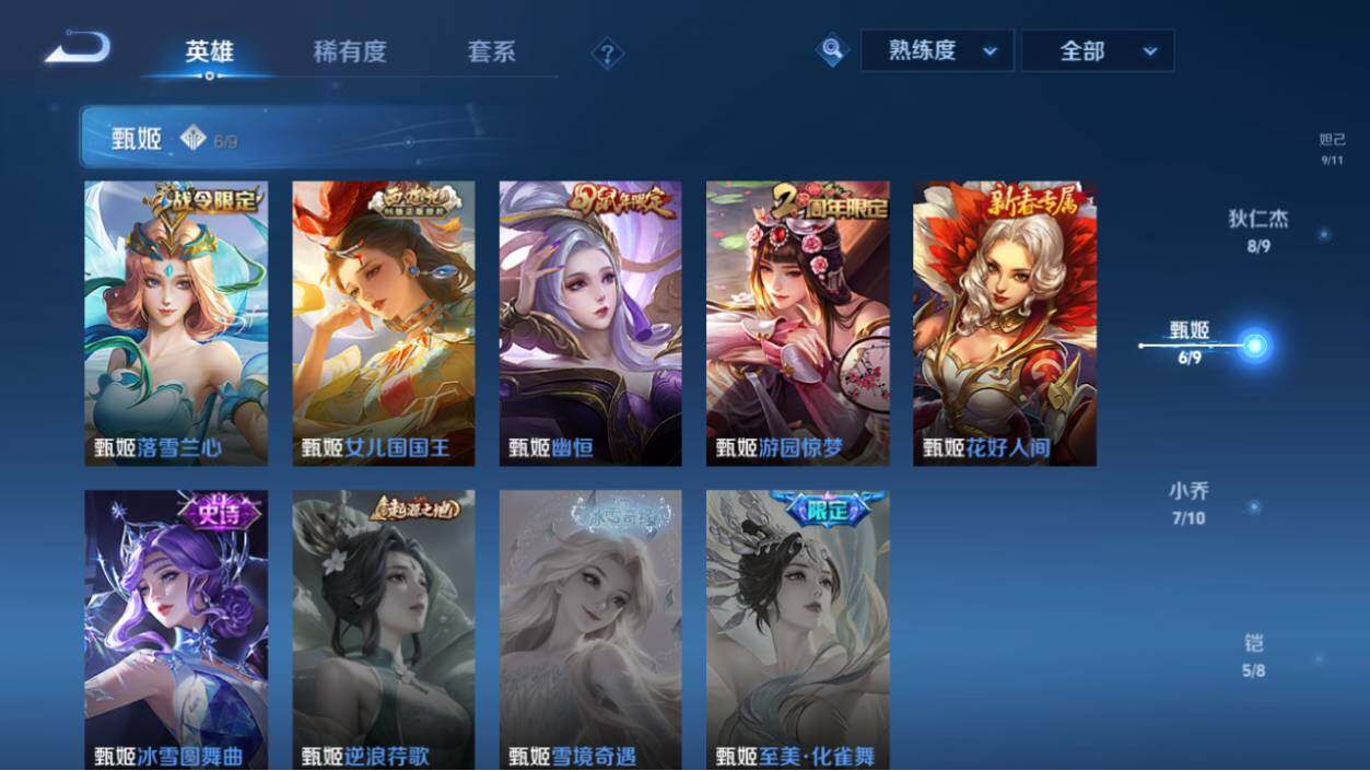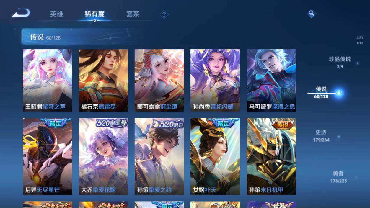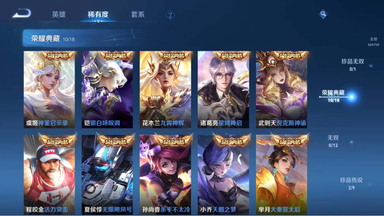 【荣耀典藏】:武则天英雄,武则天倪克斯神谕,夏侯惇无限飓风号,小乔天鹅之梦,孙尚香杀手不太冷,芈月大秦宣太后,程咬金活力突击,诸葛亮星域神启,花木兰九霄神辉,铠银白咏叹调,虞姬神鉴启示录
