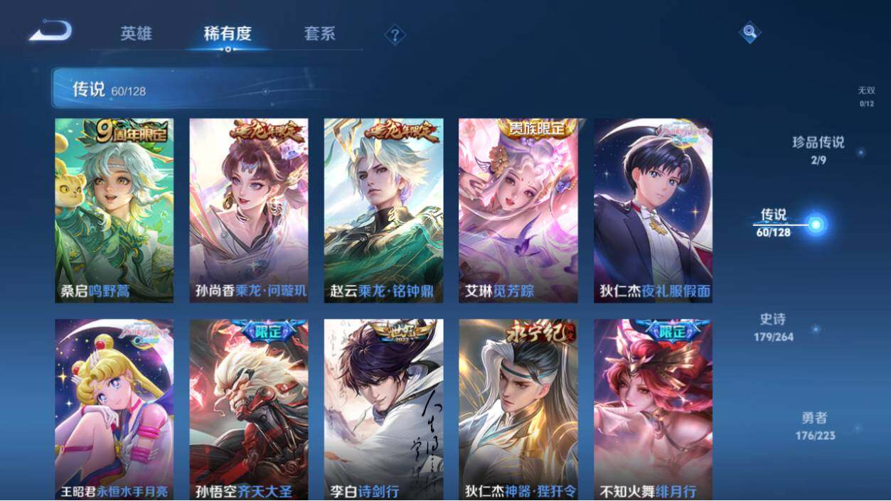 【传说皮肤】:桑启鸣野蒿,孙尚香乘龙问璇玑,赵云乘龙铭钟鼎,艾琳觅芳踪,狄仁杰夜礼服假面,王昭君永恒水手月亮,孙悟空齐天大圣,李白诗剑行,狄仁杰神器狴犴令,不知火舞绯月行,王昭君星穹之声,橘右京枫霜尽,娜可露露前尘镜,孙尚香音你闪耀,马可波罗深海之息,后羿无尽星芒,大乔挚爱花嫁,孙策挚爱之约,女娲补天,孙策末日机甲,裴擒虎寅虎赤拳,鲁班七号寅虎瑞焰,孙尚香异界灵契,貂蝉遇见胡旋,赵云淬星耀世,王昭君乞巧织情,西施游龙清影,周瑜音你心动,小乔音你心动,李元芳飞鸢探春,兰陵王默契交锋,公孙离祈雪灵祝,诸葛亮时雨天司,铠绛天战甲,镜炽阳神光,虞姬启明星使,孙悟空零号赤焰,关羽武圣,曜云鹰飞将,李信一念神魔,刘备时之恋人,伽罗太华,貂蝉猫影幻舞,张良黄金白羊座,干将莫邪久胜战神,虞姬云霓雀翎,达摩黄金狮子座,百里玄策白虎志,梦奇胖达荣荣,后羿黄金射手座,杨戬永曜之星,诸葛亮武陵仙君,貂蝉仲夏夜之梦,李白凤求凰,孙尚香末日机甲,宫本武藏地狱之眼,孙悟空地狱火,吕布天魔缭乱,武则天海洋之心,狄仁杰超时空战士