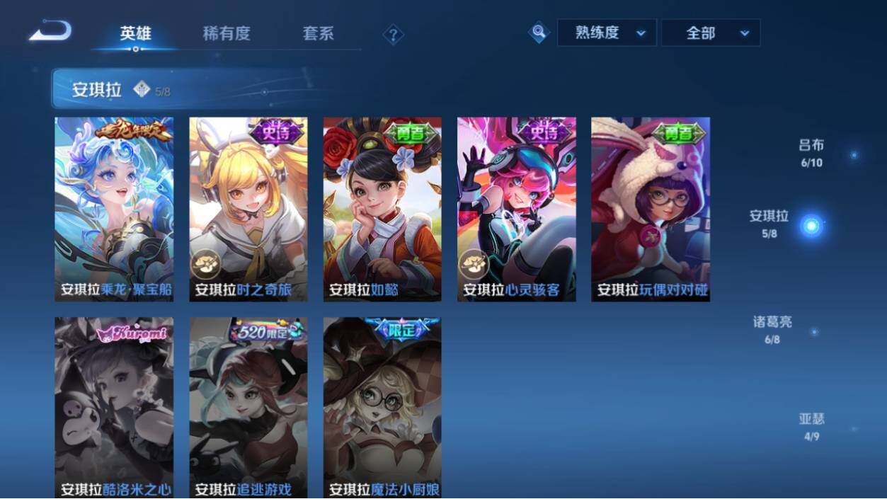 小乔青蛇,大乔白蛇,瑶遇见神鹿,娜可露露晚萤,伽罗箭羽风息,李元芳逐浪之夏,不知火舞魅语,公孙离无限星赏官,大乔猫狗日记,孙策猫狗日记,阿轲节奏热浪,露娜紫霞仙子,诸葛亮黄金分割率,王昭君偶像歌手,韩信白龙吟,项羽苍穹之光,孙尚香时之恋人,阿轲暗夜猫娘,雅典娜冰冠公主,吕布末日机甲,鲁班七号电玩小子,蒙犽龙鼓争鸣,橘右京修罗,墨子龙骑士,嬴政摇滚巨星,刘禅绅士熊喵,刘禅天才门将,白起星夜王子,安琪拉心灵骇客,安琪拉时之奇旅,程咬金功夫厨神,刘邦德古拉伯爵,兰陵王暗隐猎兽者,曹操幽灵船长,宫本武藏鬼剑武藏,司马懿暗渊魔法,亚瑟心灵战警,钟馗乐园奇幻夜,杨戬天秀·启明,蔡文姬舞动绿茵,廉颇地狱岩魂,西施诗语江南,小乔缤纷独角兽,夏侯惇乘风破浪,花木兰水晶猎龙者,铠曙光守护者,百里玄策热力回旋,墨子金属风暴,吕布圣诞狂欢,貂蝉圣诞恋歌,百里守约特工魅影,嬴政暗夜贵公子,嫦娥拒霜思,李白千年之狐,哪吒雪上飞焰,夏洛特永昼,澜赏金猎手,艾琳奇遇舞章,貂蝉唤灵魅影,高渐离天秀·音浪,张良千筹问战,庄周天秀·幻梦,弈星滕王阁序,刘禅电玩·爆裂旋风,海月浮梦罗烟,李元芳匿光侦查者,蒙犽百解令,周瑜雪夜绮愿,高渐离燃音魔法,安琪拉乘龙·聚宝船