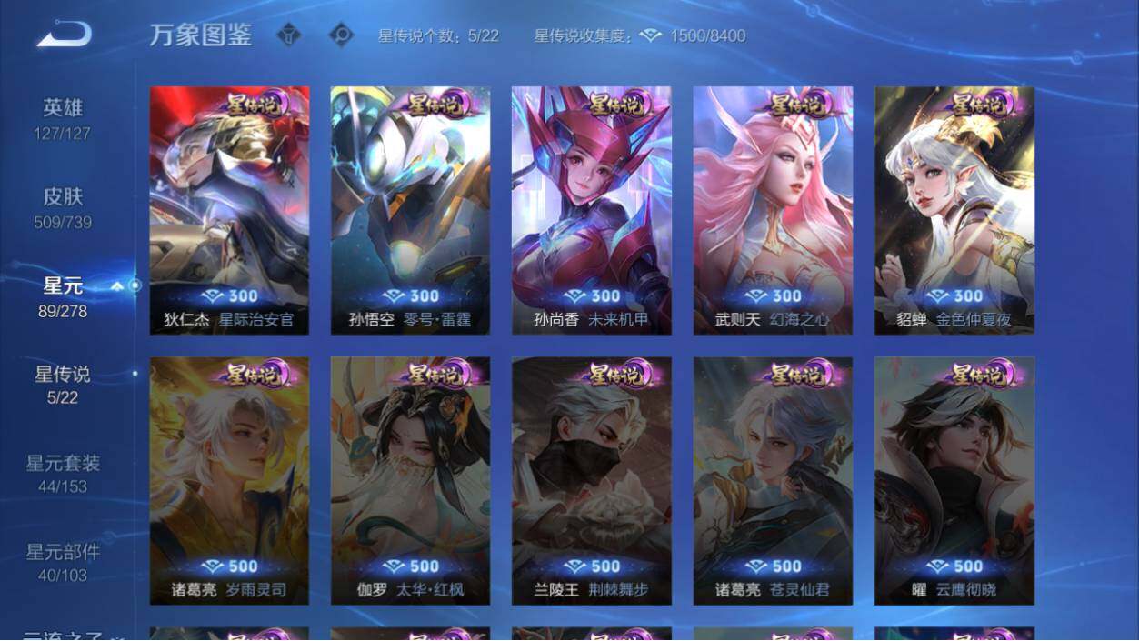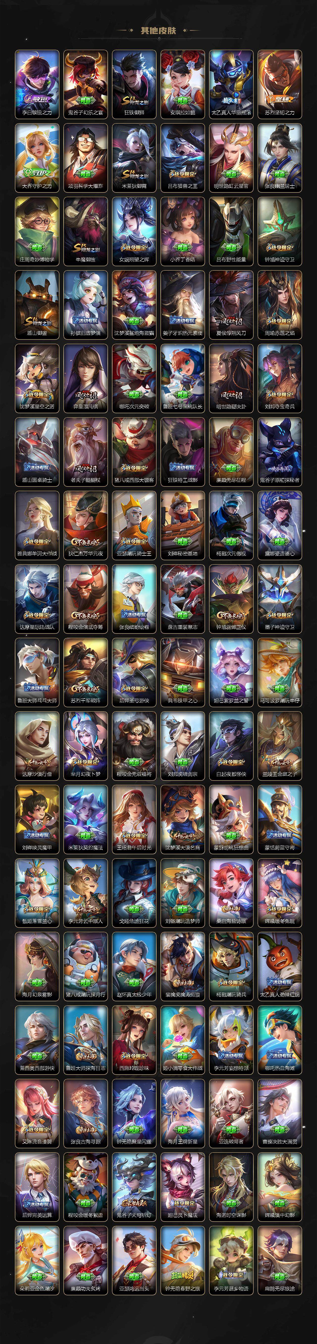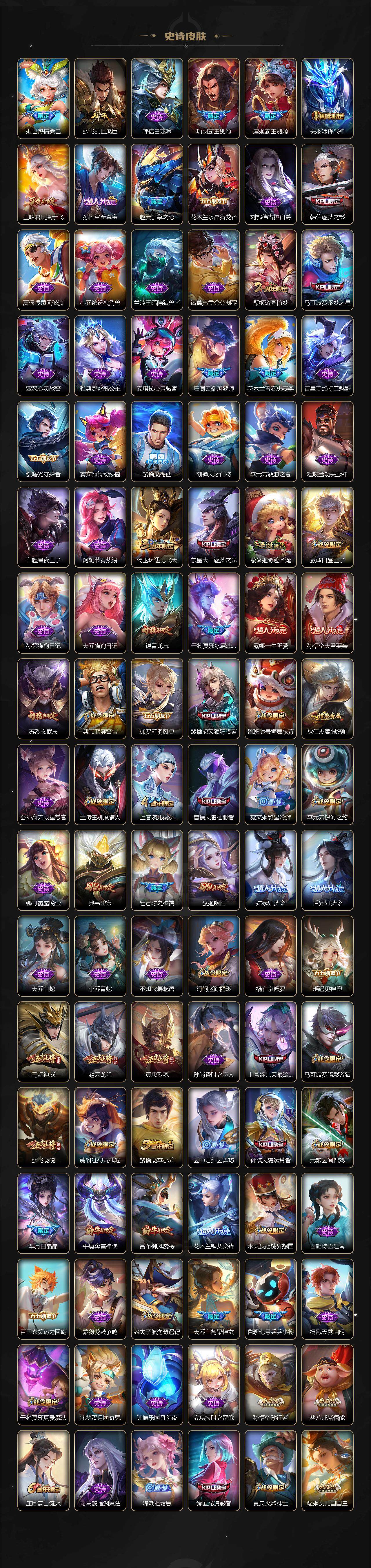 扁鹊炼金王,虞姬凯尔特女王,白起狰,太乙真人饕餮,曹操烛龙,芈月重明,典韦穷奇,狂铁御狮,米莱狄御霄,牛魔御旌,盾山御銮,夏侯惇朔风刀,明世隐疑决卦,老夫子醍醐杖,鬼谷子原初探秘者,狄仁杰万华元夜,程咬金演武夺筹,钟馗驱傩正仪,苏烈千军破阵,吕布猎兽之王,嬴政白昼王子,女娲朔望之晖,典韦蓝屏警告,钟馗神迹守卫,鲁班七号狮舞东方,沈梦溪星空之诺,李元芳银河之约,刘邦夺宝奇兵,马可波罗暗影游猎,蒙犽狂想玩偶喵,元歌云间偶戏,弈星混沌棋,达摩沙漠行僧,兰陵王金庭之子,沈梦溪大漠名商,李元芳云中旅人,桑启海盐诗旅,裴擒虎擒涛扼浪,鲁班大师探海日志,张良古海寻踪,项羽苍威无极,镜青焰无极